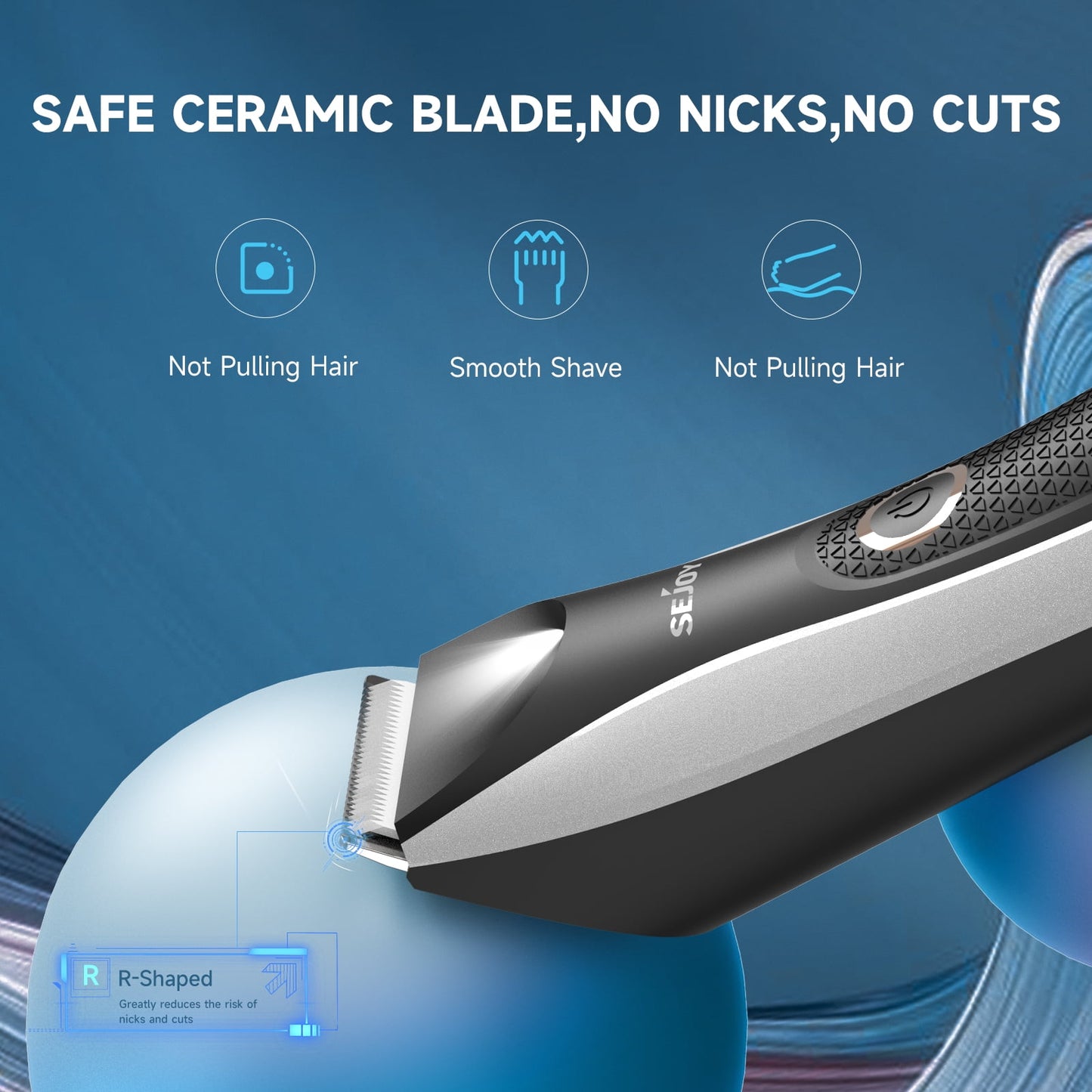 Sejoy Groin & Body Hair Trimmer for Men Women,Electric Bikini Ball Shaver Razor, Wet/Dry Use,Washable Ceramic Blade Pubic Hair Trimmer Clipper Body Groomer Kit With Recharge Dock