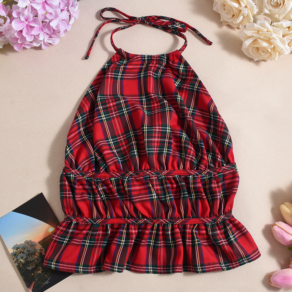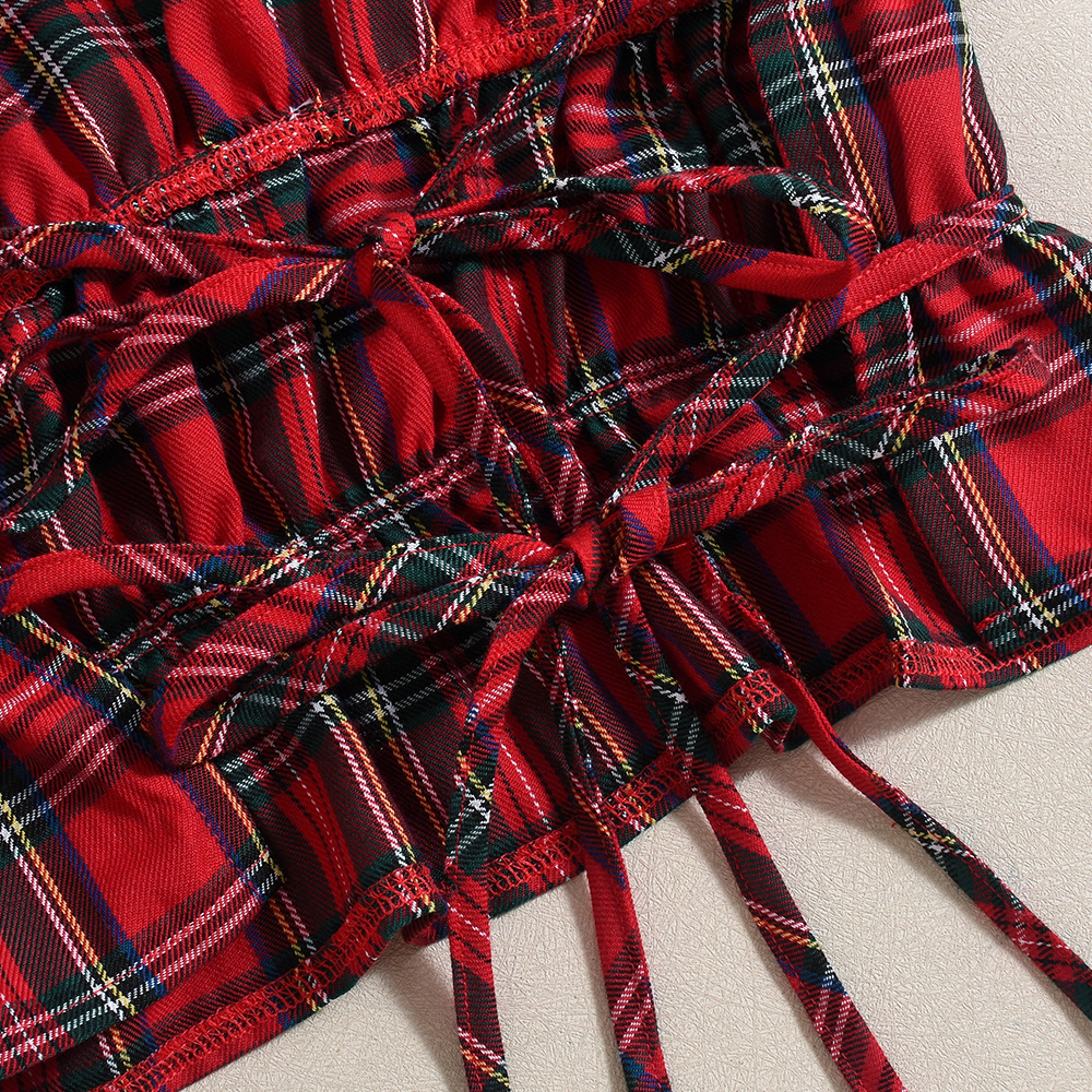 Sexy Cutout Lace up Backless Slim Fit Top Lotus Leaf Zipper Skirt Plaid Two Piece Sets Women