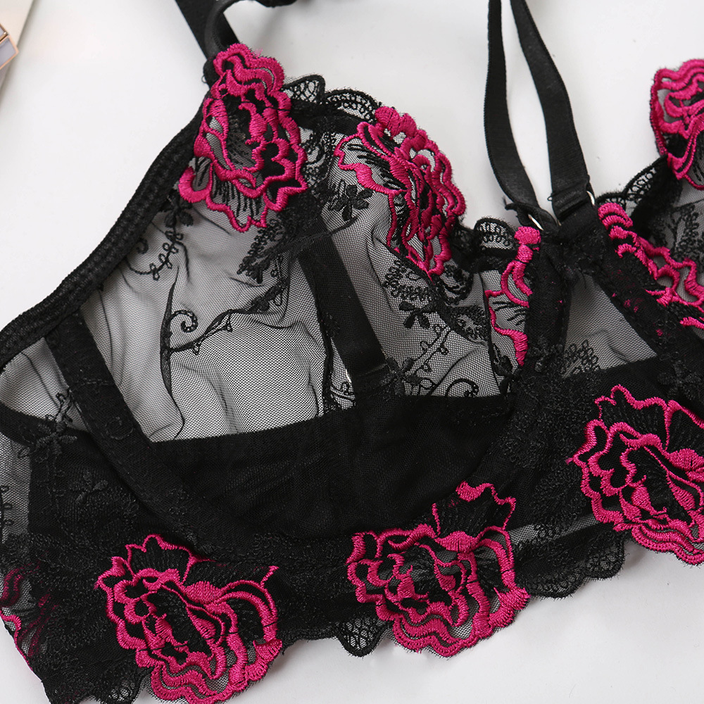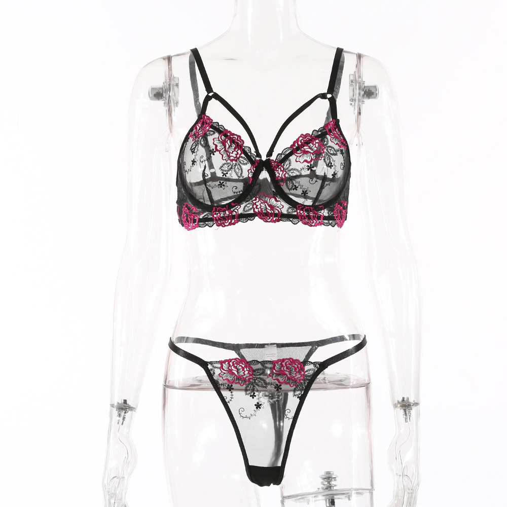 Sexy Floral Embroidery Transparent Black Mesh Sexy Suit