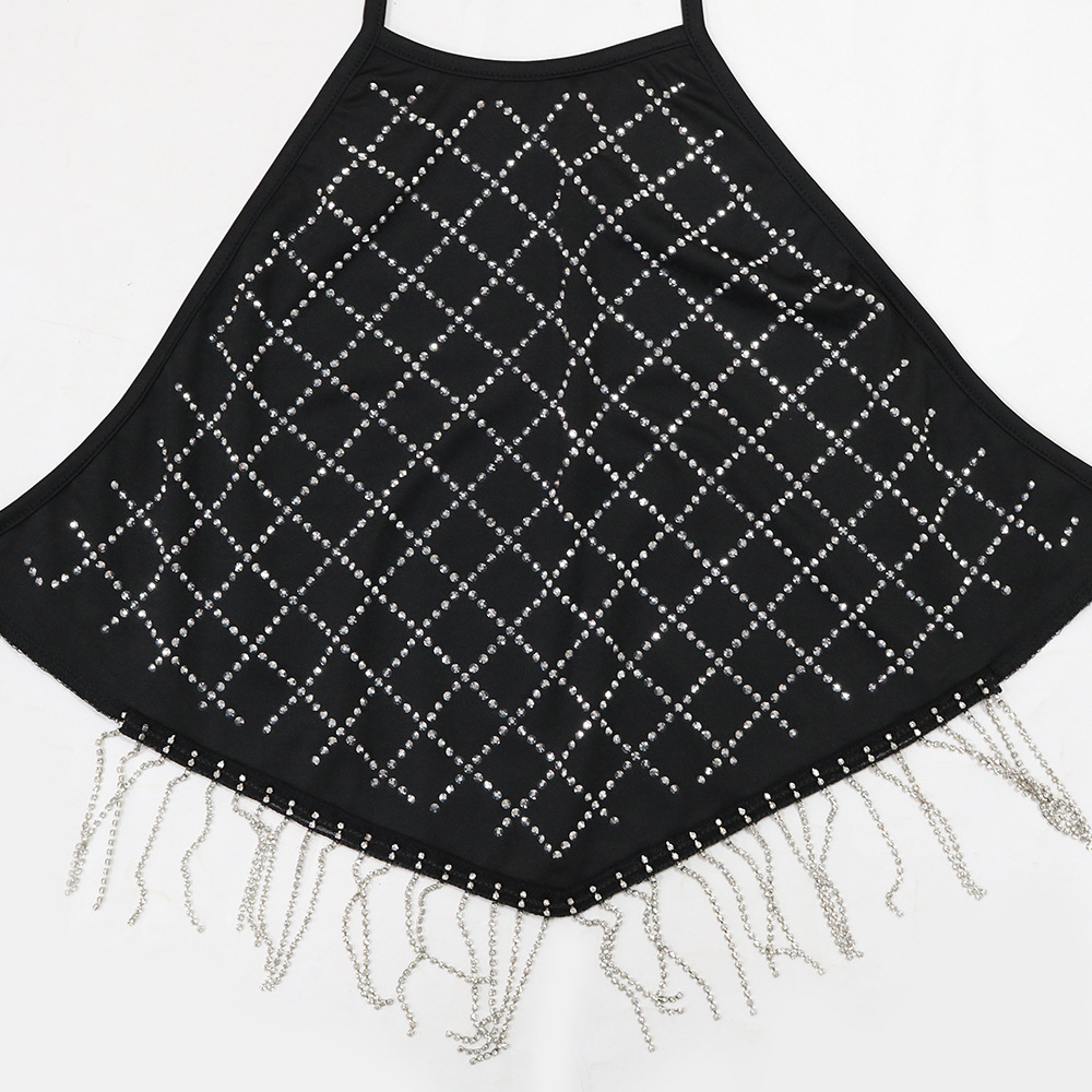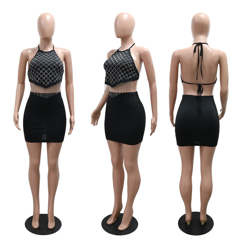 Sexy Lacing Short Rhinestone Stitching Tassel Top Hip Short Skirt Solid Color Two Piece Set