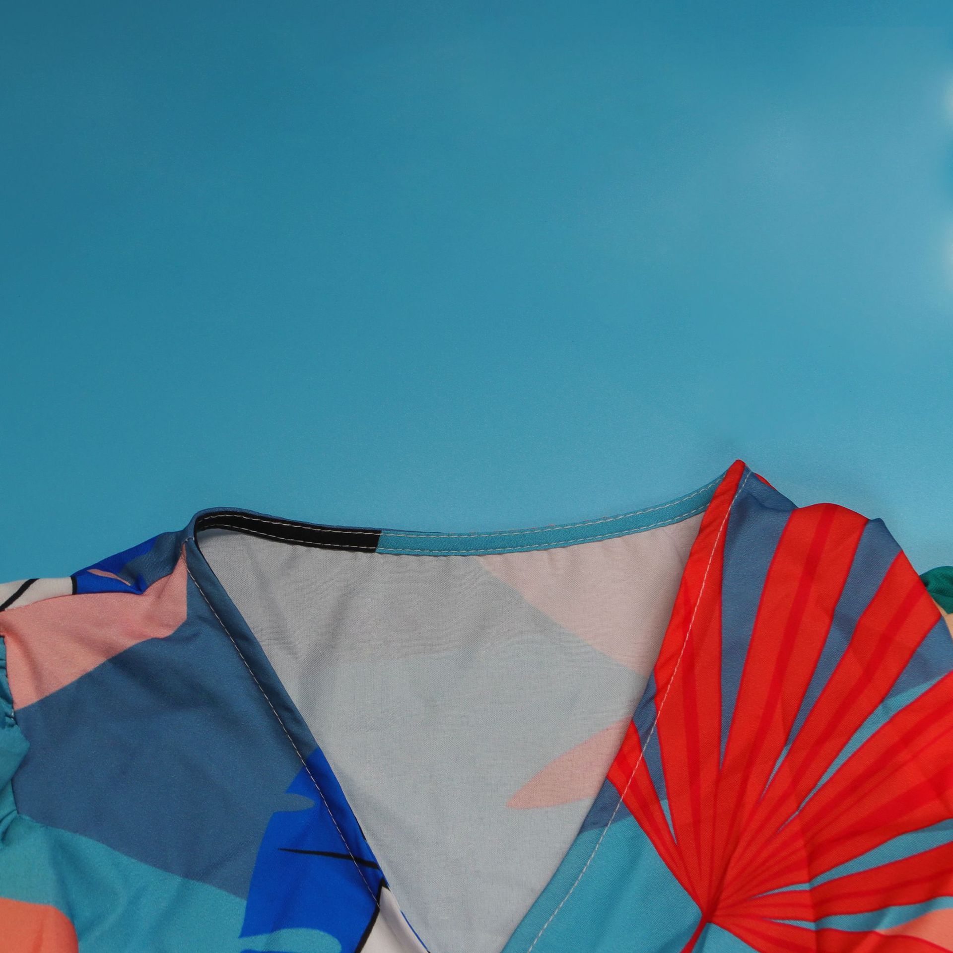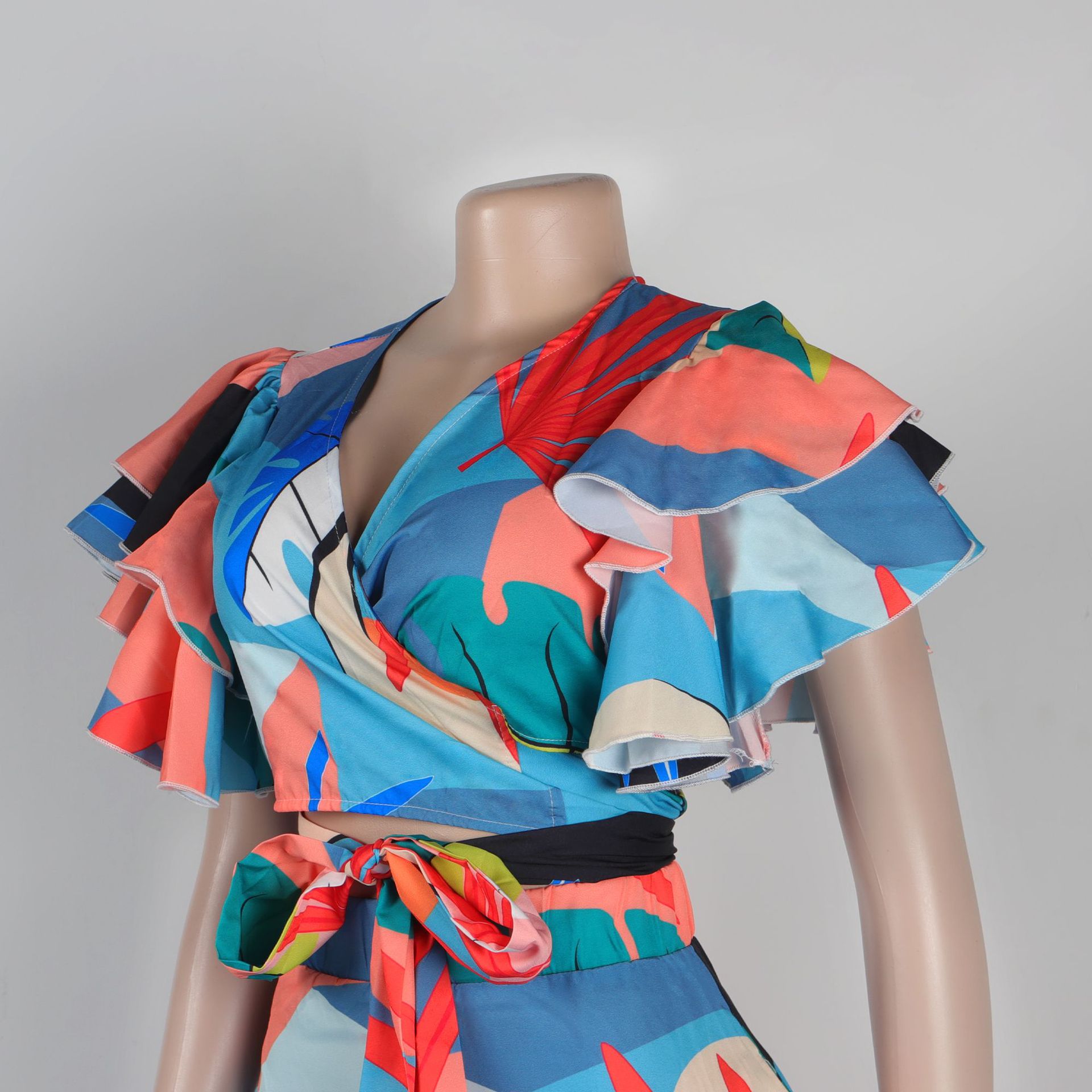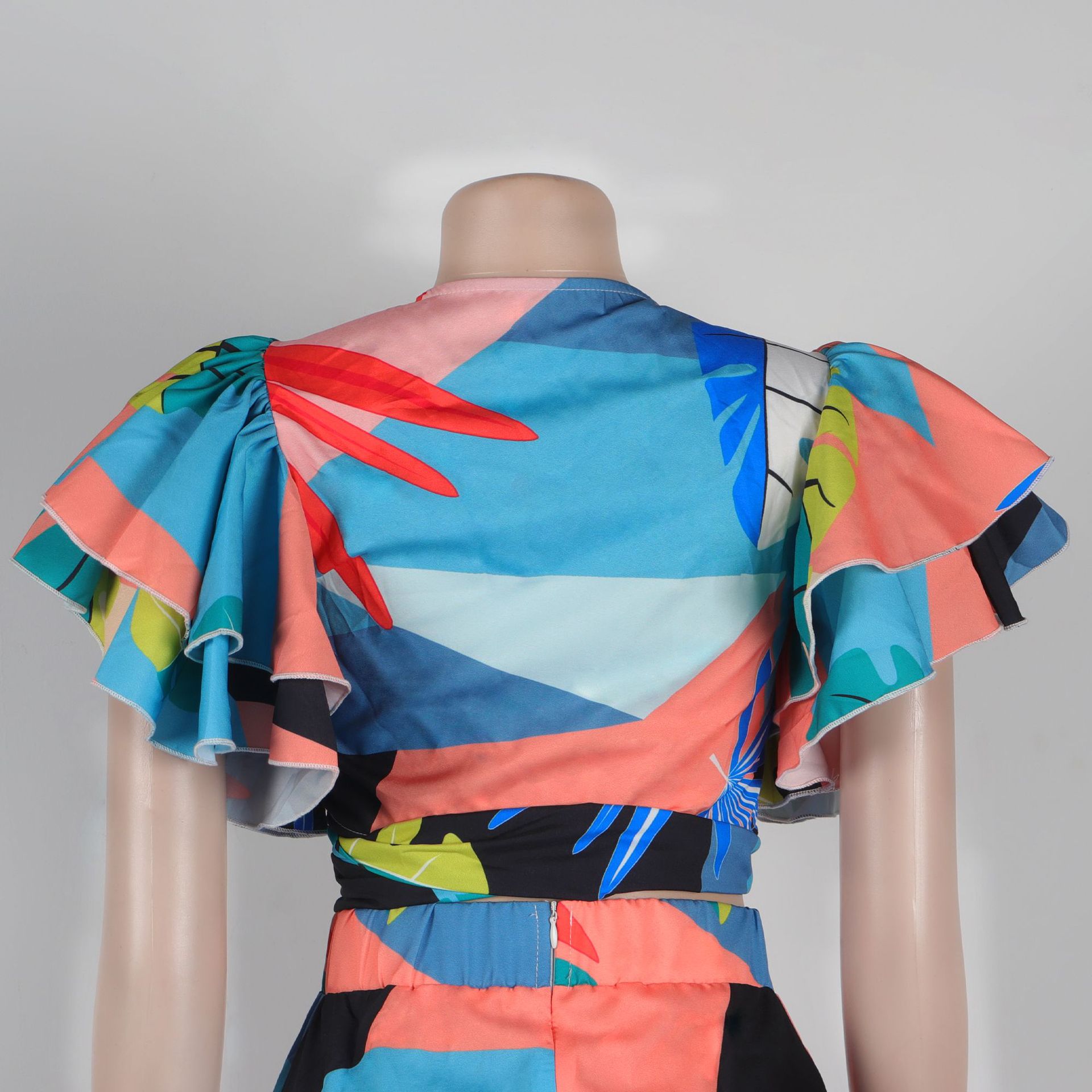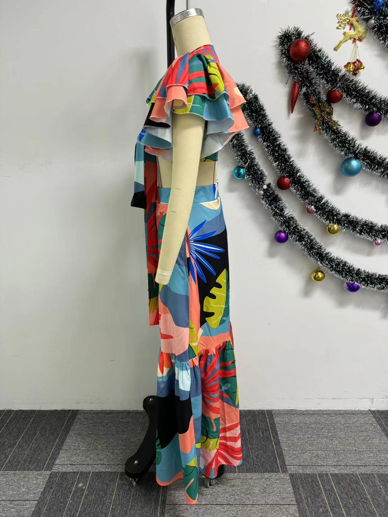 Sexy Printed Ruffled Strap Stitching Skirt Two Piece Set