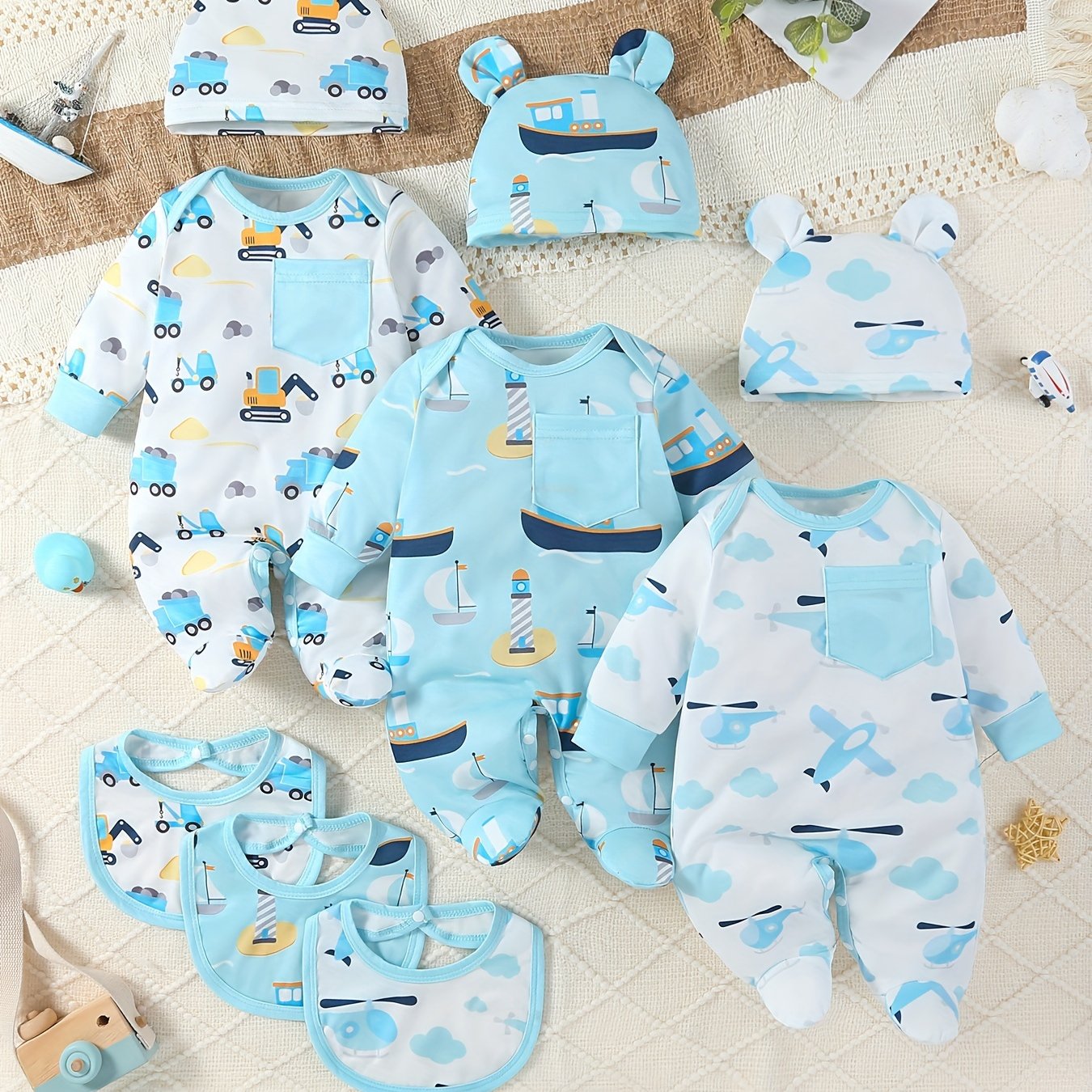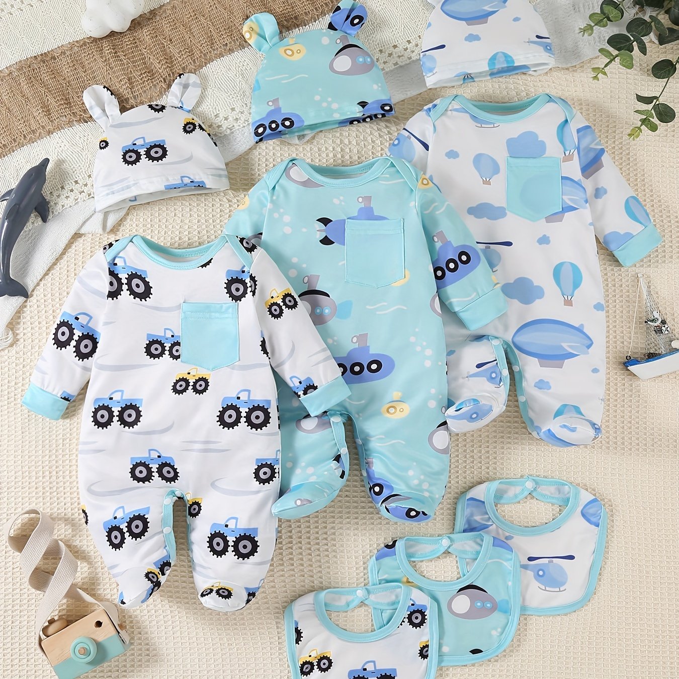 SHIXUANBAOBEI 9pcs Newborn Long Sleeve Wrap Bodysuit, All Printed Cartoon Airplanes, Boats, Cars, Excavators Patterns, Front Sticky Pockets Bottom Opening with Buttons Long Sleeve Wrap Bodysuit with Bunny Hat and Drooling Towel, Soft and Comfortable, Can