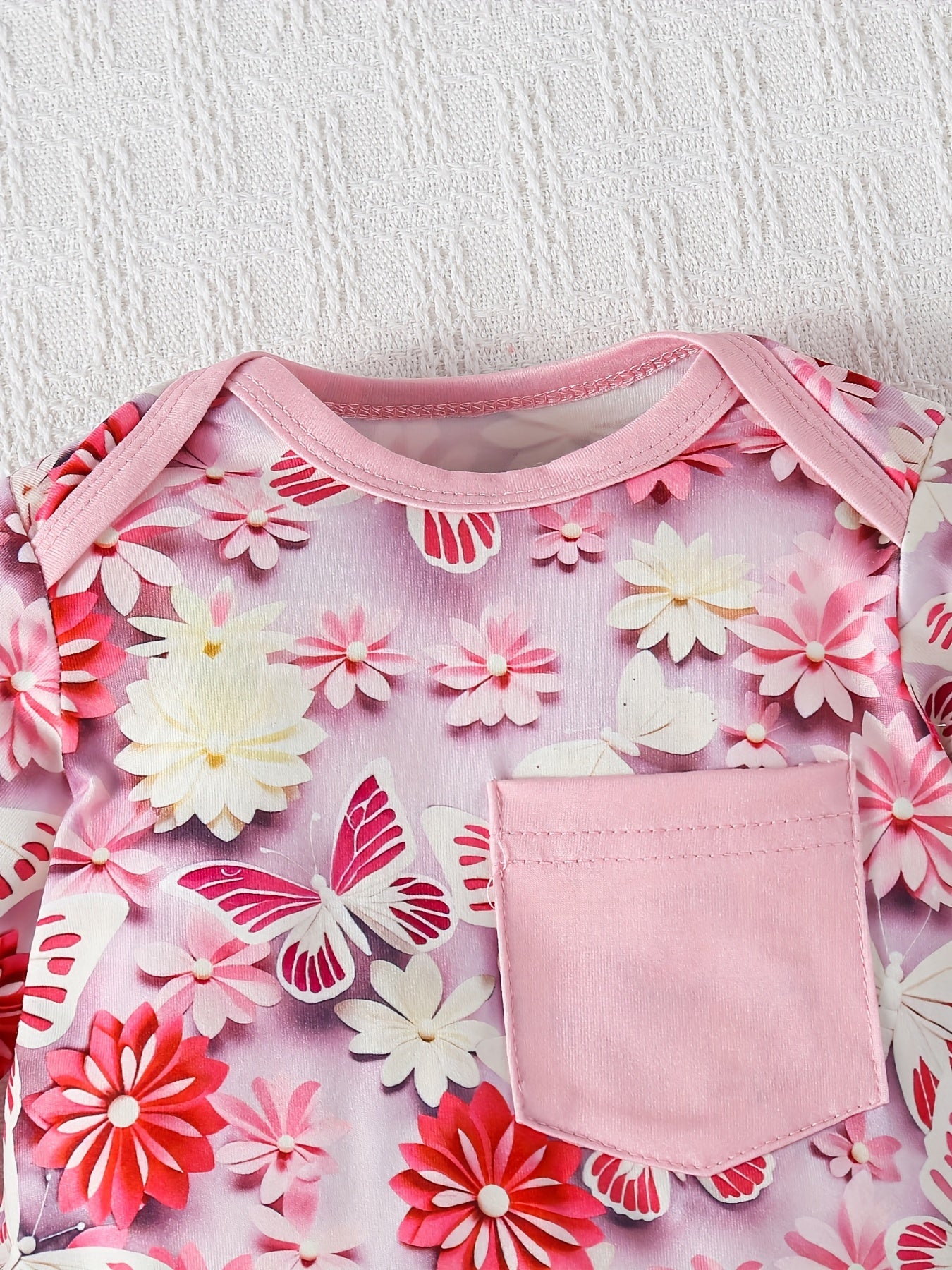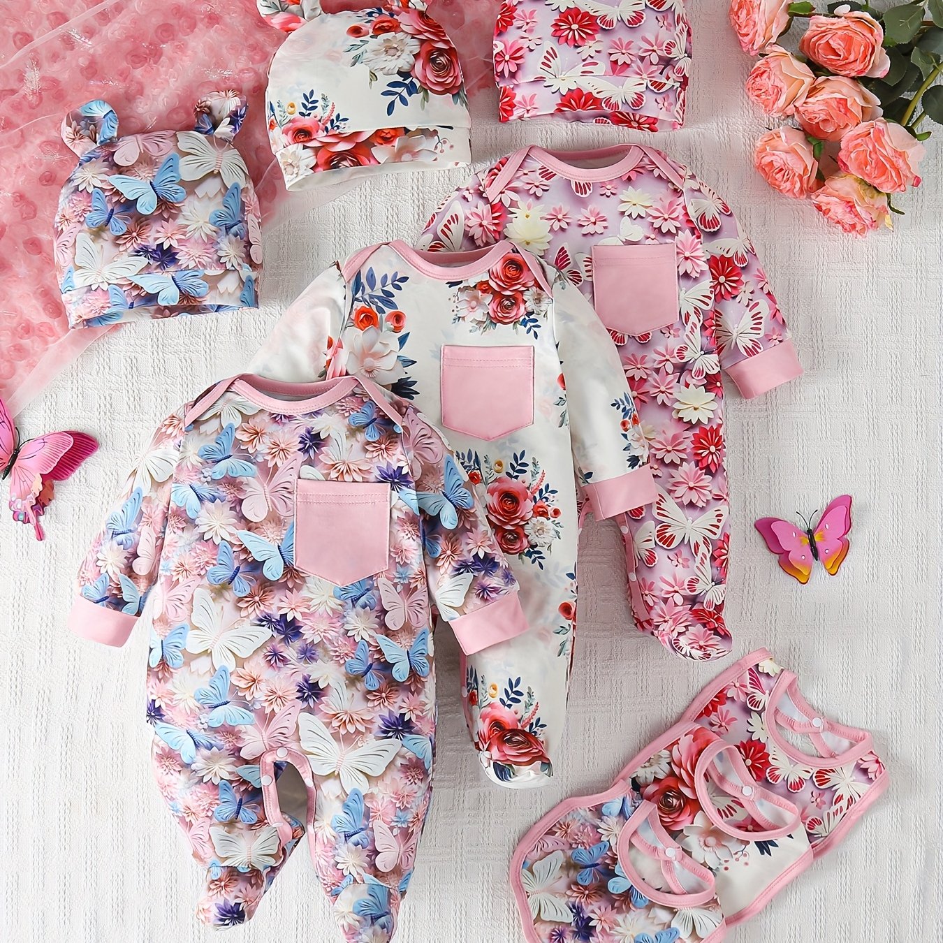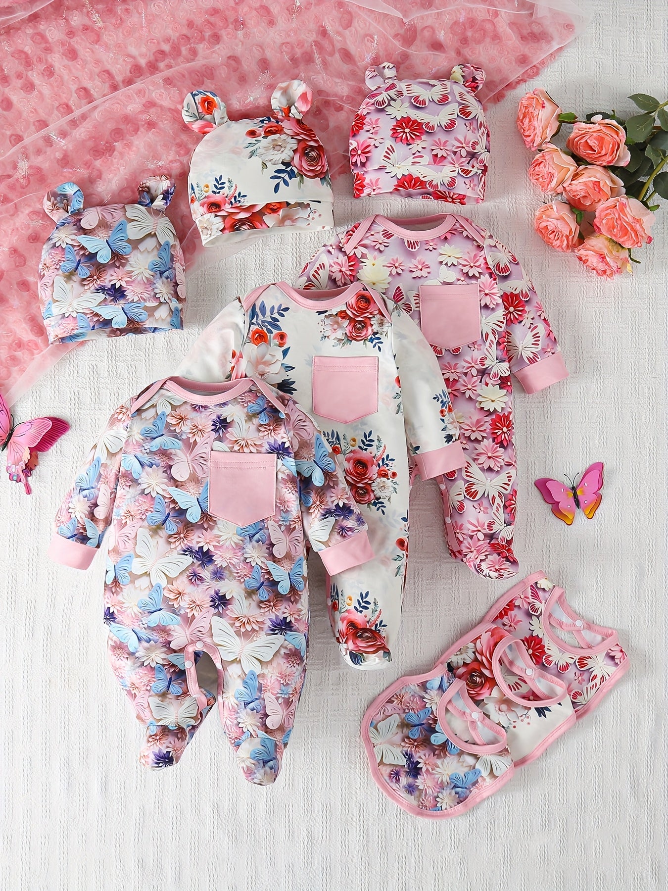 SHIXUANBAOBEI Newborn Infant 9pcs Long-Sleeve Footed Romper Set, Full-Print Embroidery Art with Floral and Butterfly Patterns, Front Center Pocket with Button Closure and Contrast Cuff Hem, Includes Bunny Hat and Bib, Soft and Comfortable Clothing, Essent