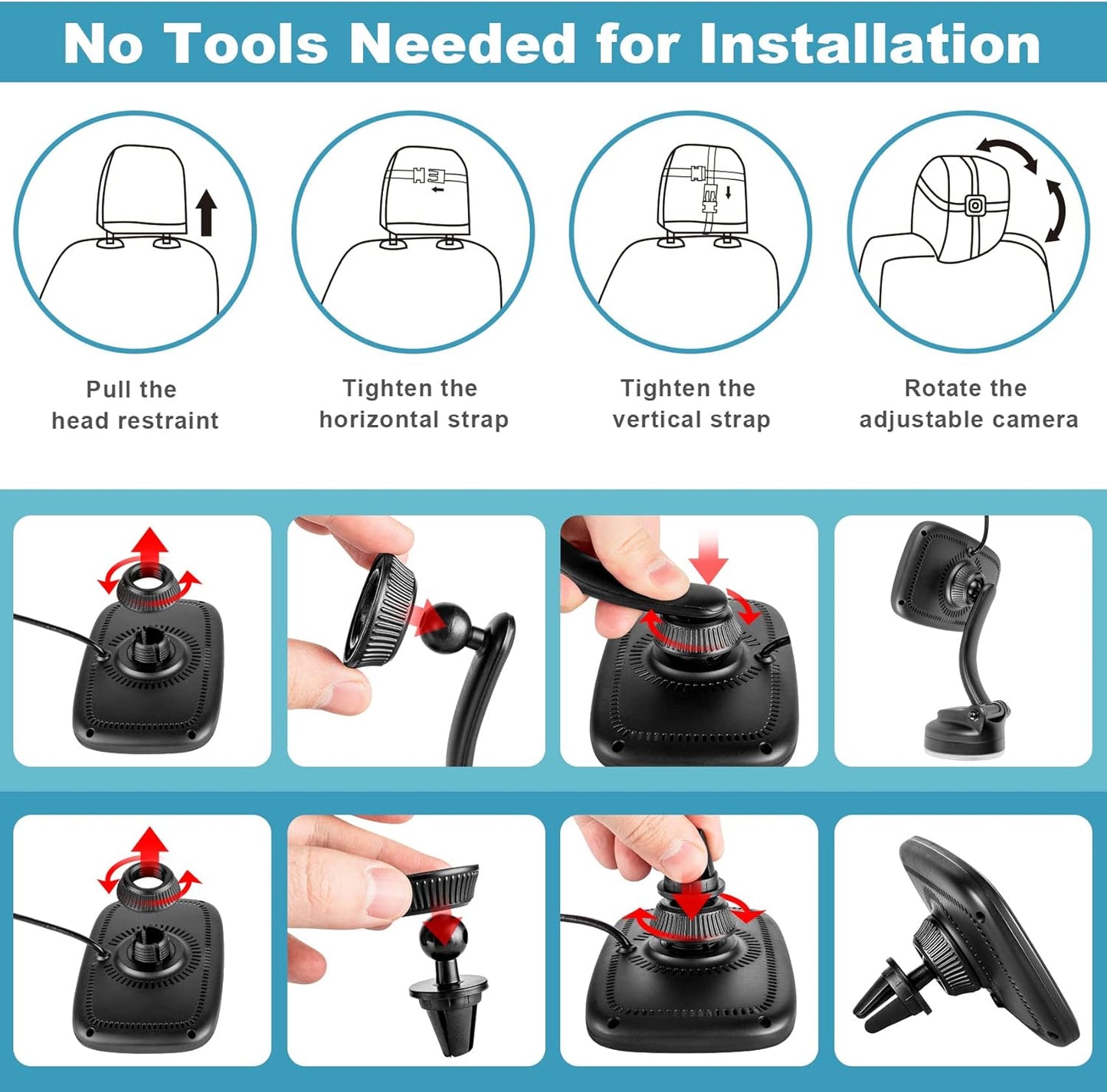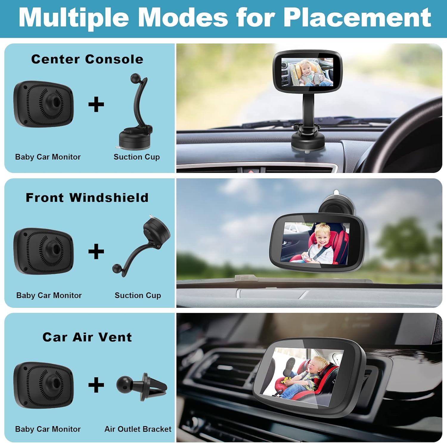 Multiple Placement: comes with the reusable suction cup mount which has strong suction that can provide excellent stability for the baby car monitor, even when you drive on uneven road the baby car monitor will not vibrate, shake or move around. With the air outlet bracket, you can place the monitor on the center console, windshield or air vent to check the status of your little baby according to your driving habits.