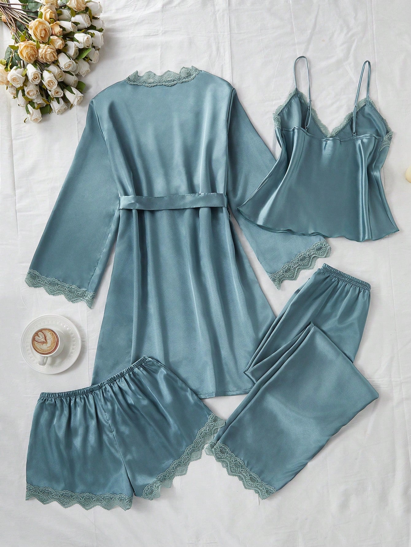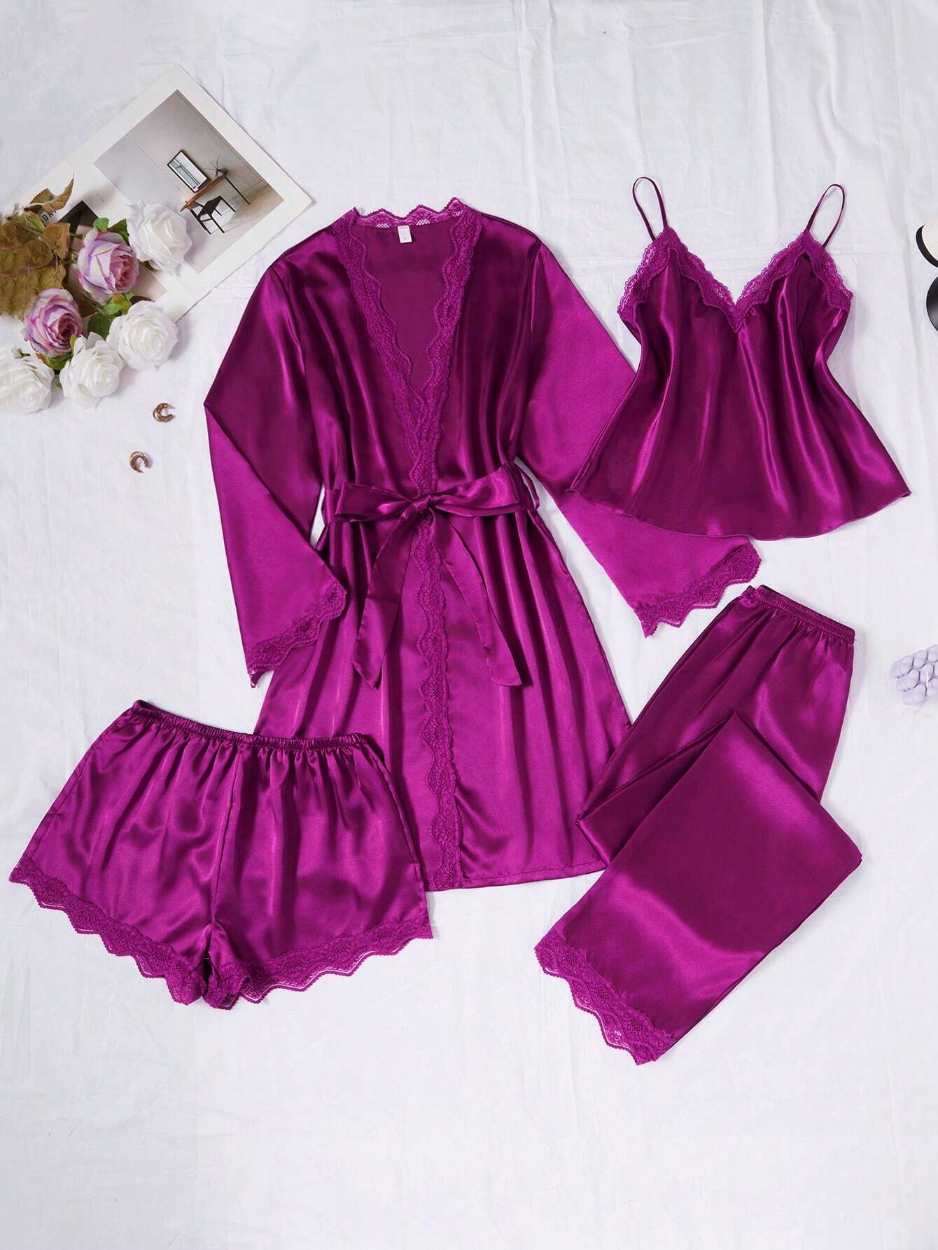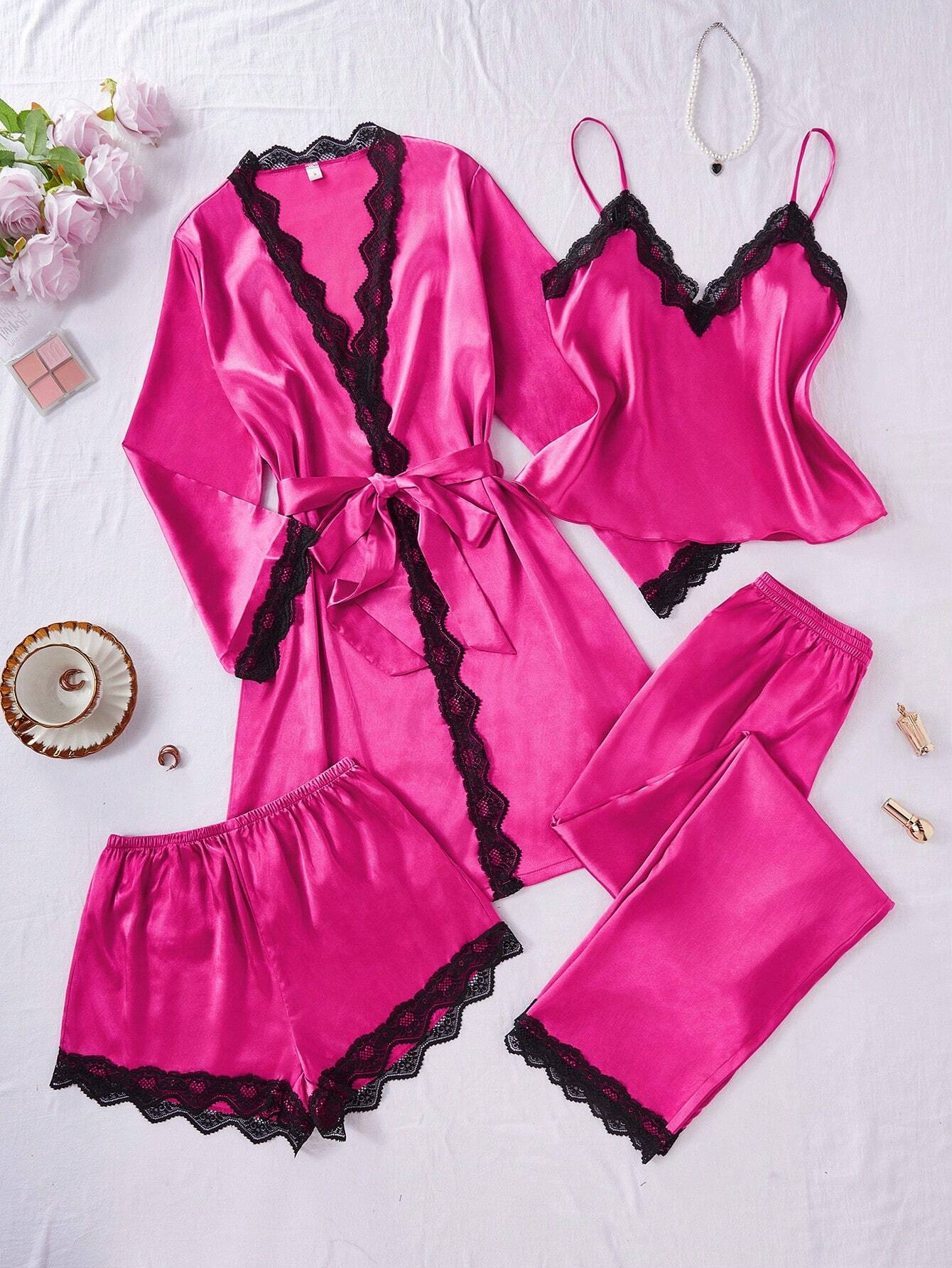 SilkySpell 4pcs Contrast Lace Faux Silk Camisole, Shorts, Pants And Robe Set