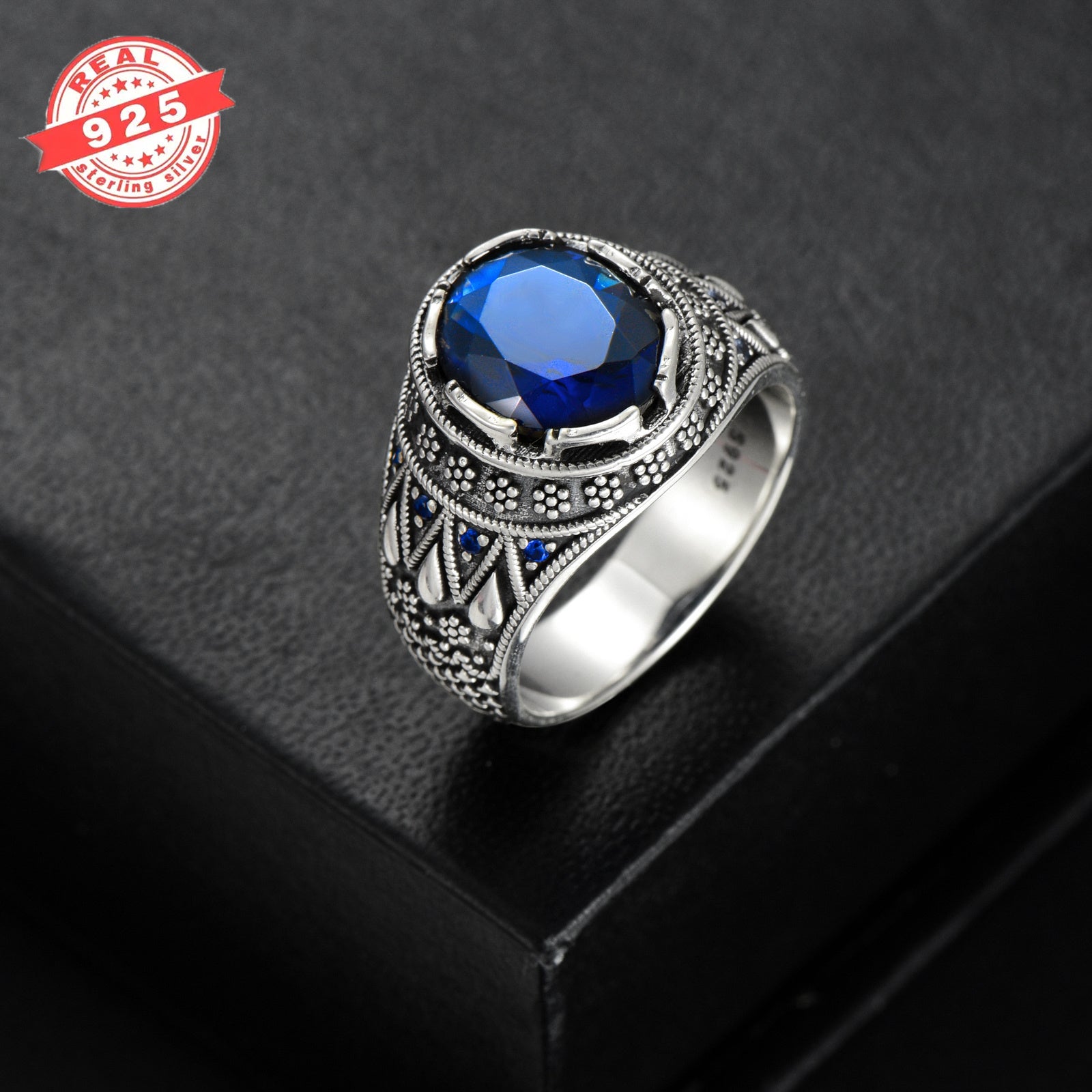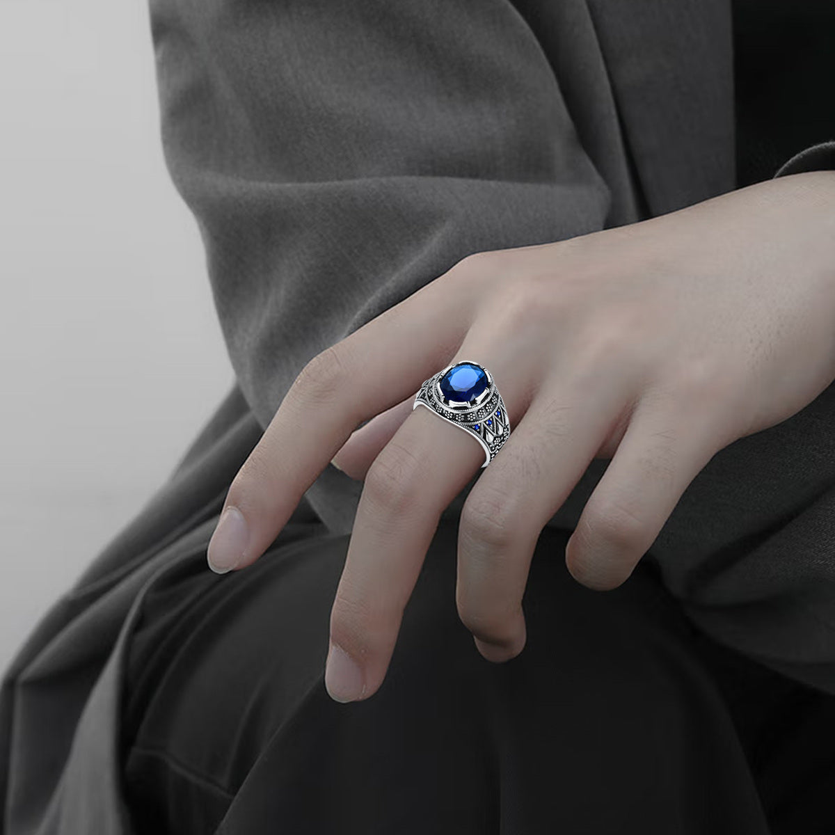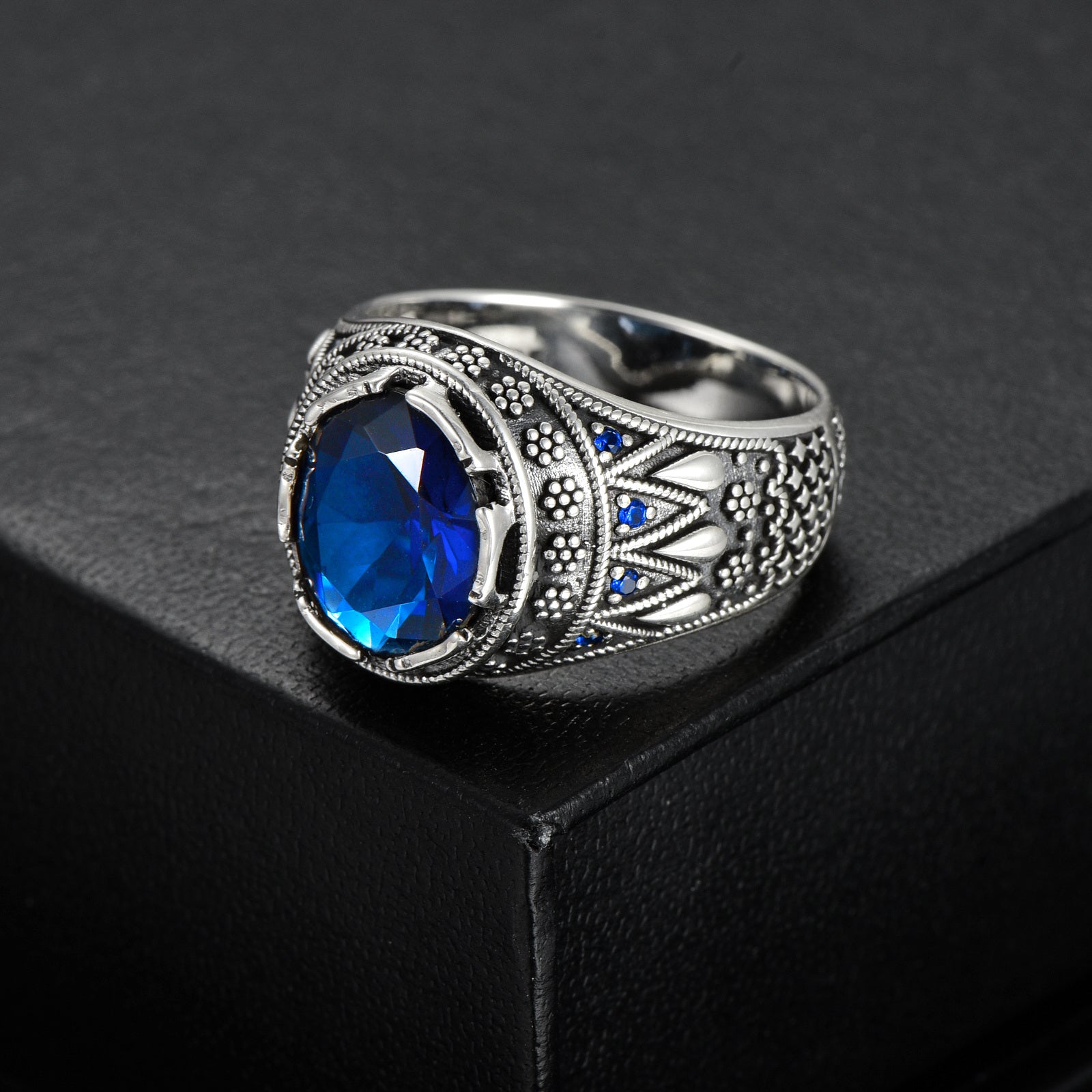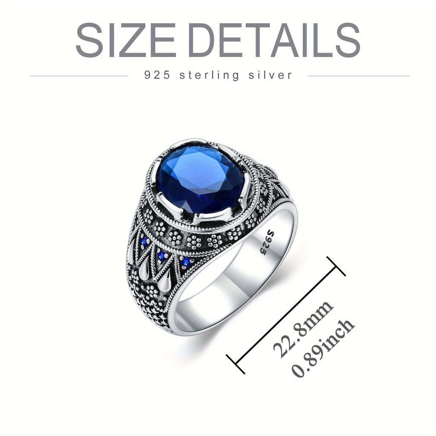 Silvery Blue Sapphire Ring for Men S925 Sterling Silvery Oxidized Ottoman Men'S Ring Handmade Elegant Personalized Faux Gemstone Ring for Men Husband Father US Size 4 to 16