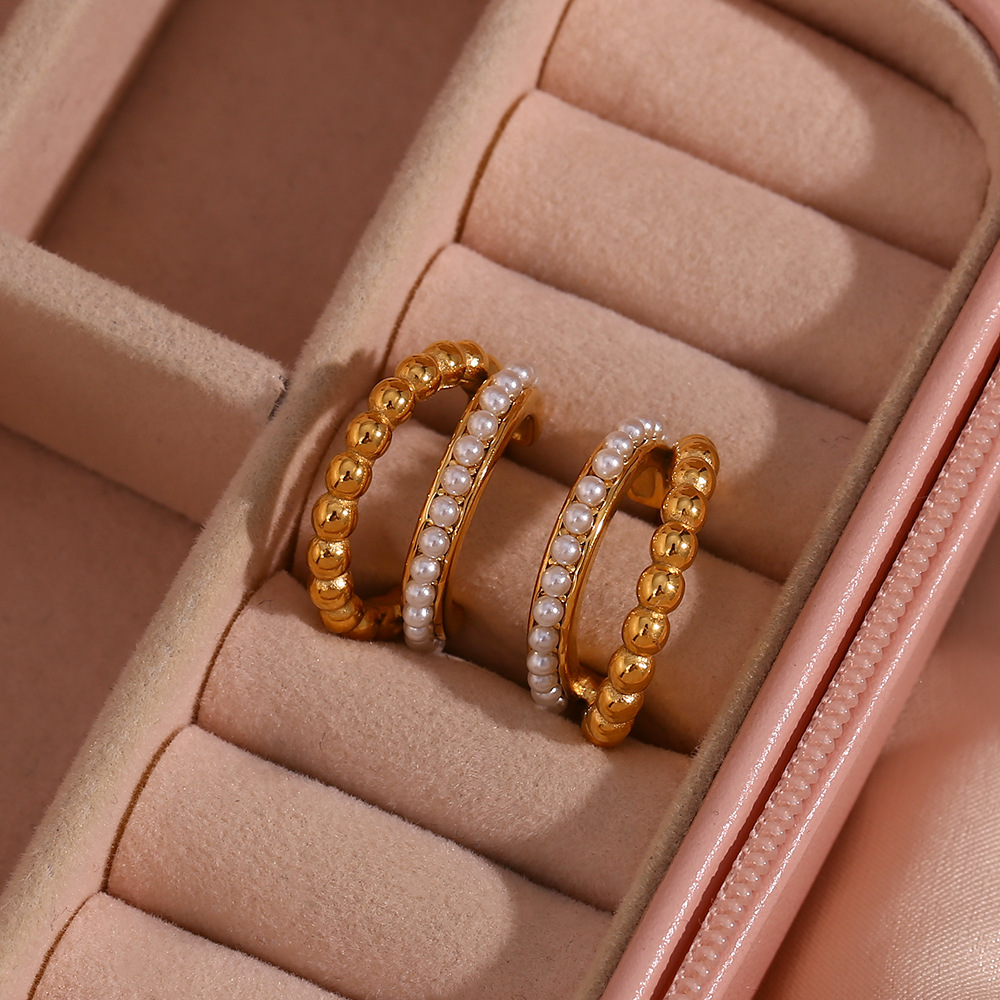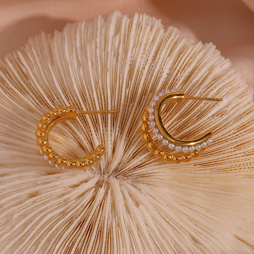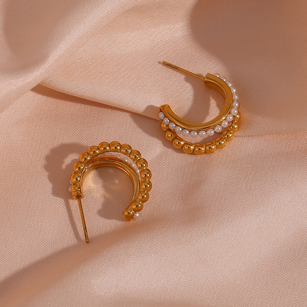 Simple Light Luxury Ear Ring Earrings Jewelry Stainless Steel Double Layer Beads Pearl C Shaped Stud Earrings for Women Accessories