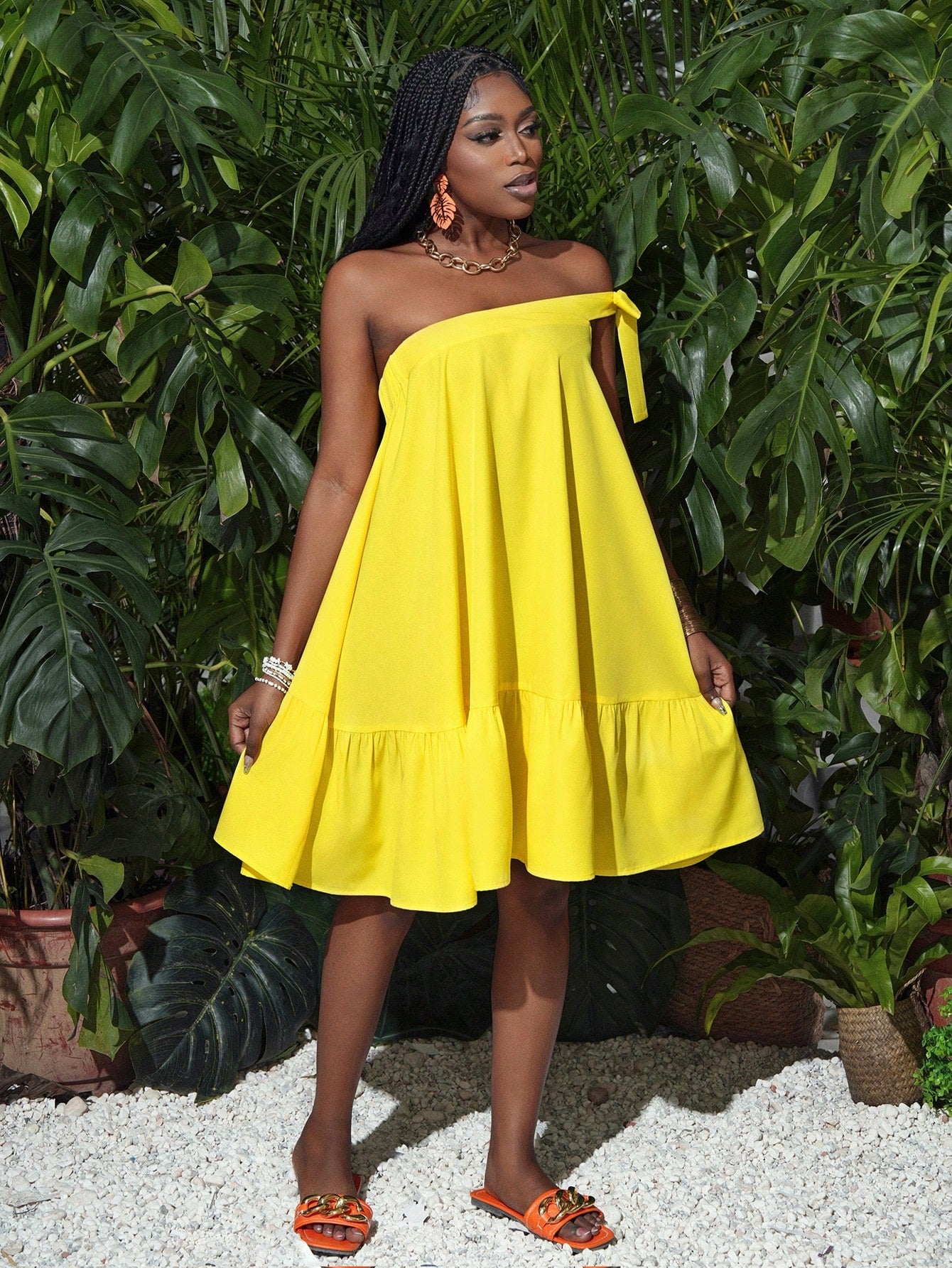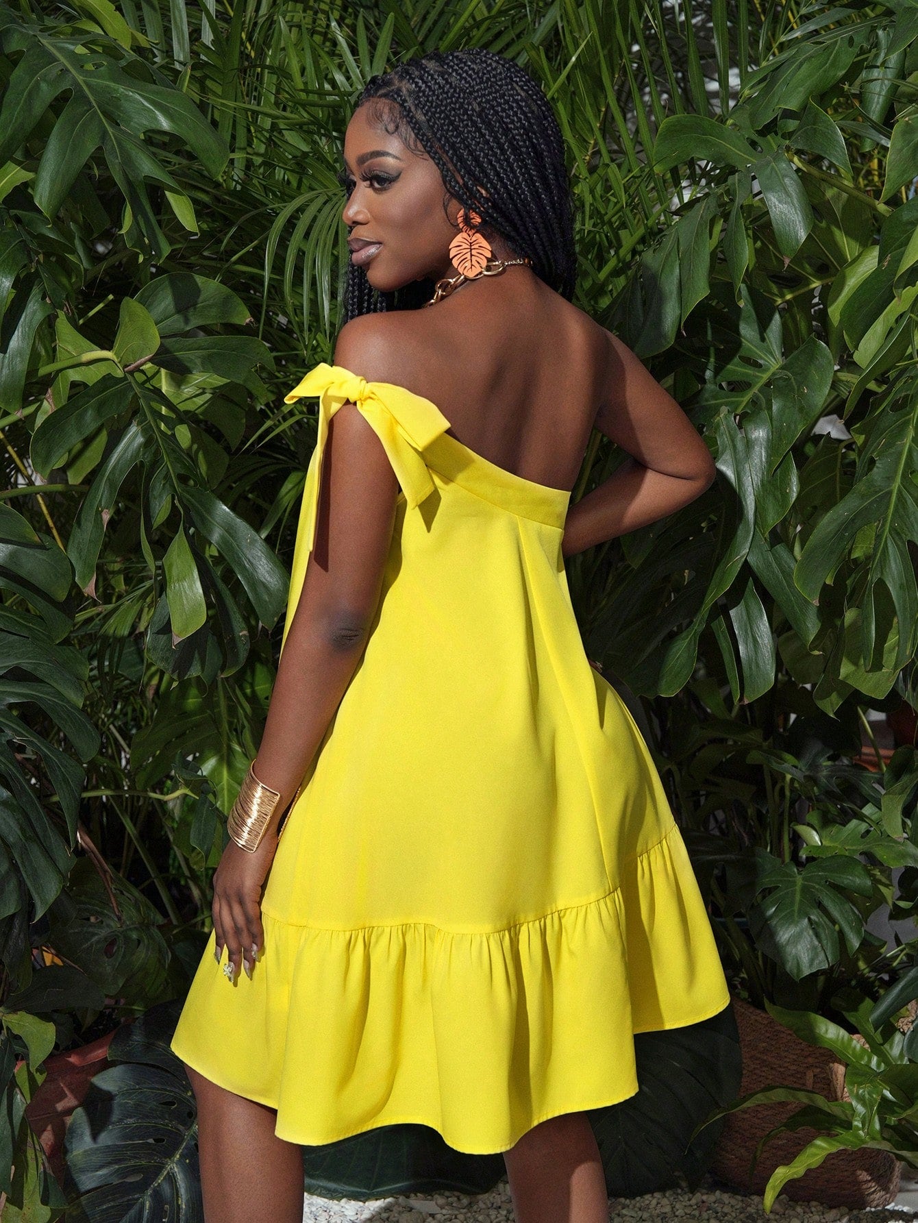 Slaydiva Beach Summer Casual Vacation One-Shoulder Bow Tie A-Hem Ruffle Hem Loose Yellow Short Dress Women's Dress