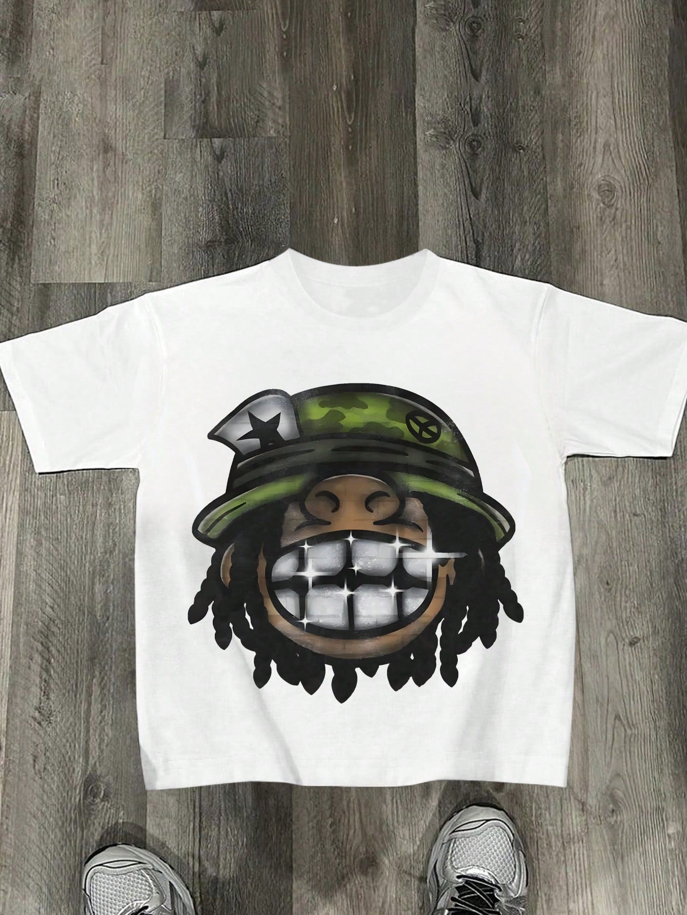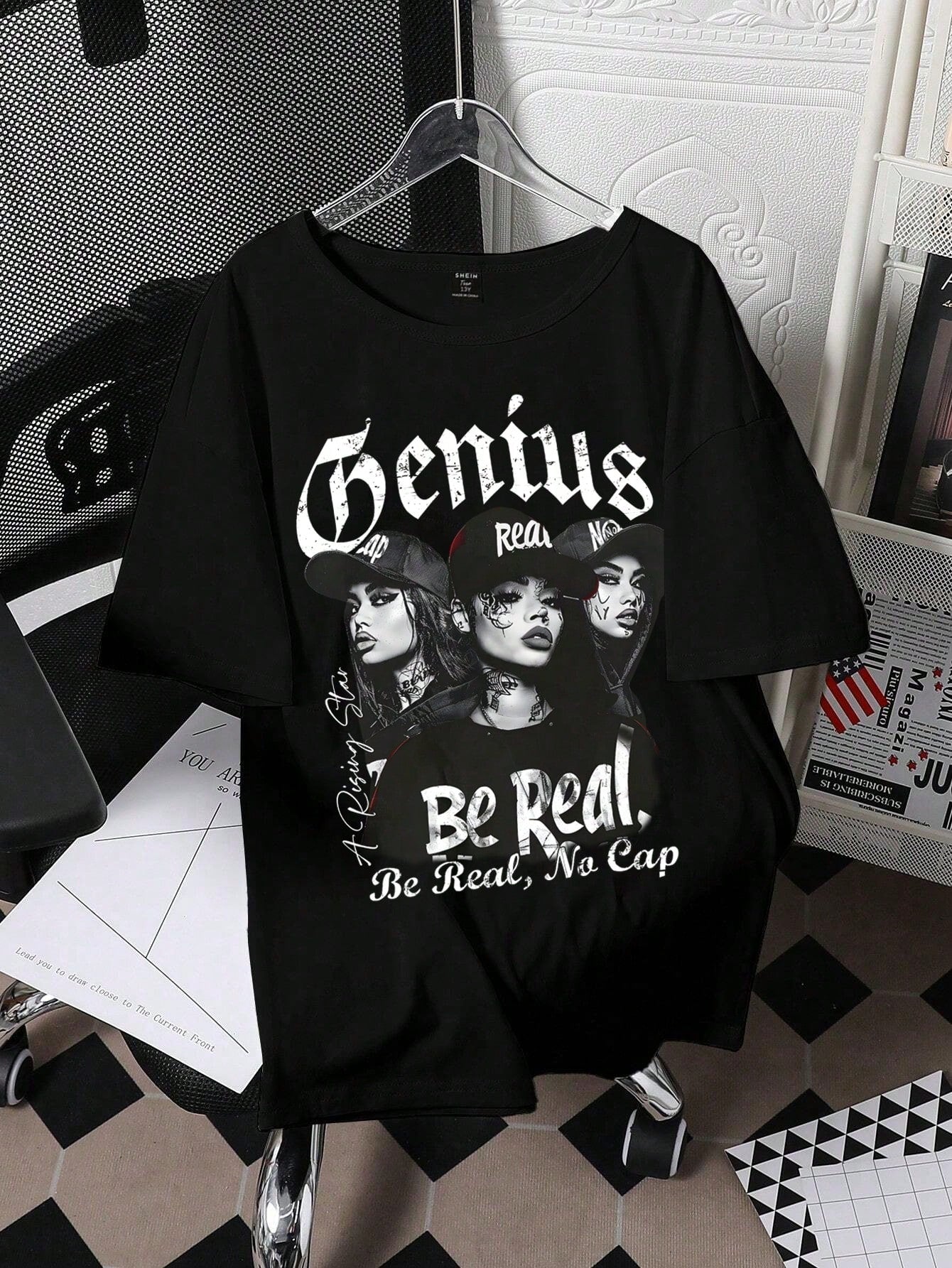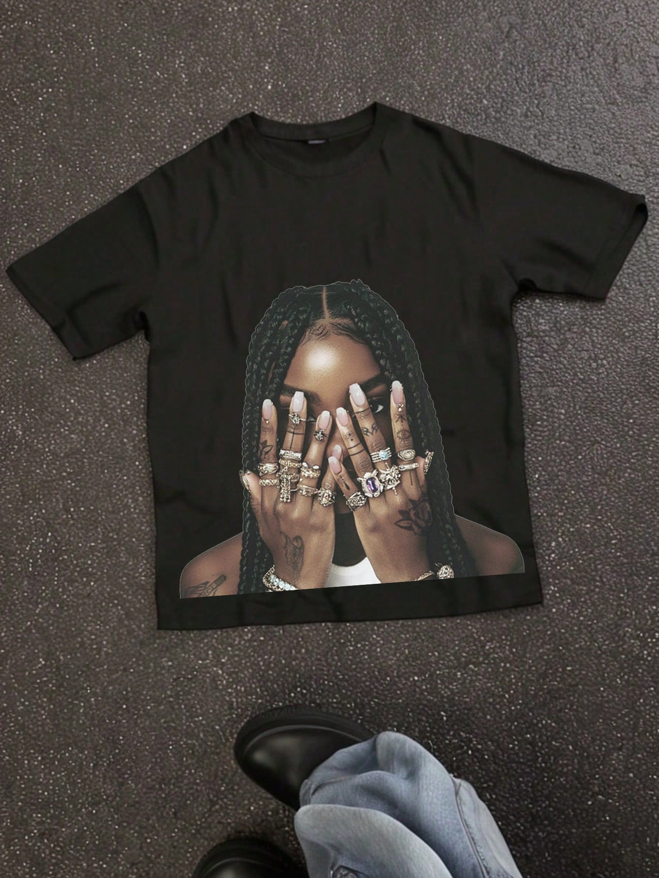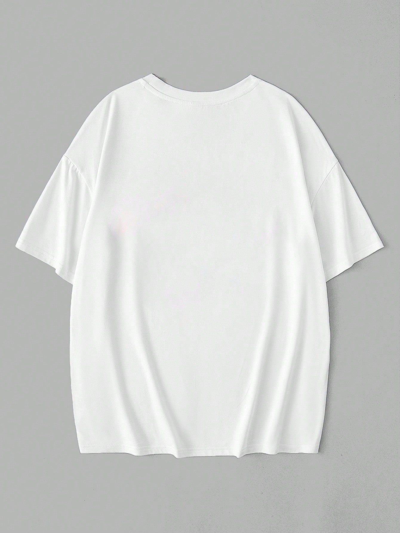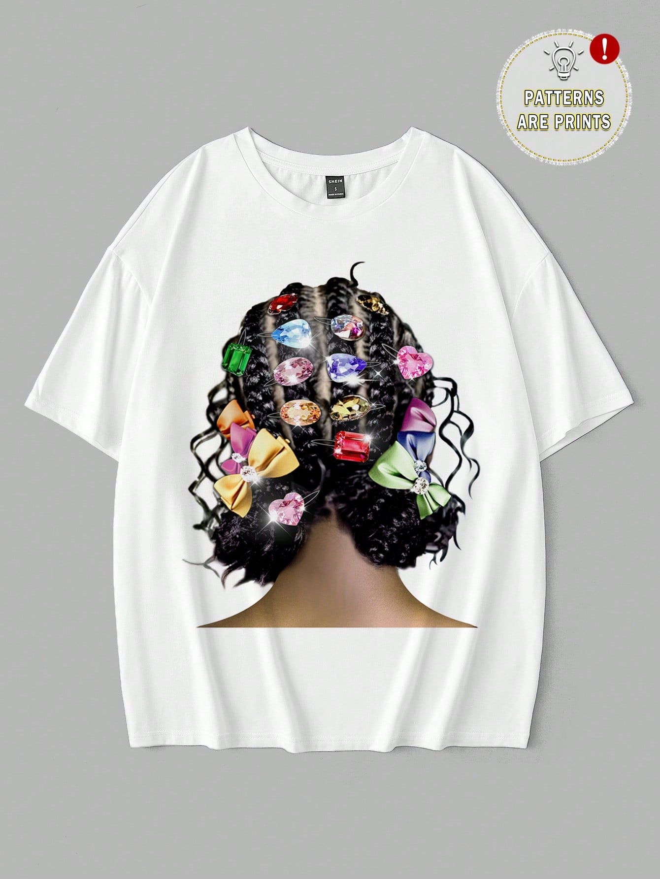 Slaydiva Casual Bow Decor Portrait Graphic Loose Fit Round Neck Short Sleeve T-Shirt For Women, Suitable For Summer
