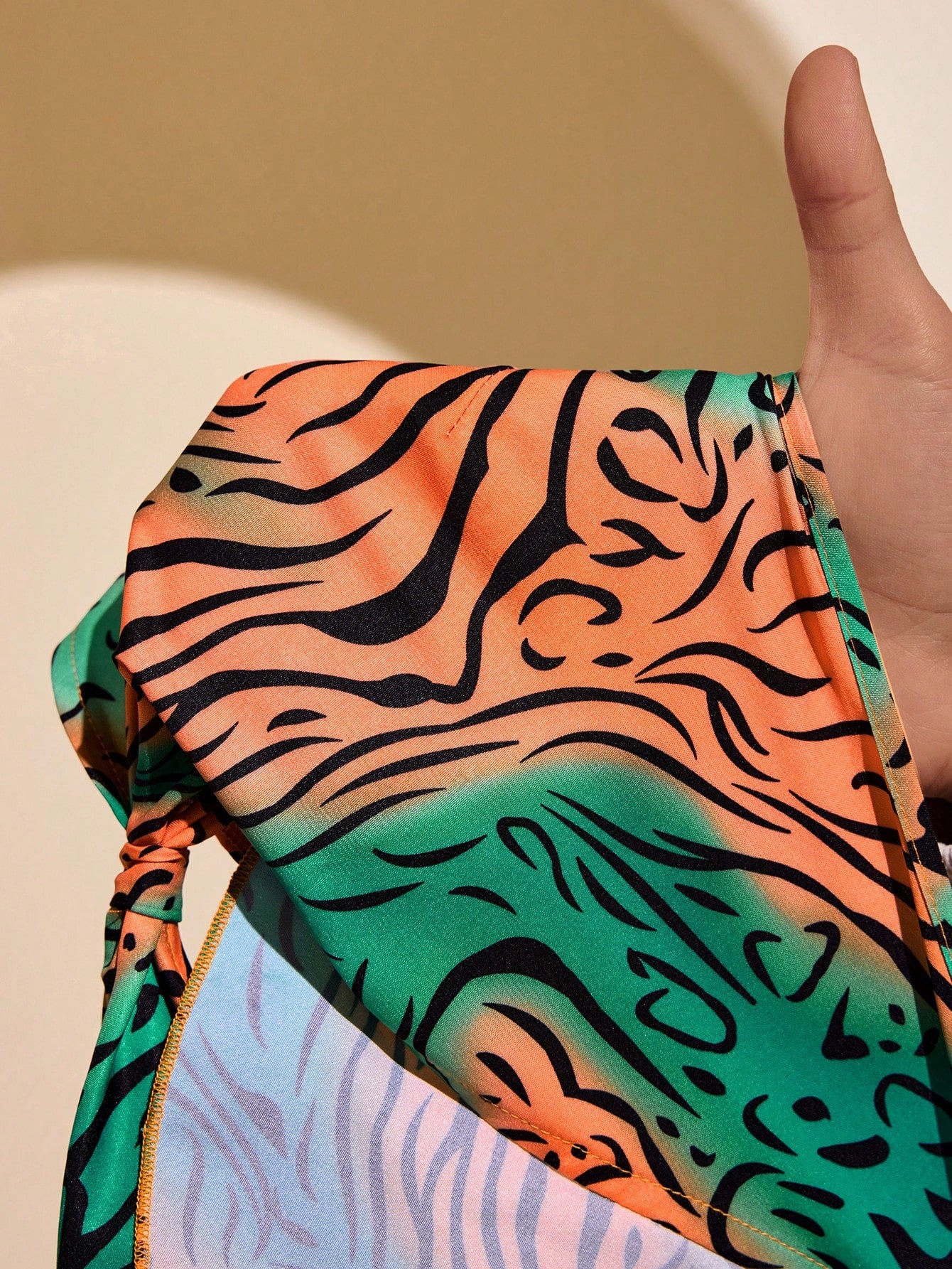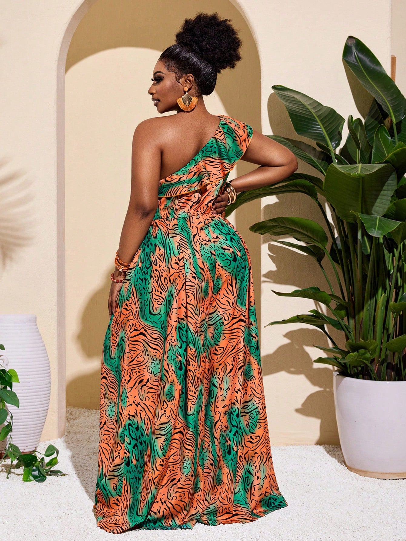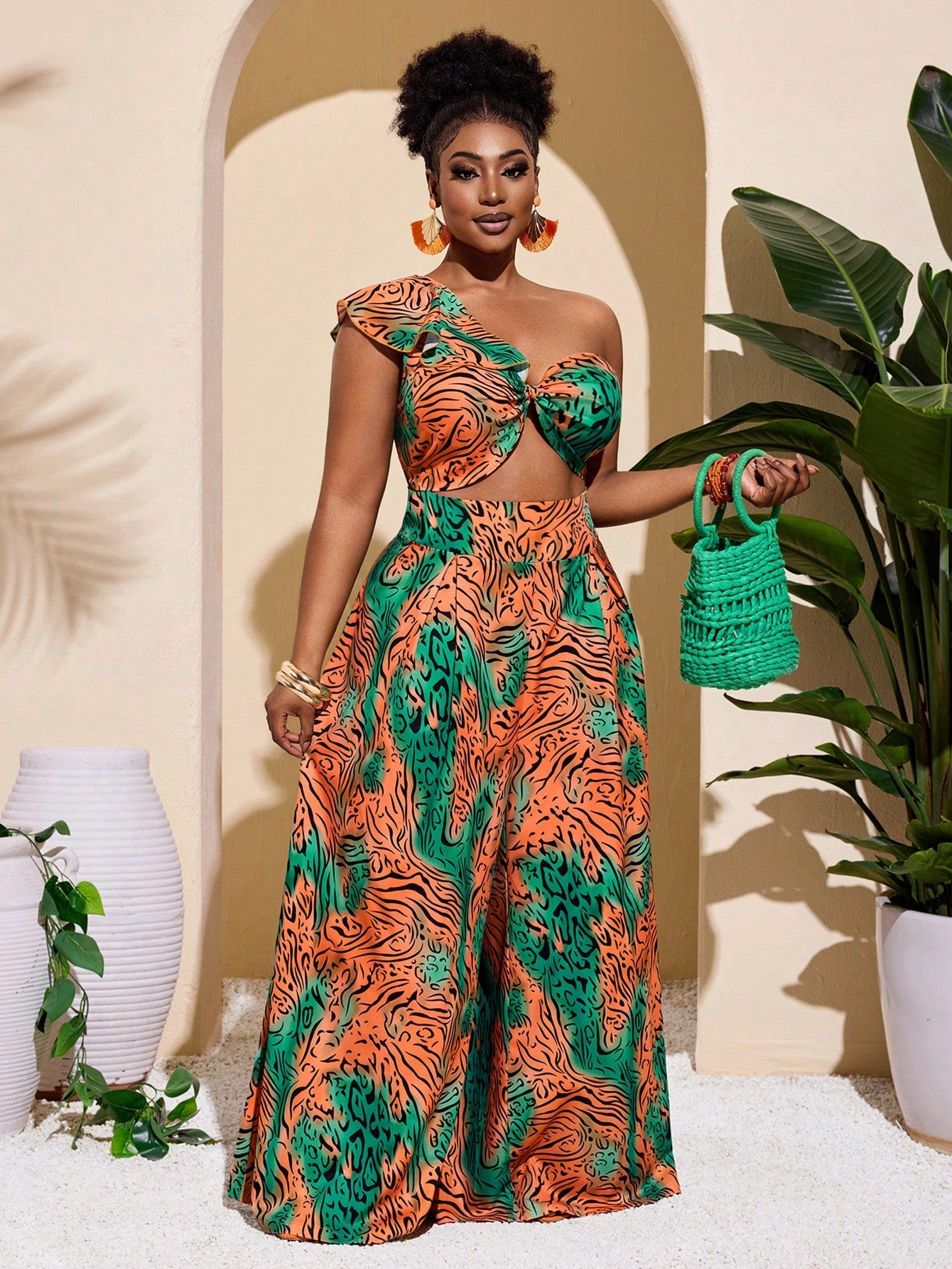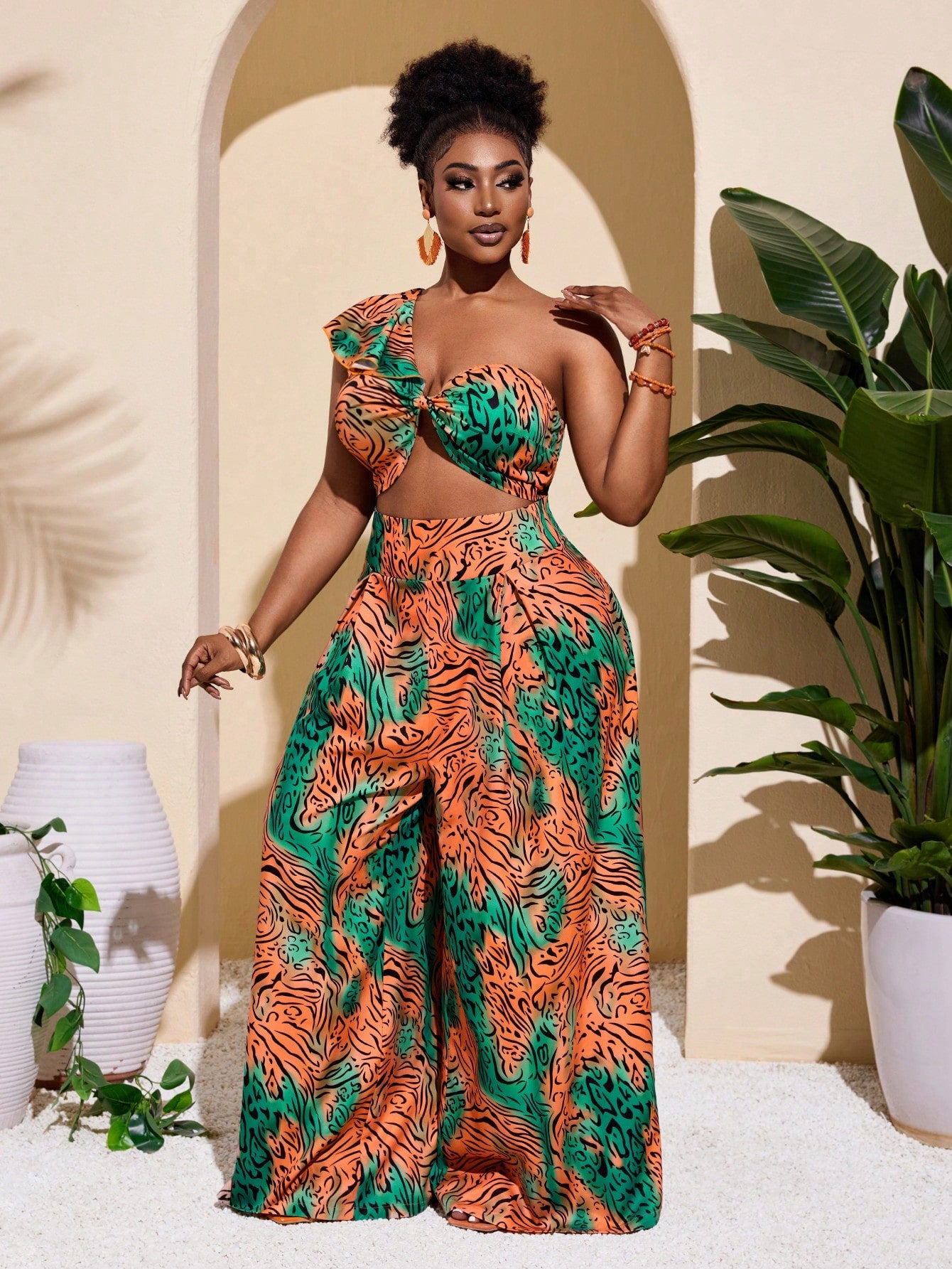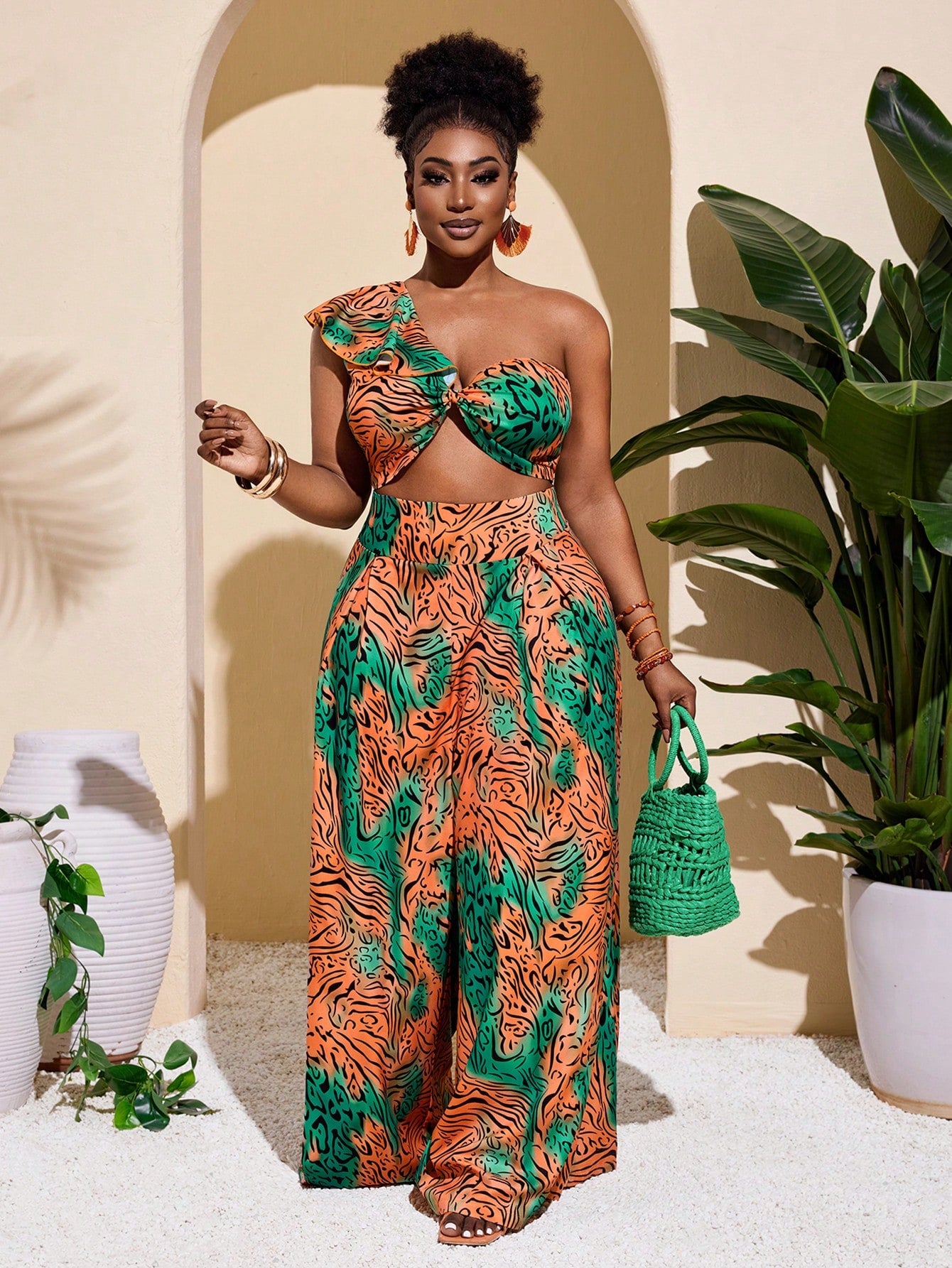 Slaydiva Elegant Romantic Plus Size Women's Floral Print Sleeveless Ruffled Hollow Out Wide Leg Jumpsuit