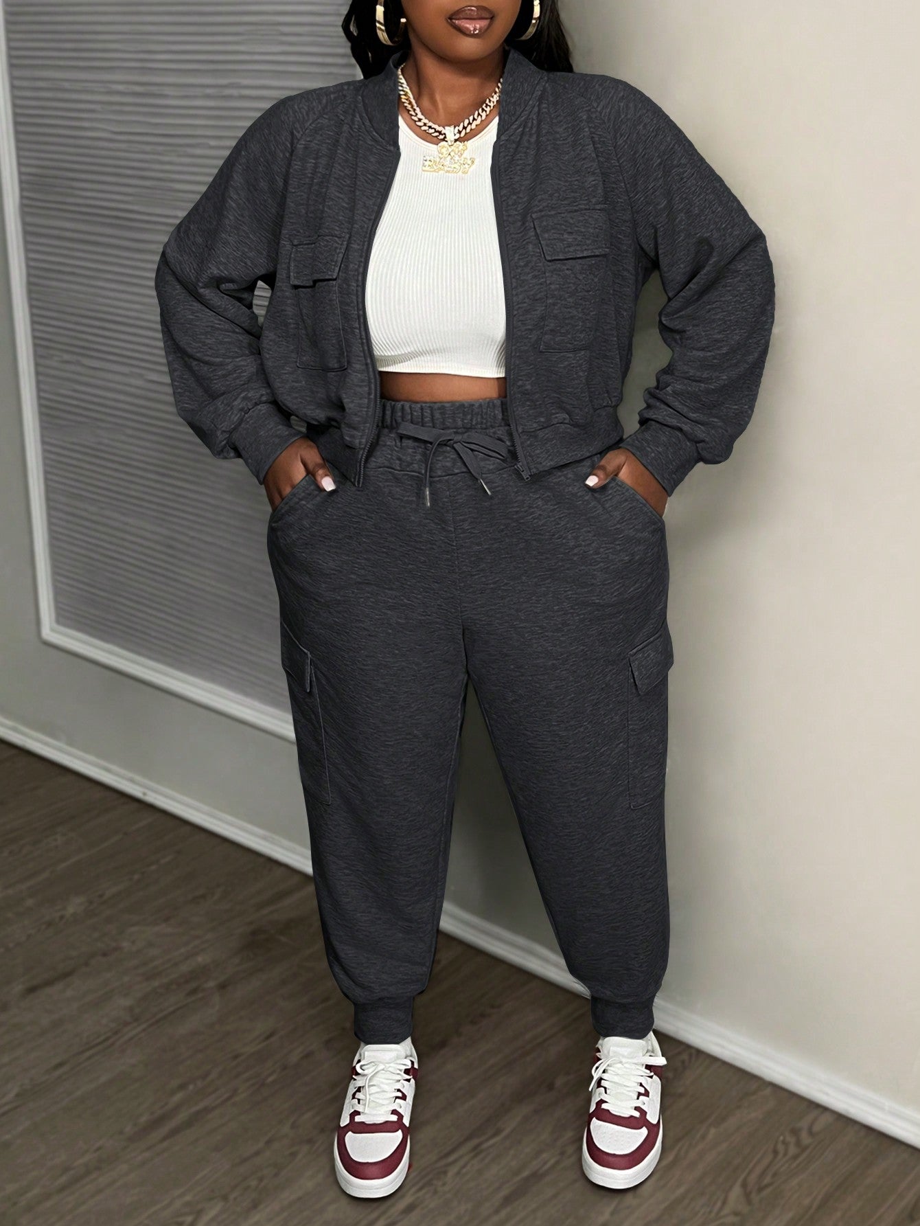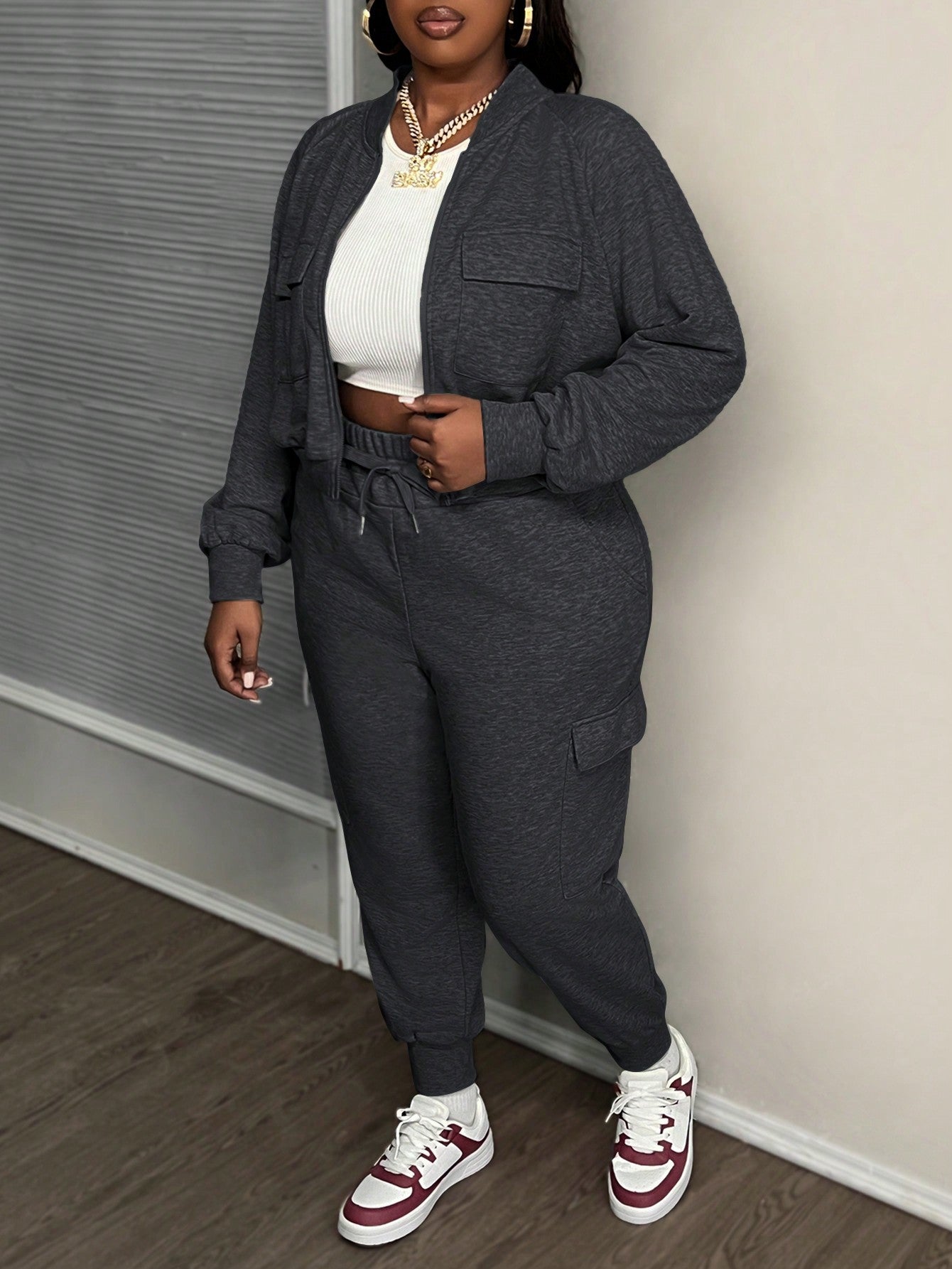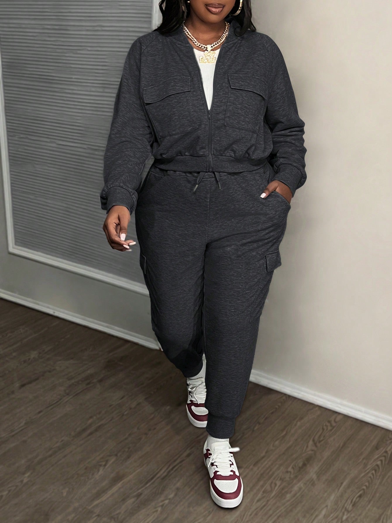Slaydiva Plus Size Street & Casual & Sports Women 2pcs Onsie Set - Gray Color Hoodie With Zipper, Ankle Length Joggers With Cargo Pockets, Autumn/Winter