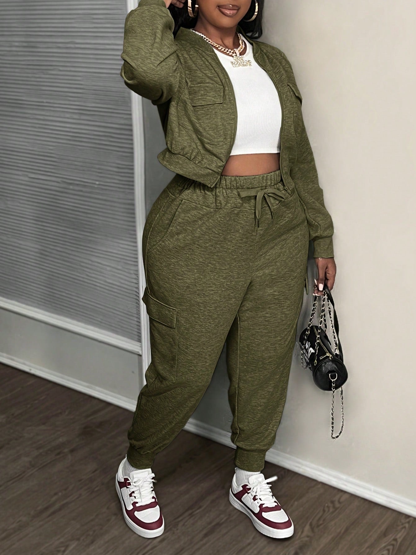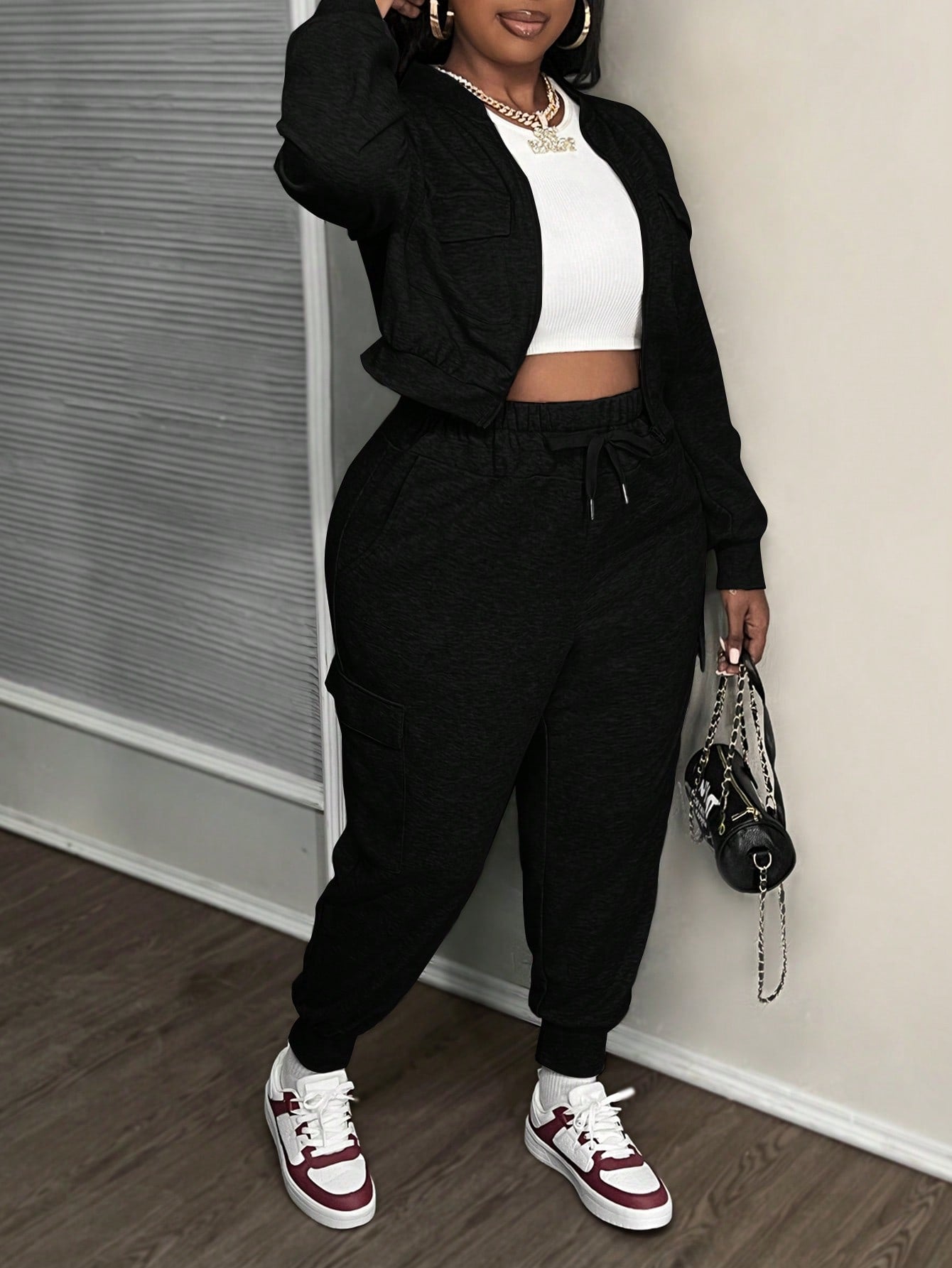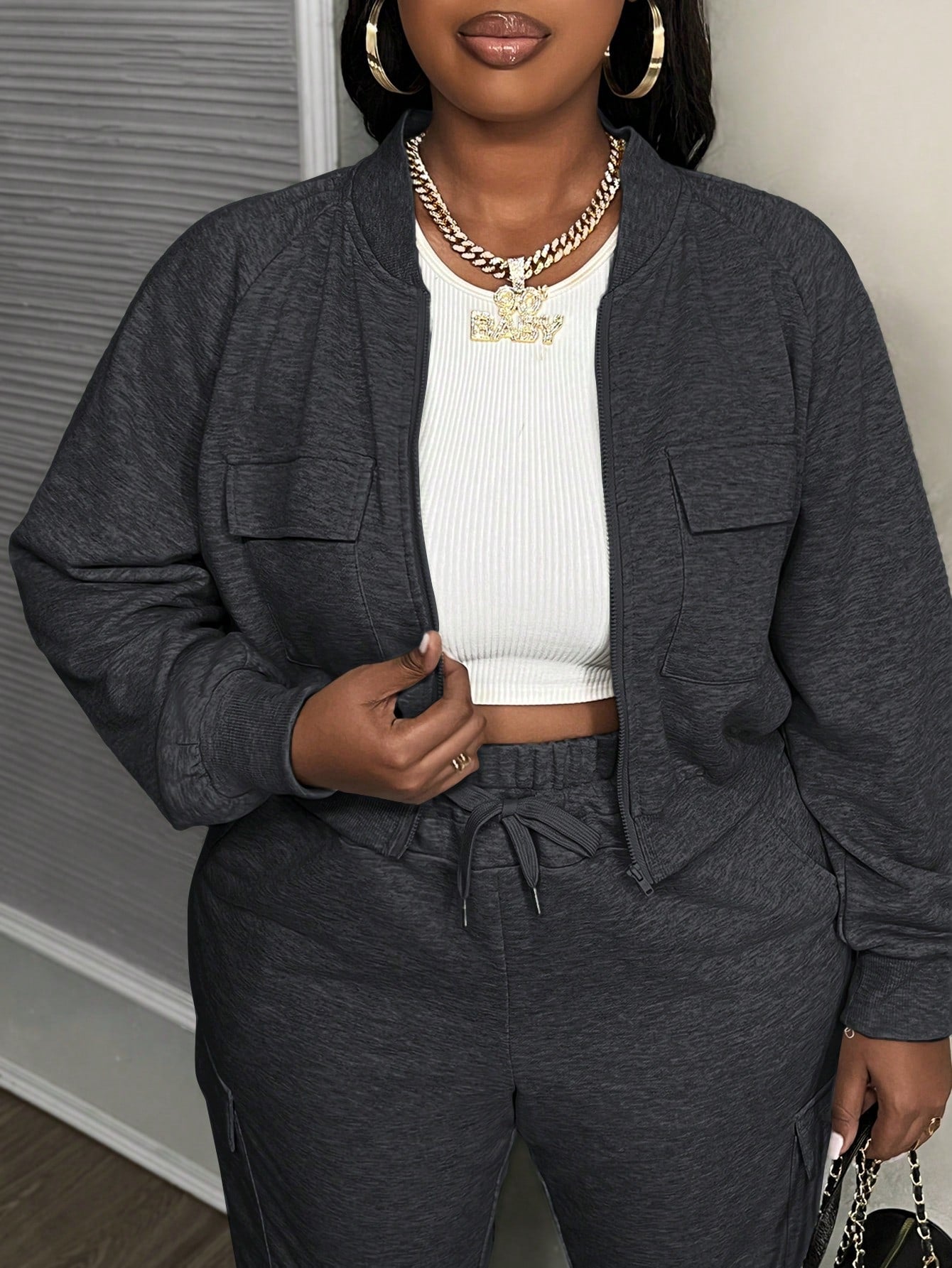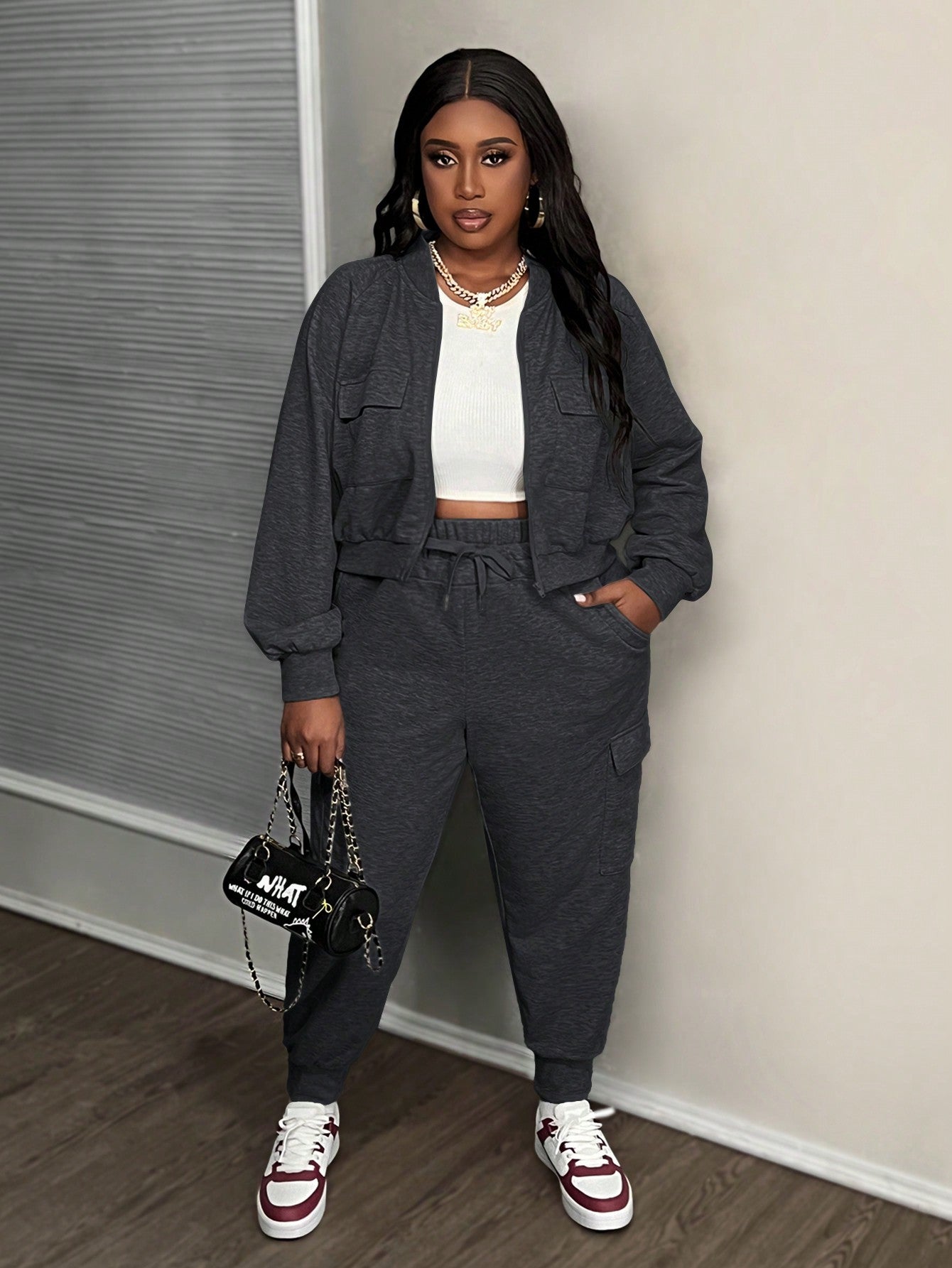 Slaydiva Plus Size Street & Casual & Sports Women 2pcs Onsie Set - Gray Color Hoodie With Zipper, Ankle Length Joggers With Cargo Pockets, Autumn/Winter