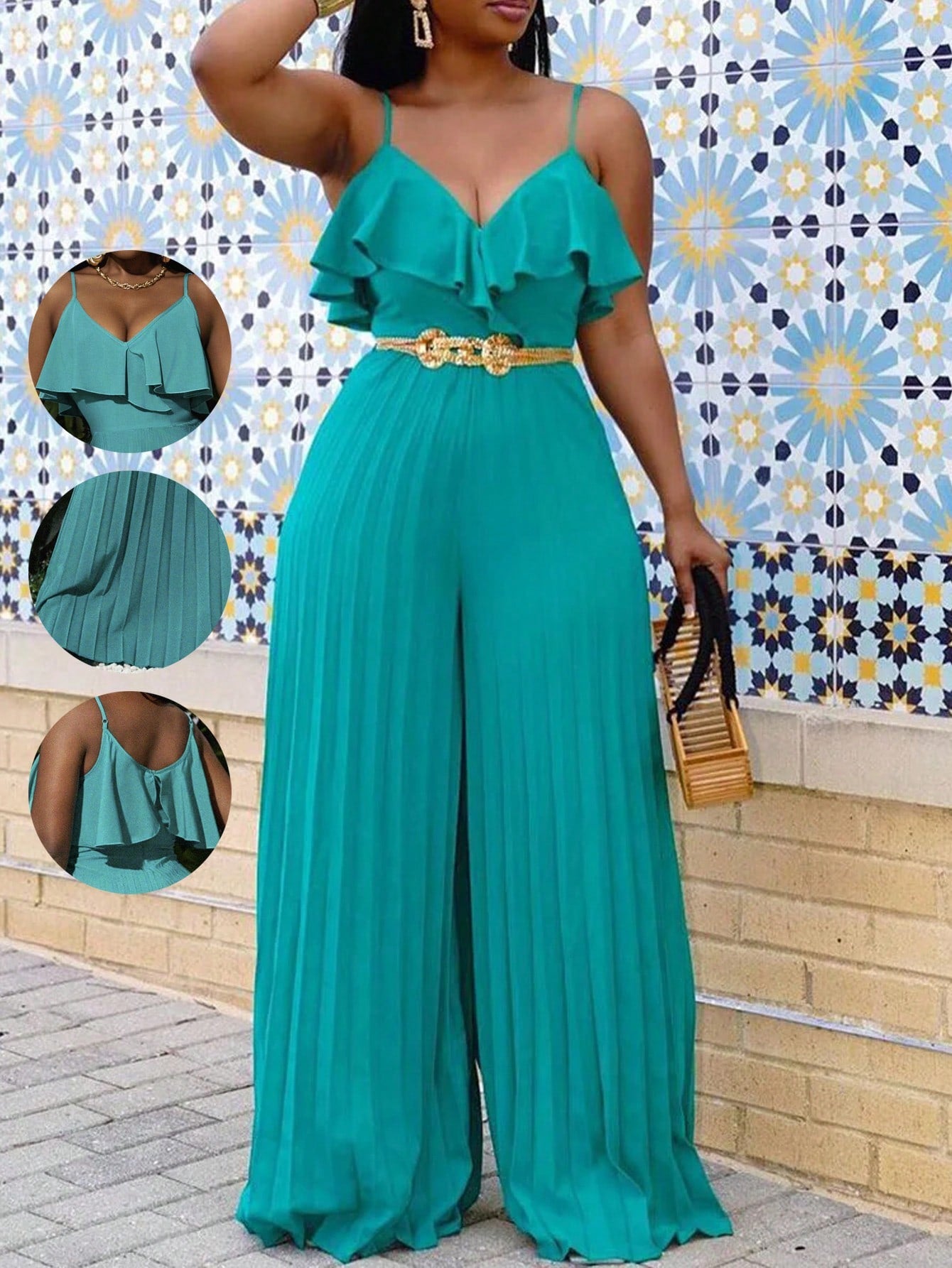 Slaydiva Women's Vacation Summer Music Festival Loose Green Ruffle Neck Pleated Wide Leg Cami Jumpsuit