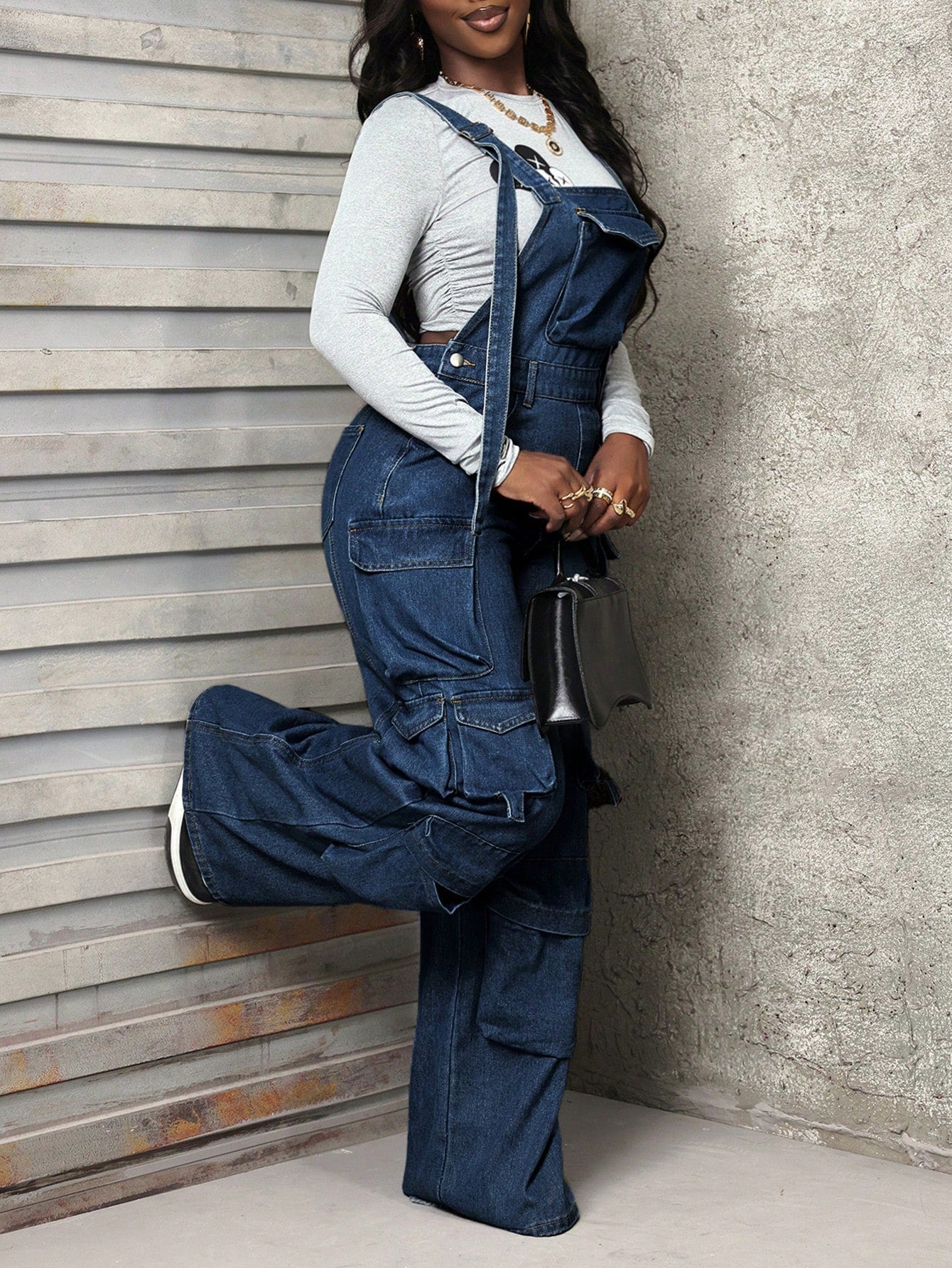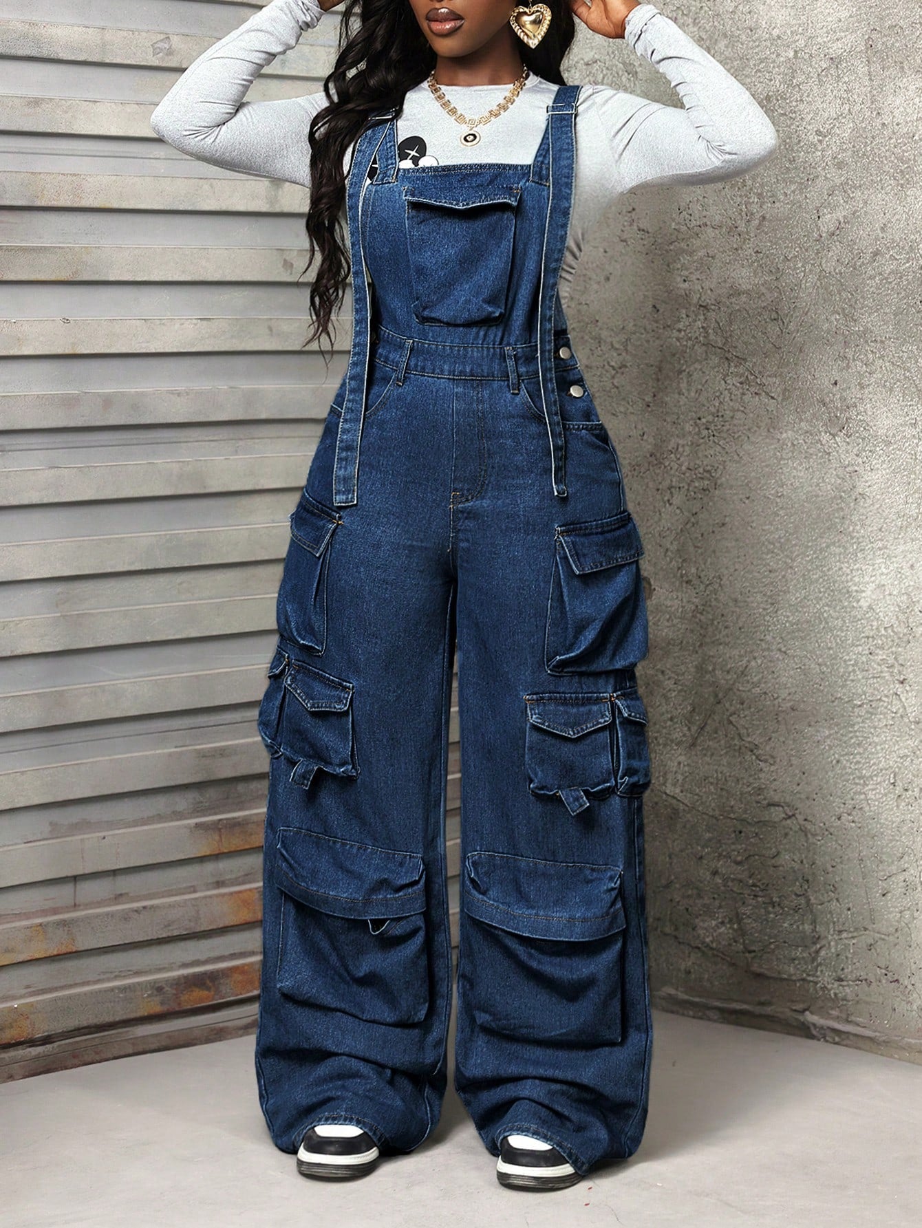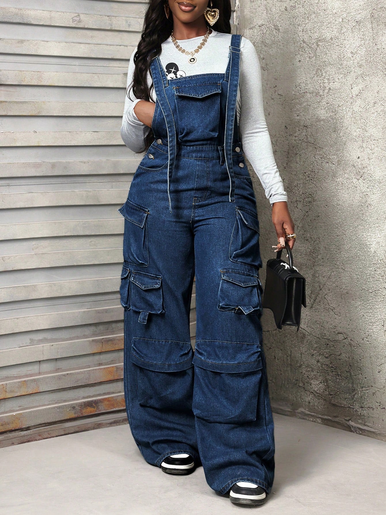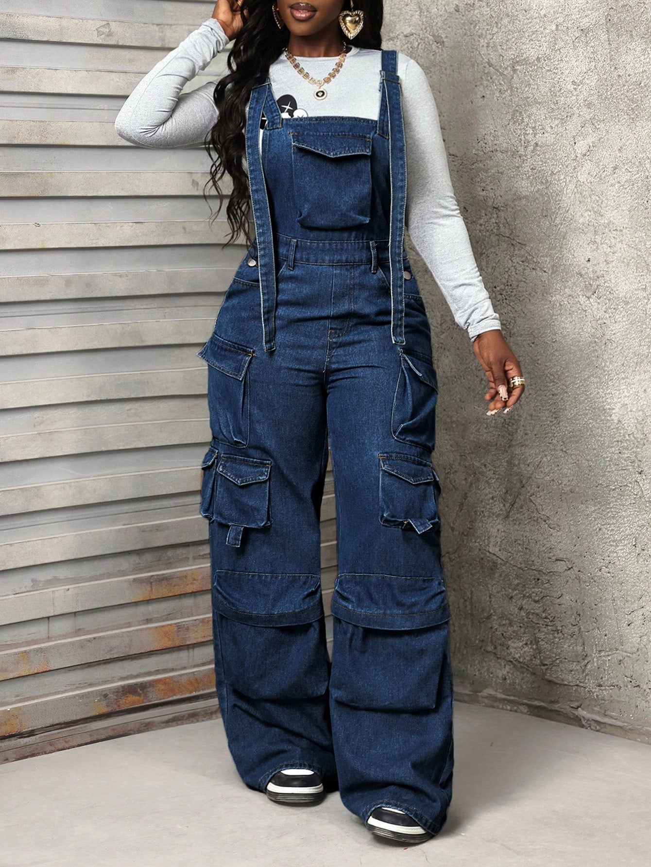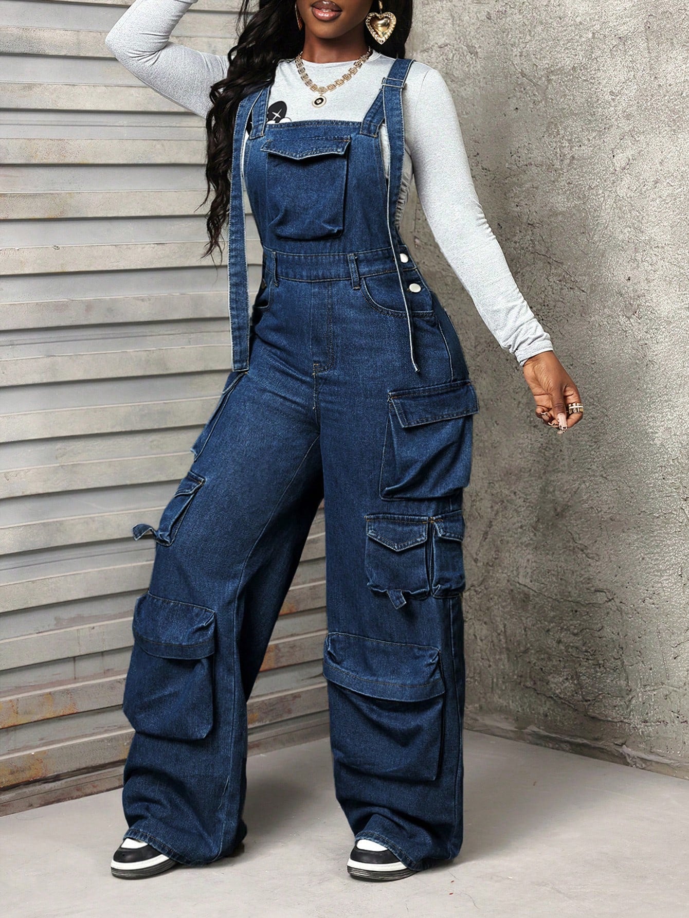 Slayr Solid Color Thick Strap Pocket Casual Loose Fit Denim Jumpsuit