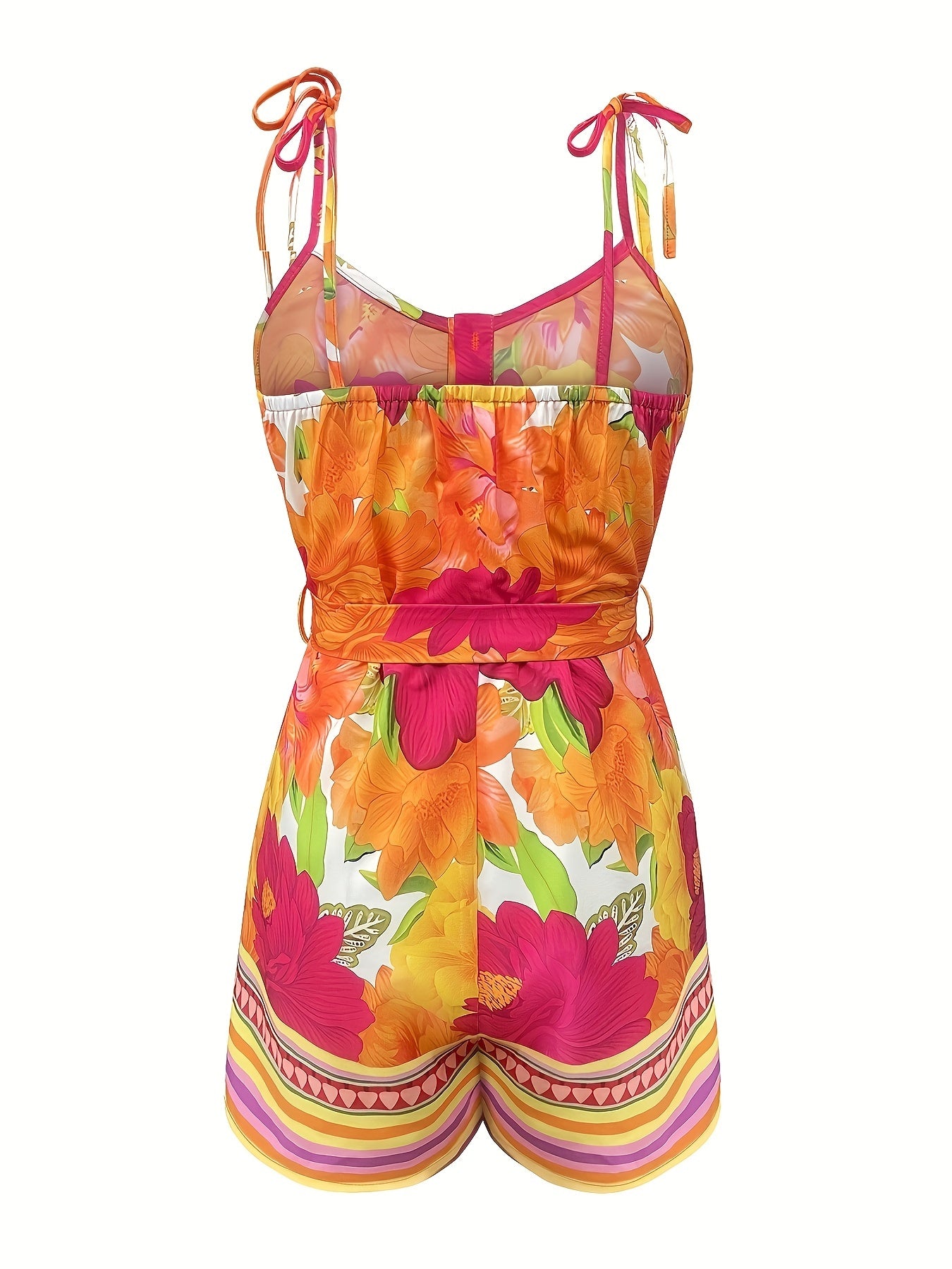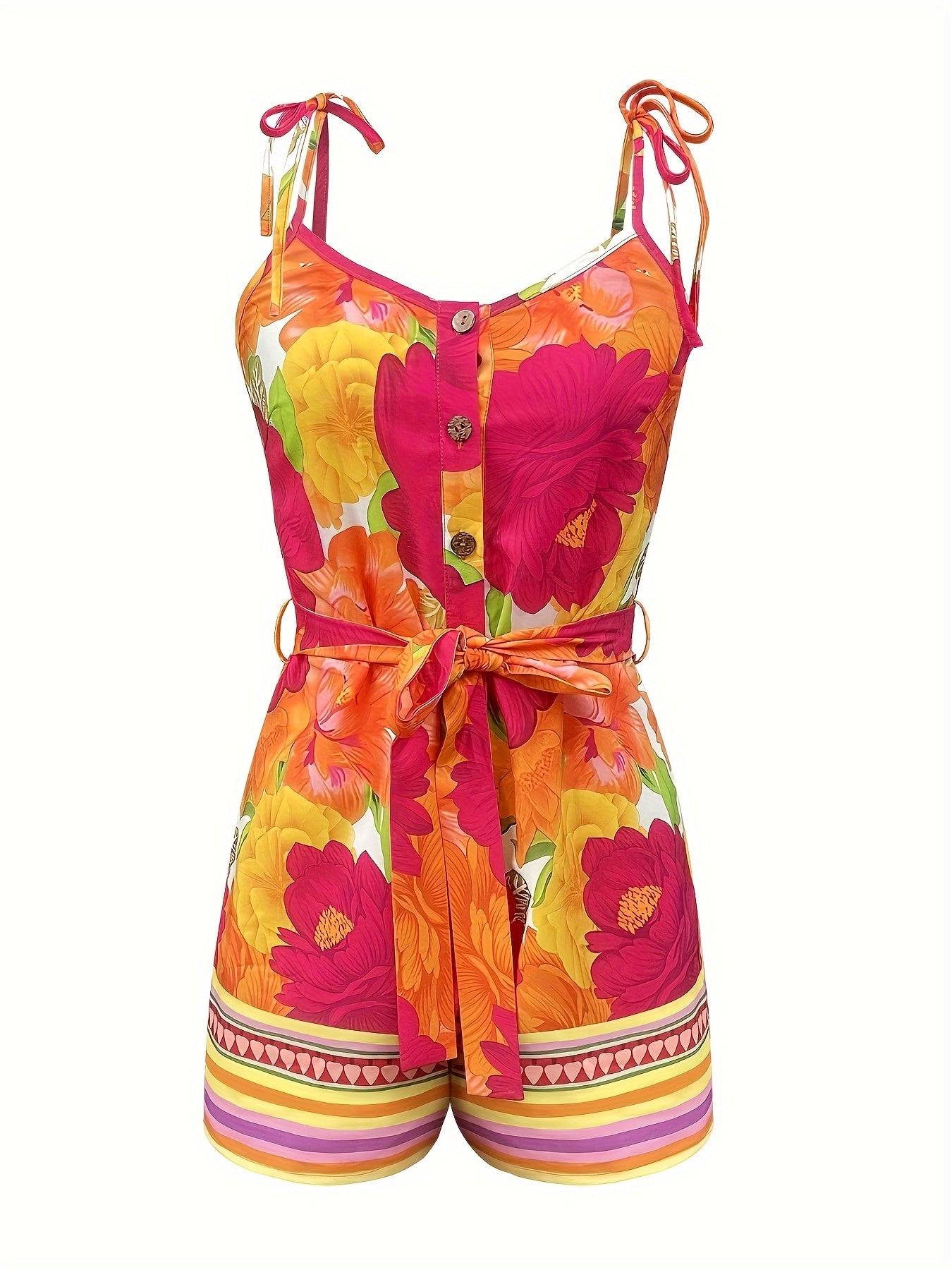 Sleeveless Tie Waist Button Romper Jumpsuit, Floral Print Striped Color Block Casual Vacation Style Women's Clothing