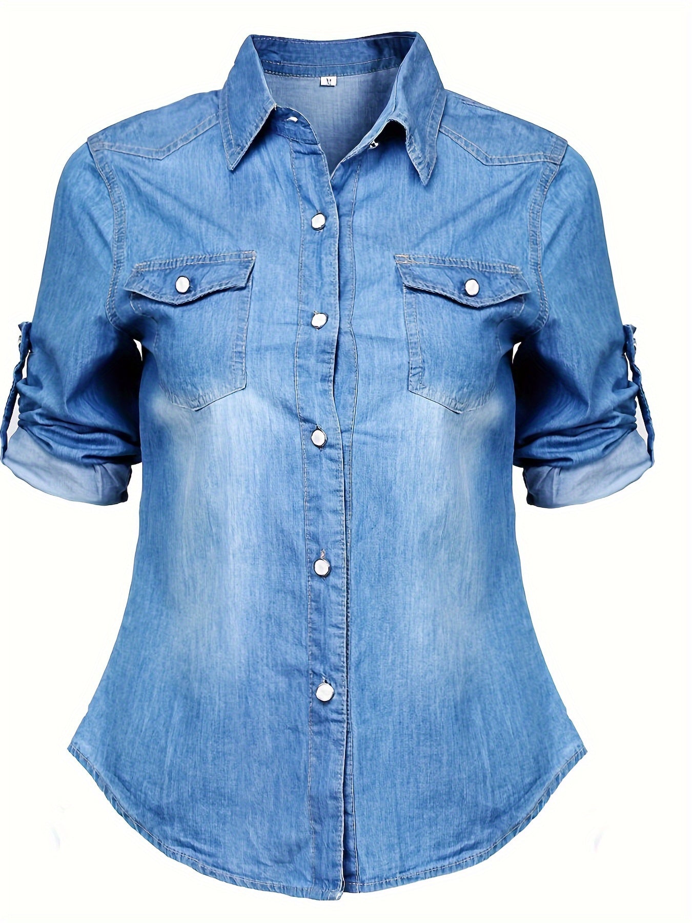 [Slim Autumn Spring Fashion Blouse] Women Retro Blue Denim Shirts Adjustable Long Sleeve Stand-up Collar Single-breasted Blouse Autumn Spring Fashion Slim Tops