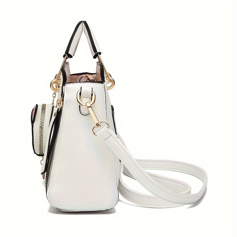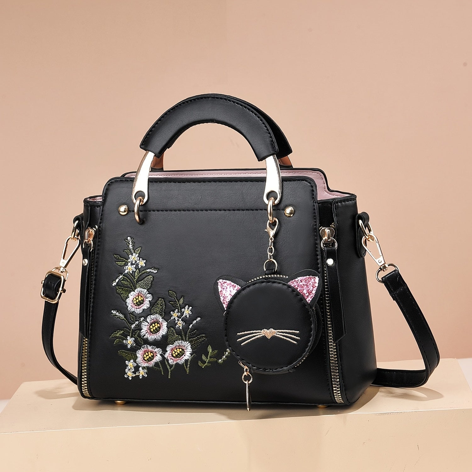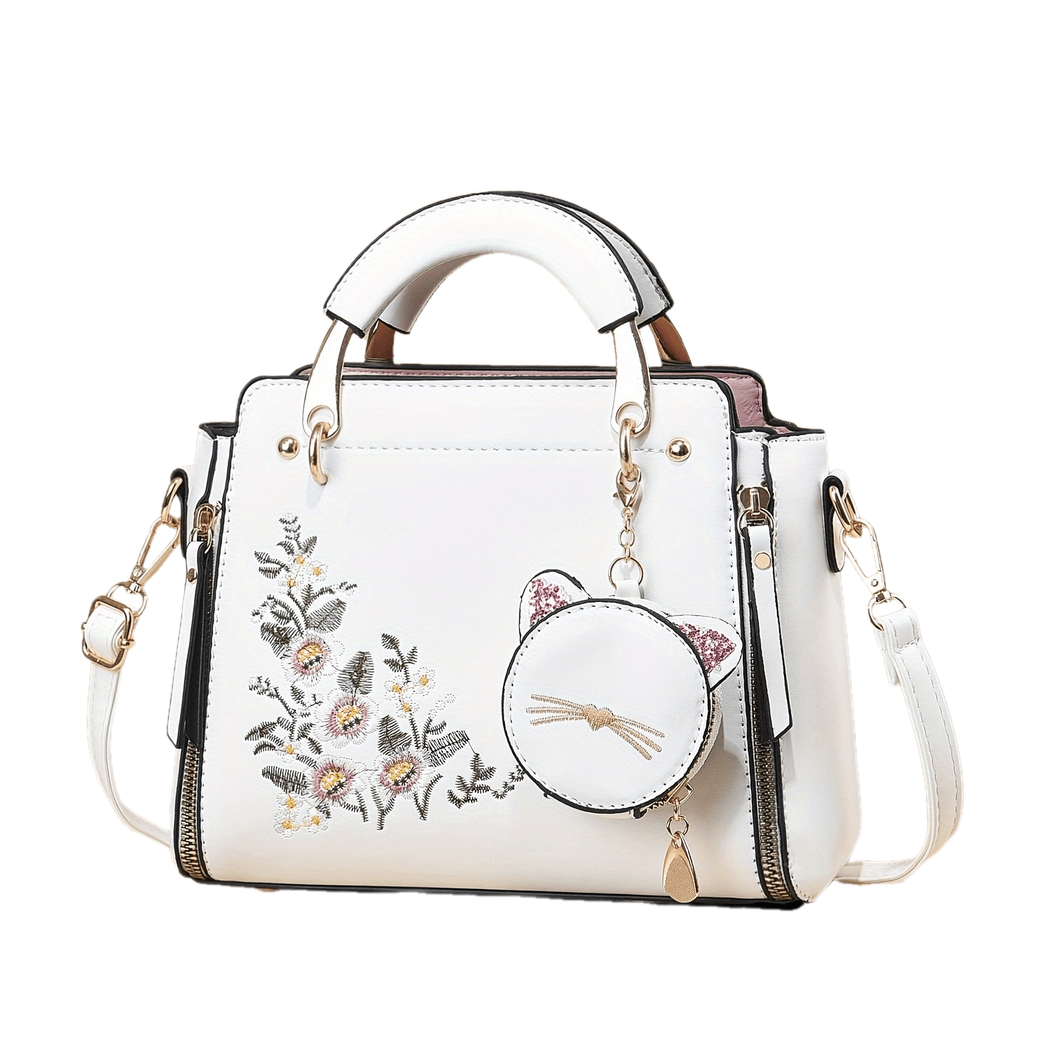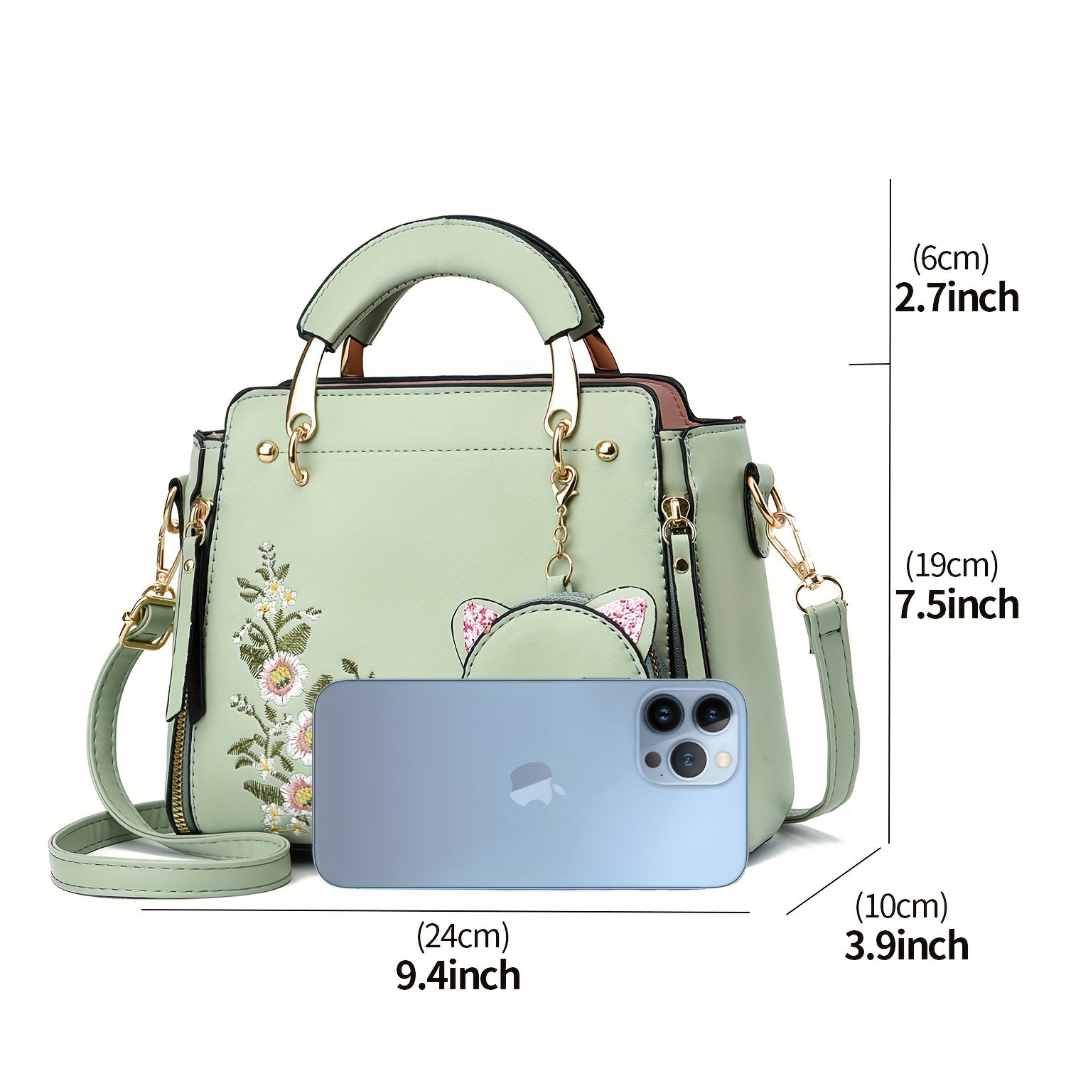 Small Flower Embroidery Crossbody Bag, Fashion Top Handle Satchel Shoulder Bags Totes with Kitten Pendant for Women Ladies Handbags and Purses