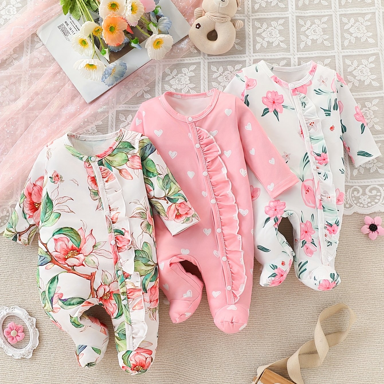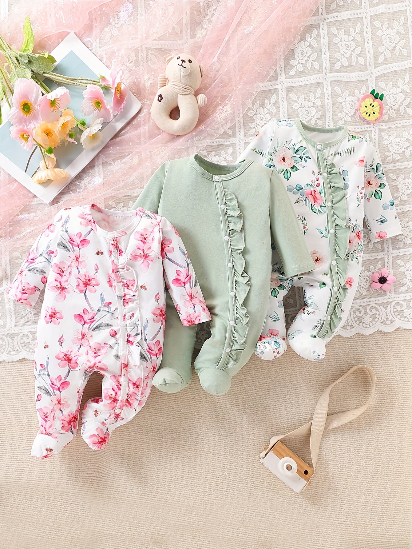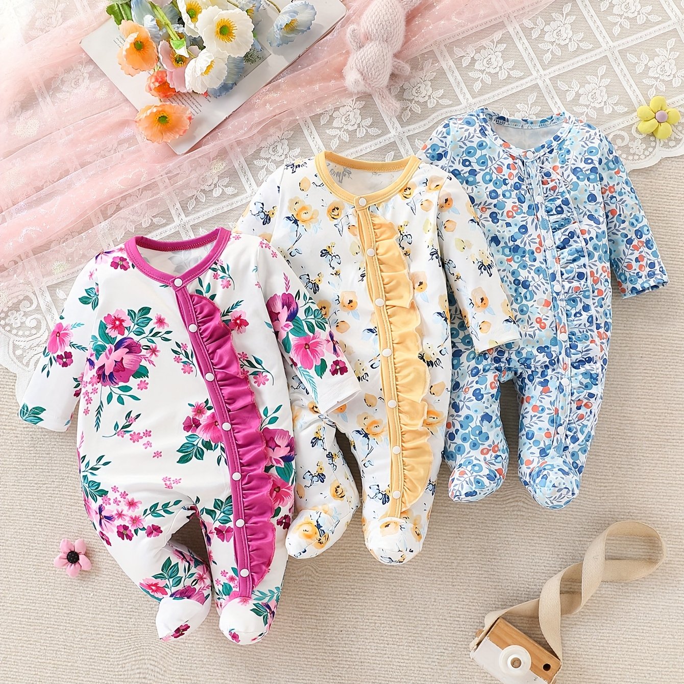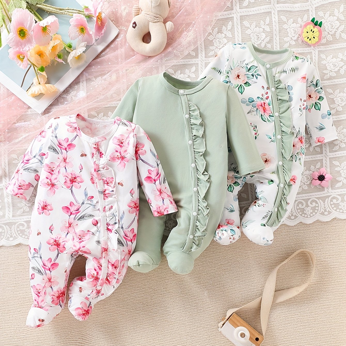 [Soft Rompers] Soft and Stretchy Set of 3 Baby Girl Footed Rompers | Featuring Randomly Print Ruffled Designs, for Newborns, Outdoor