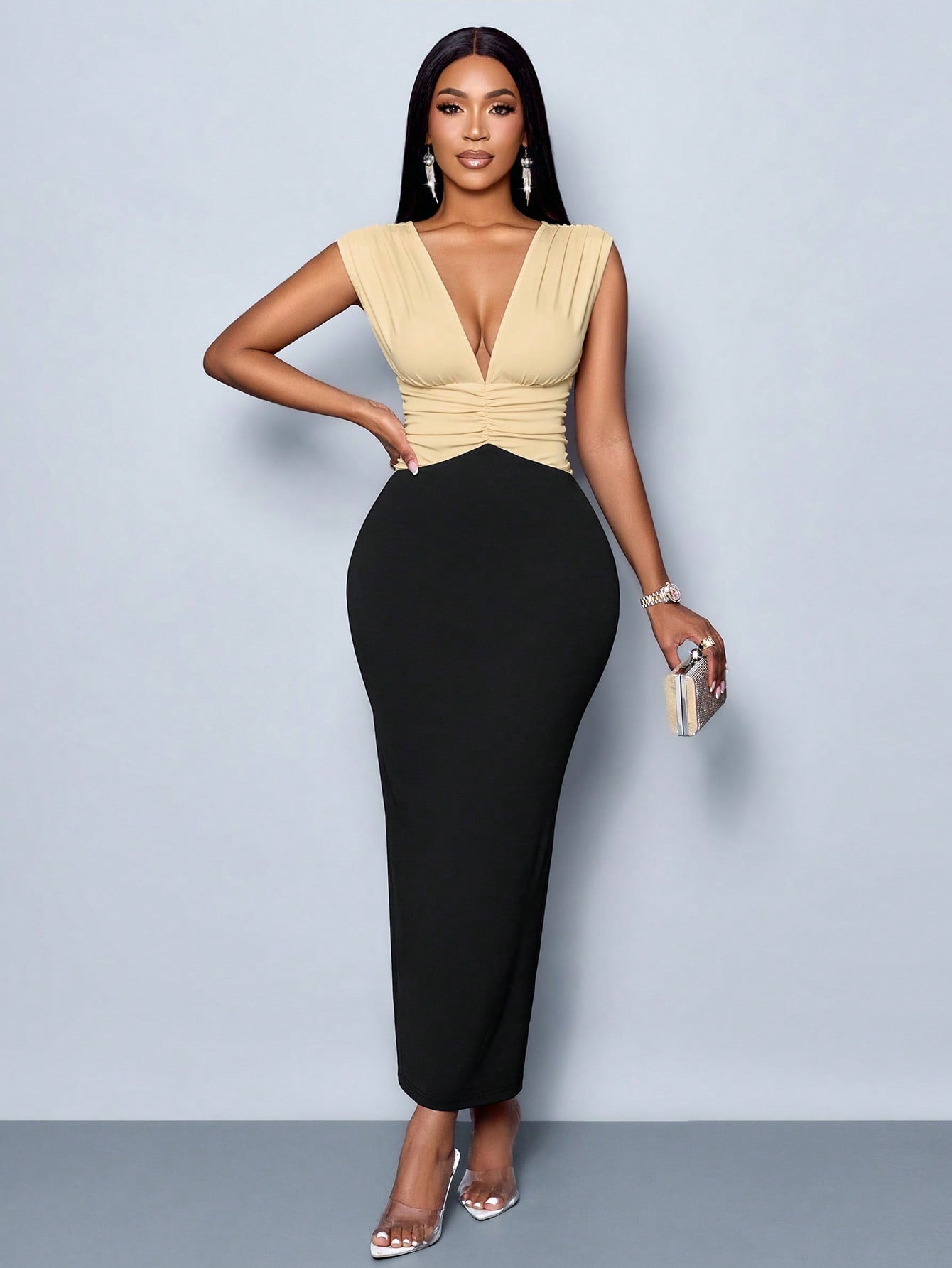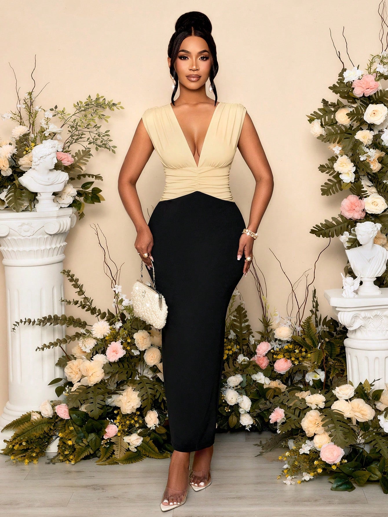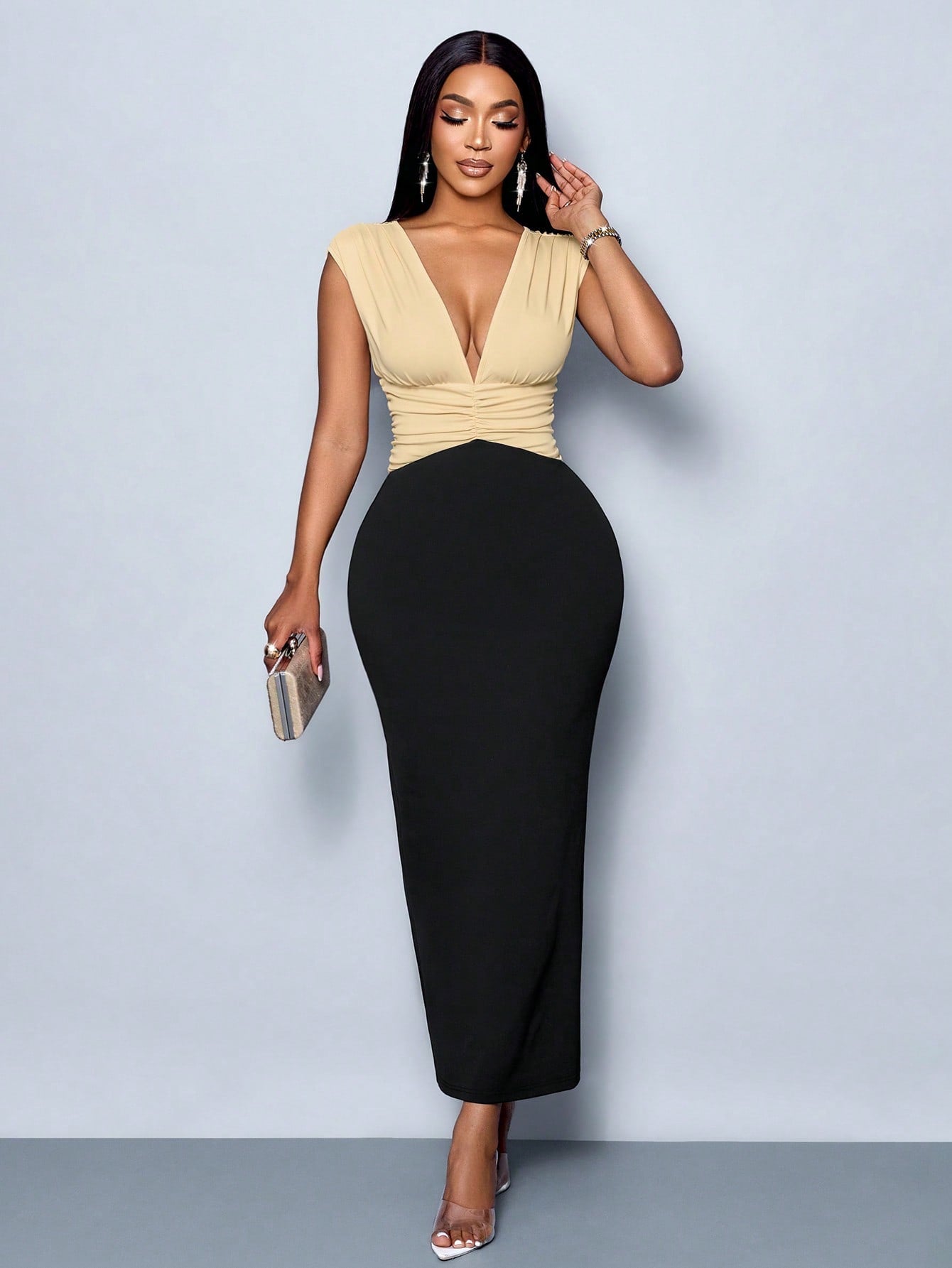 SOLERSUN 2025 Women's Spring And Summer Fashion Commuting Business Elegant Sexy Valentine's Day Wedding Season Party Music Festival Beach Seaside Vacation Romantic Date Contrast Color Gathering Waist Modification Body Curve Black Apricot Long Skirt Two To