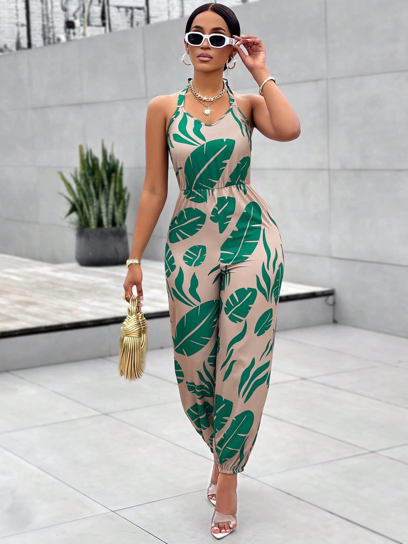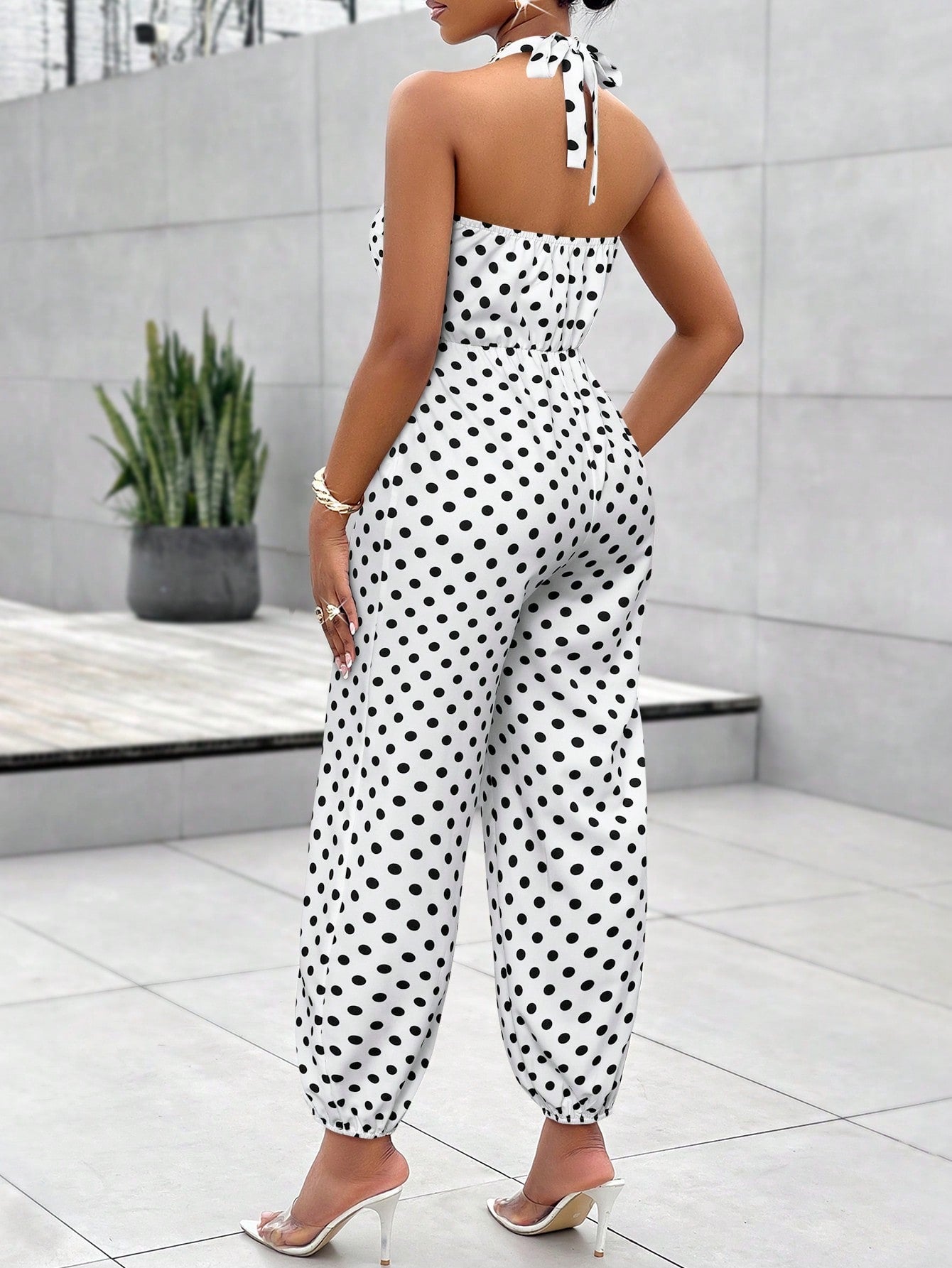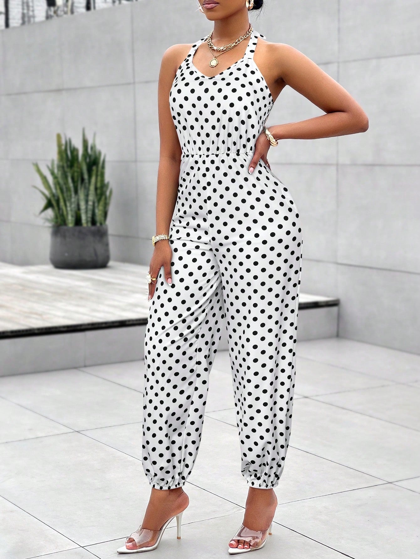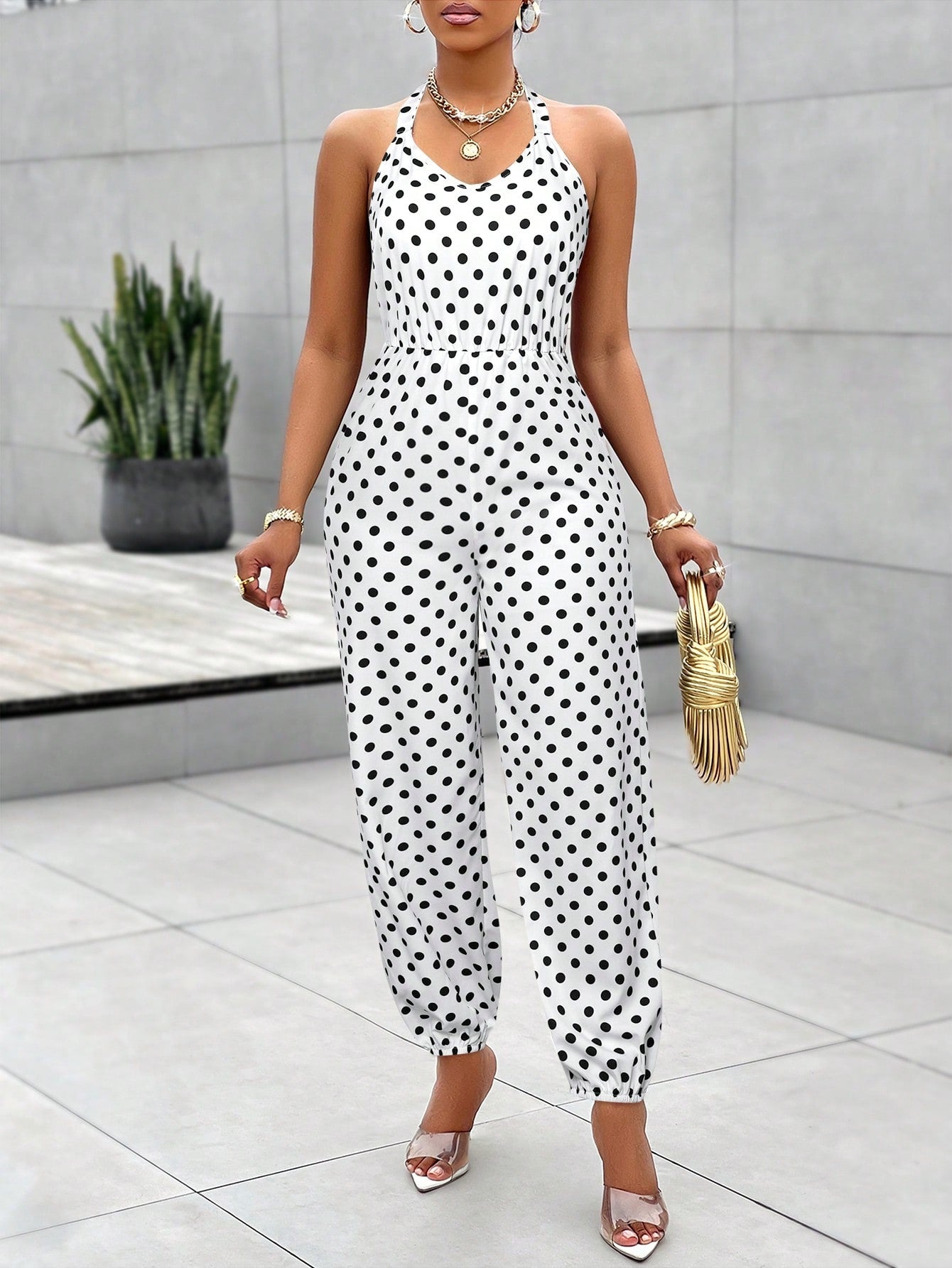 SOLERSUN Polka Dot Print Backless Halter Jumpsuit (Random Print)