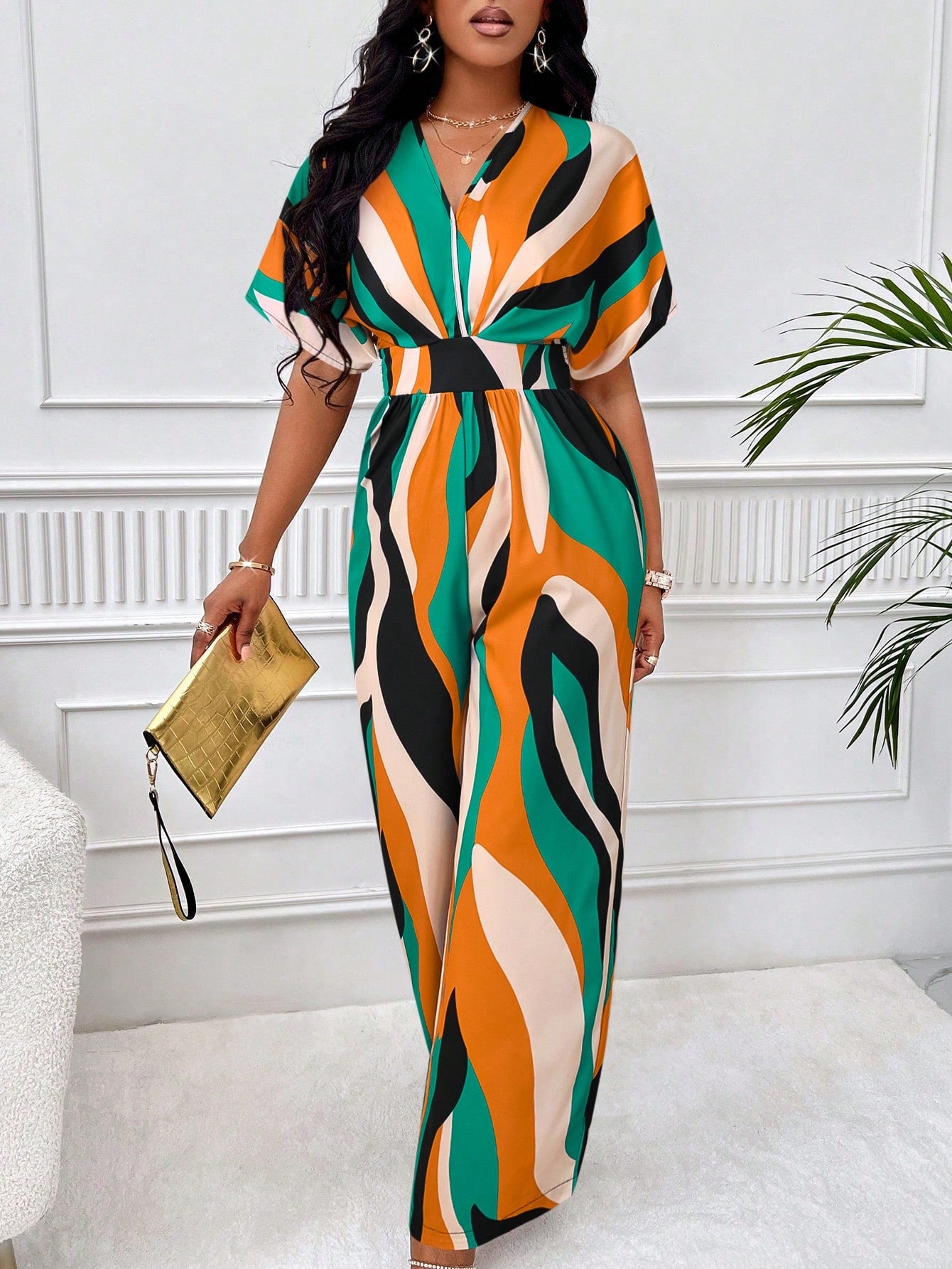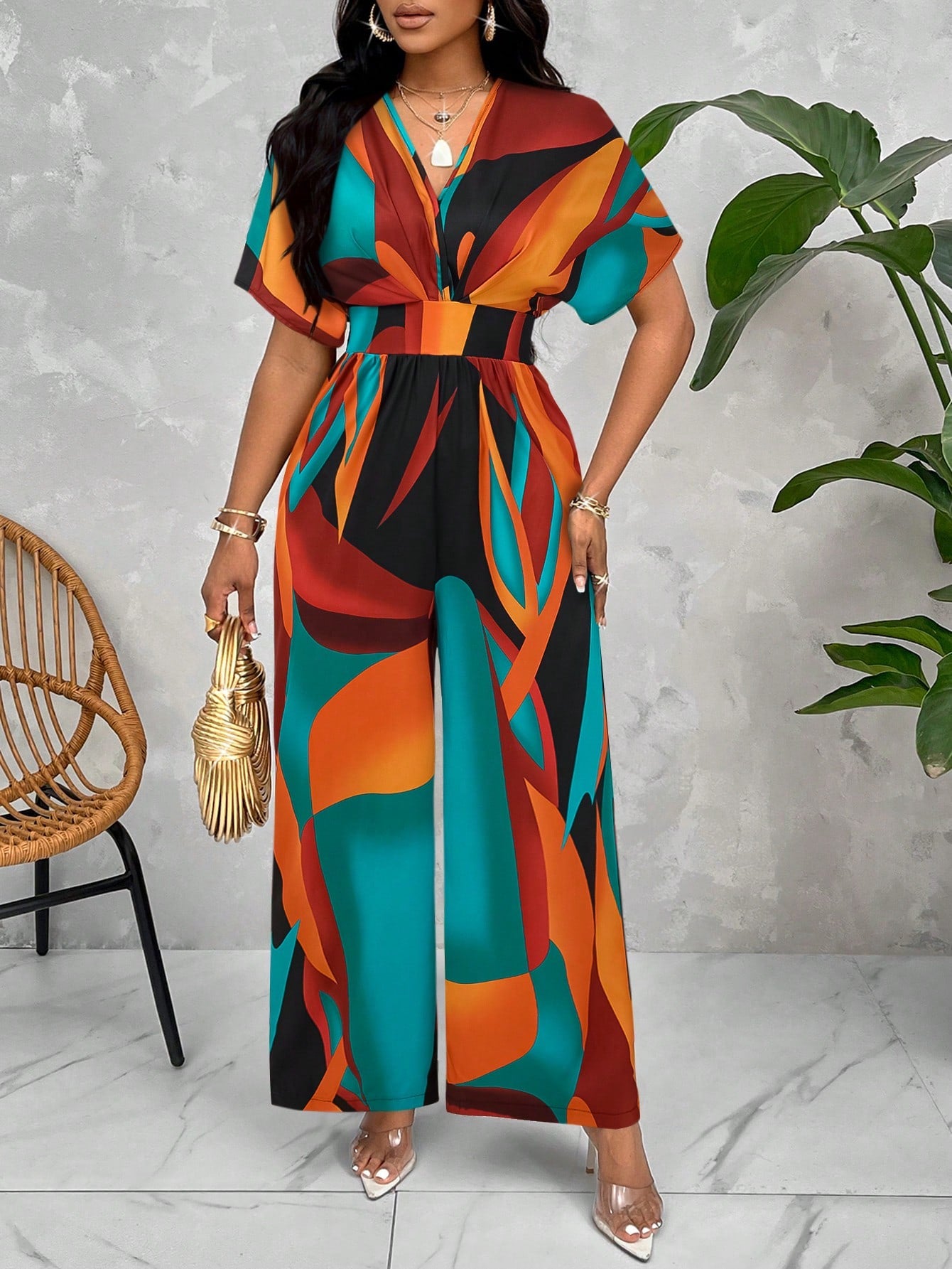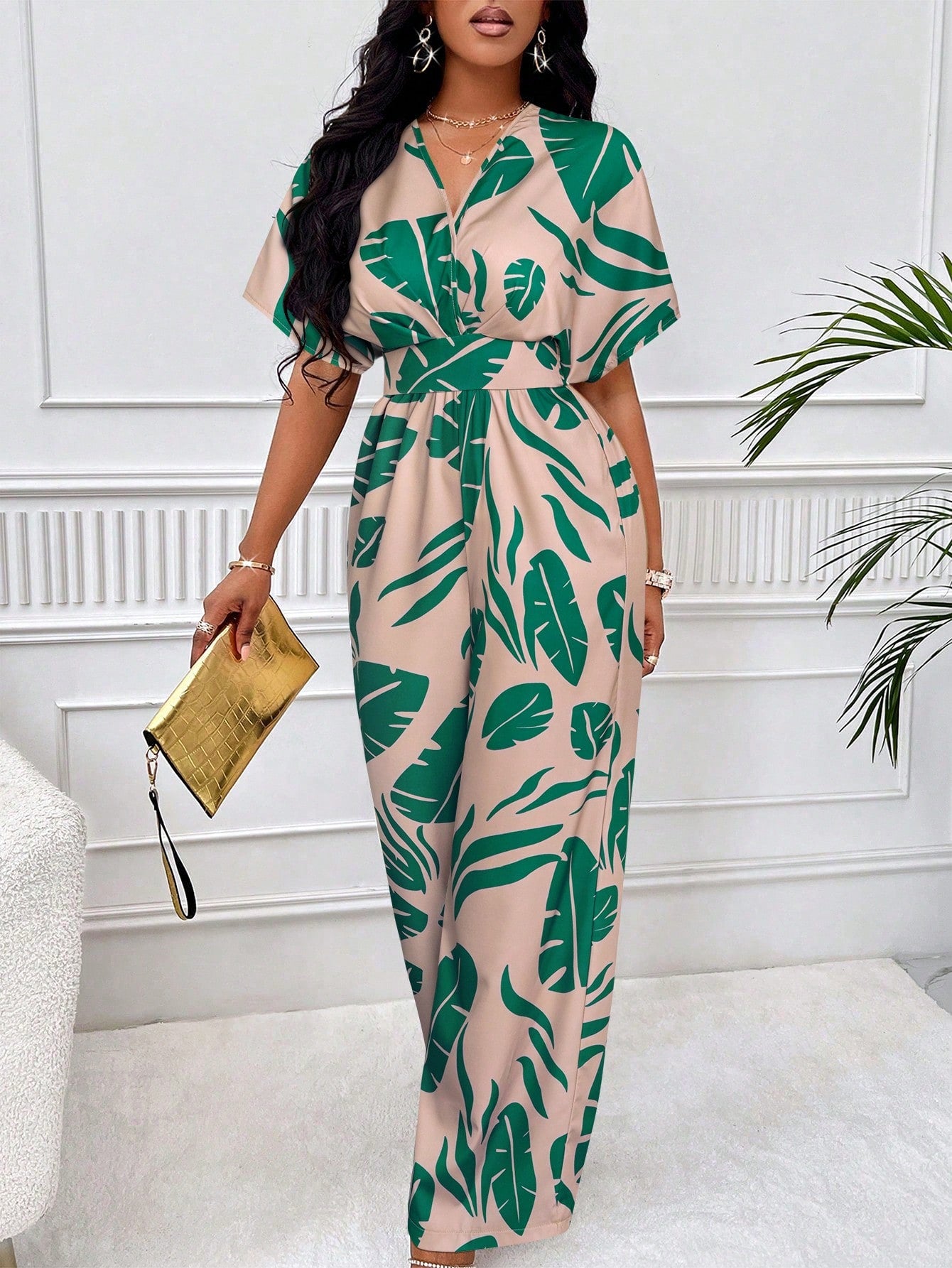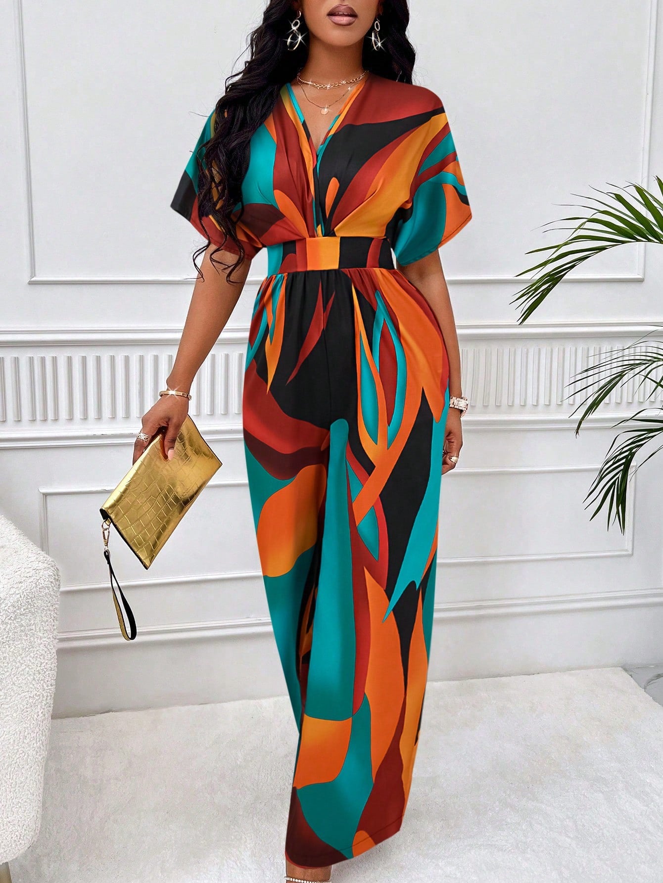 SOLERSUN Random Floral Graphic Printed Batwing Sleeve Belted Jumpsuit For New Year Clothes