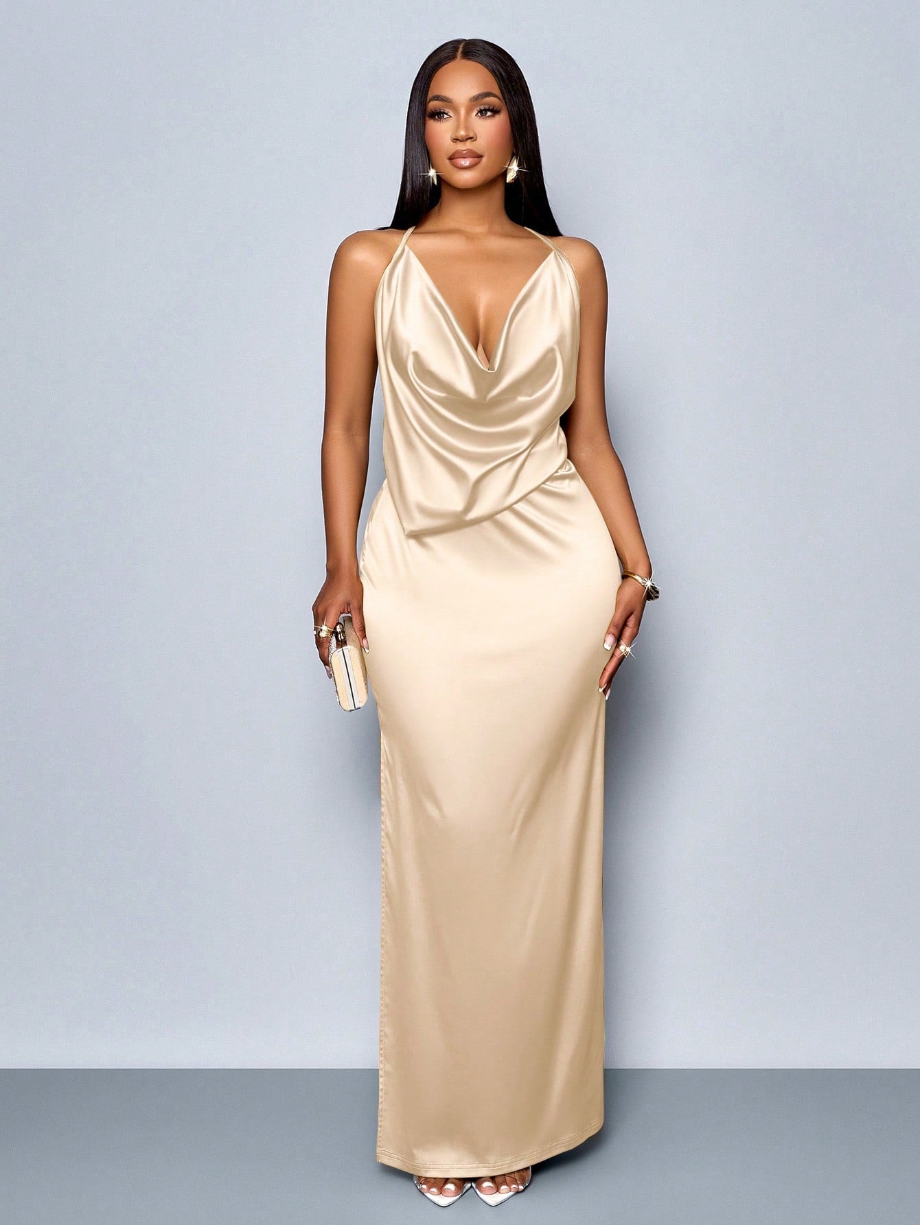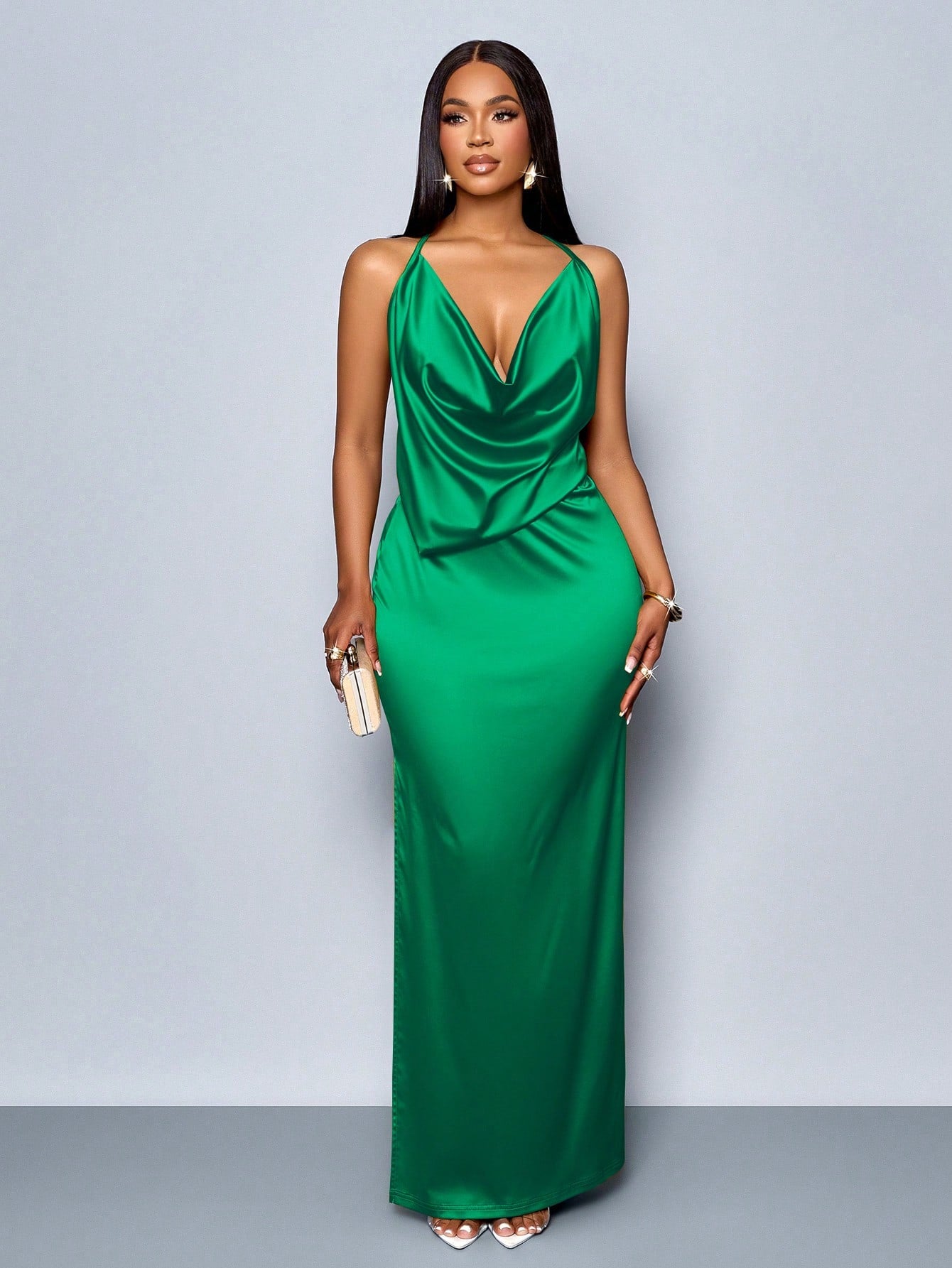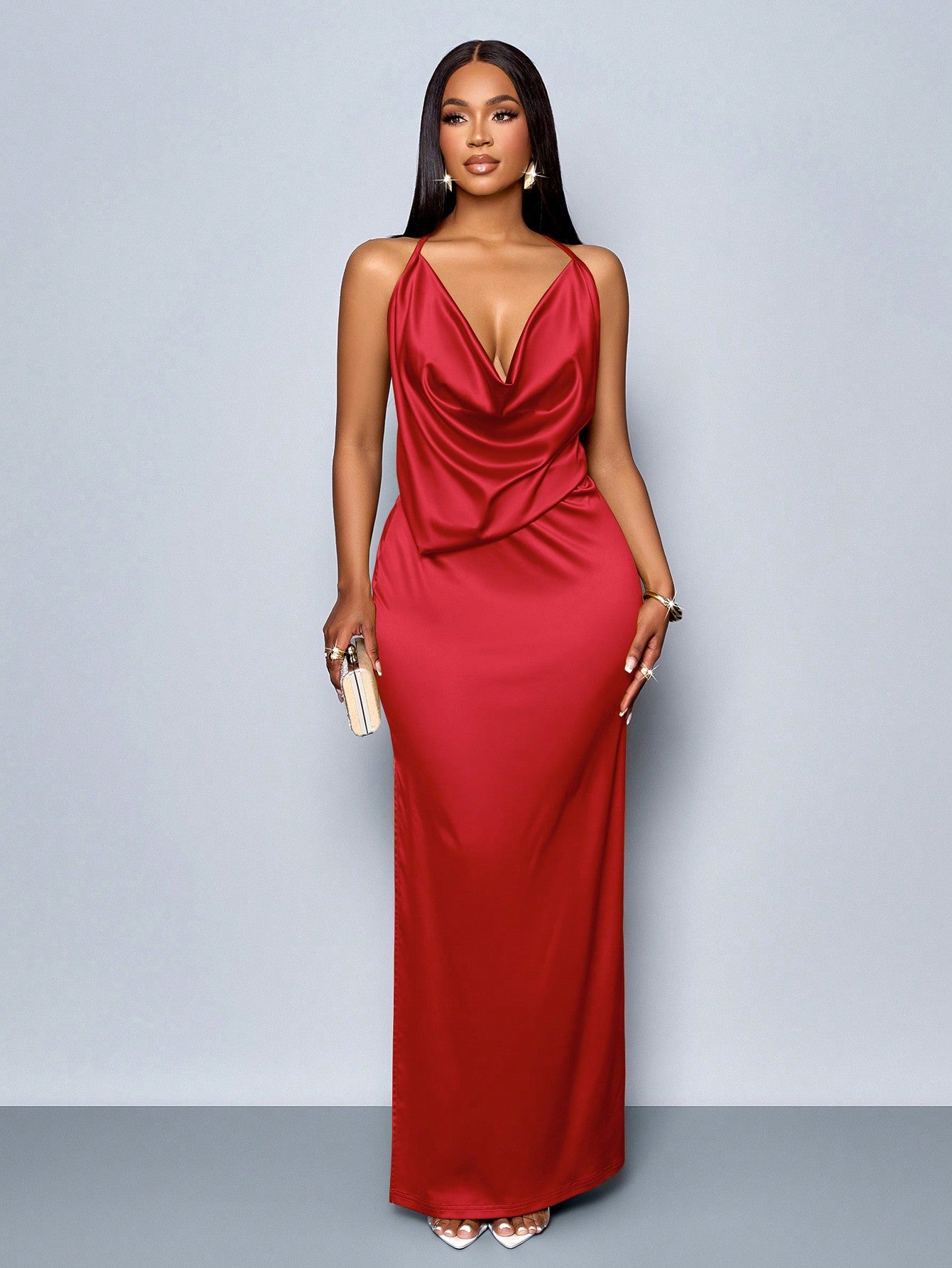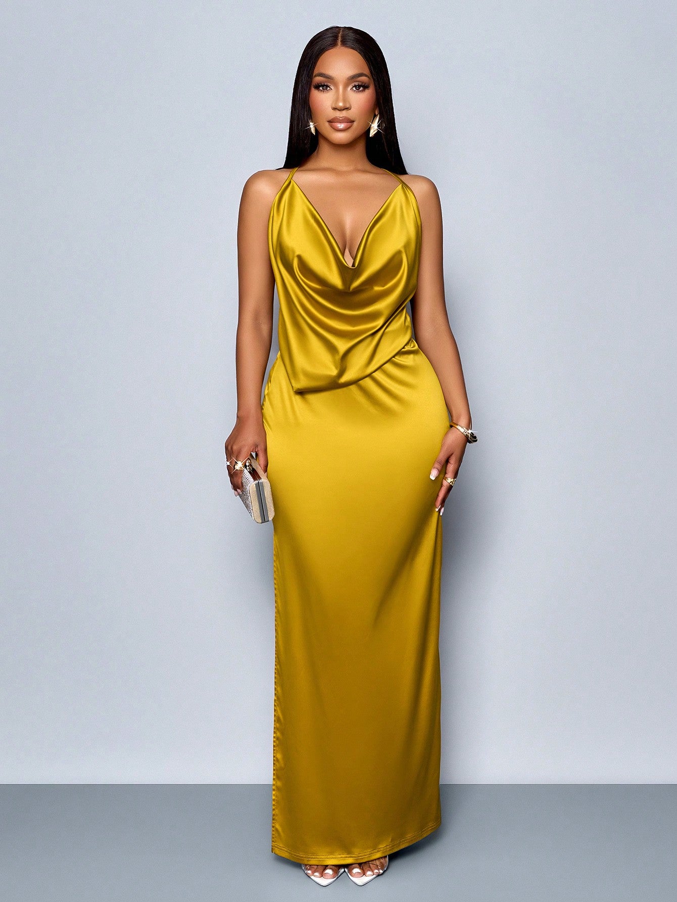 SOLERSUN Suitable For Christmas Party Vacation & Dating Elegant Solid Color Draped Collar Backless High Slit Satin Elegant Bodycon Dress,Valentine's Day Dating