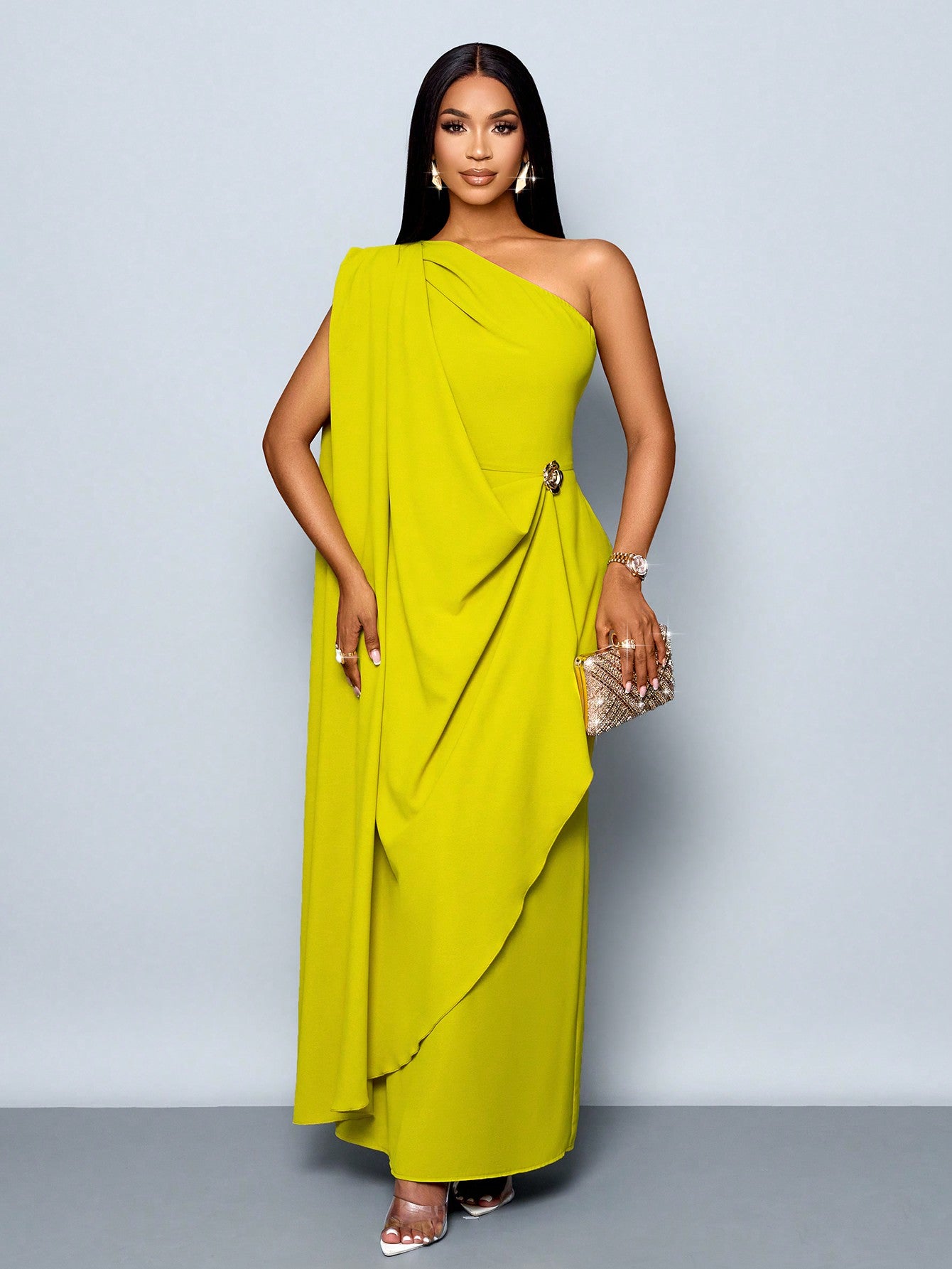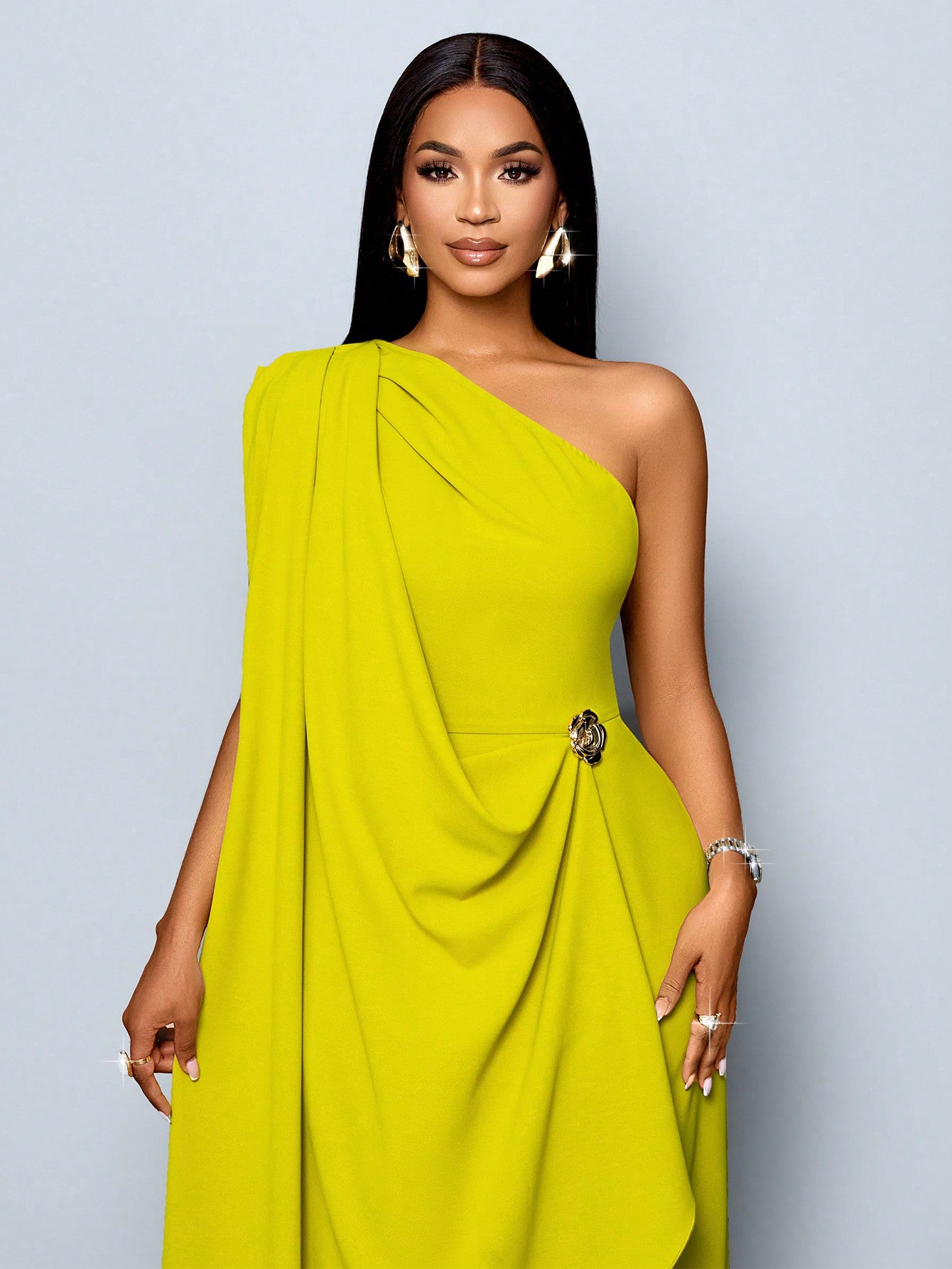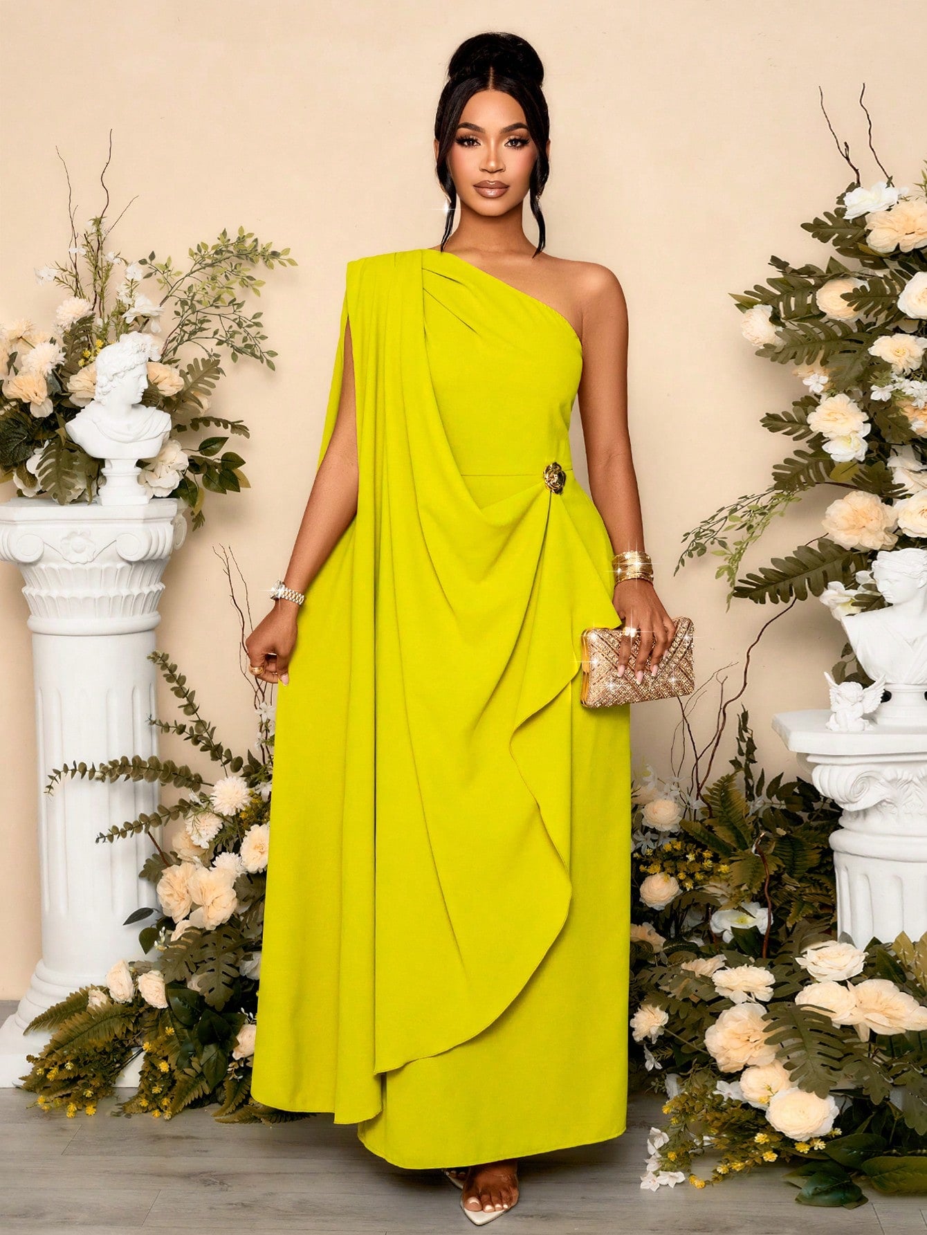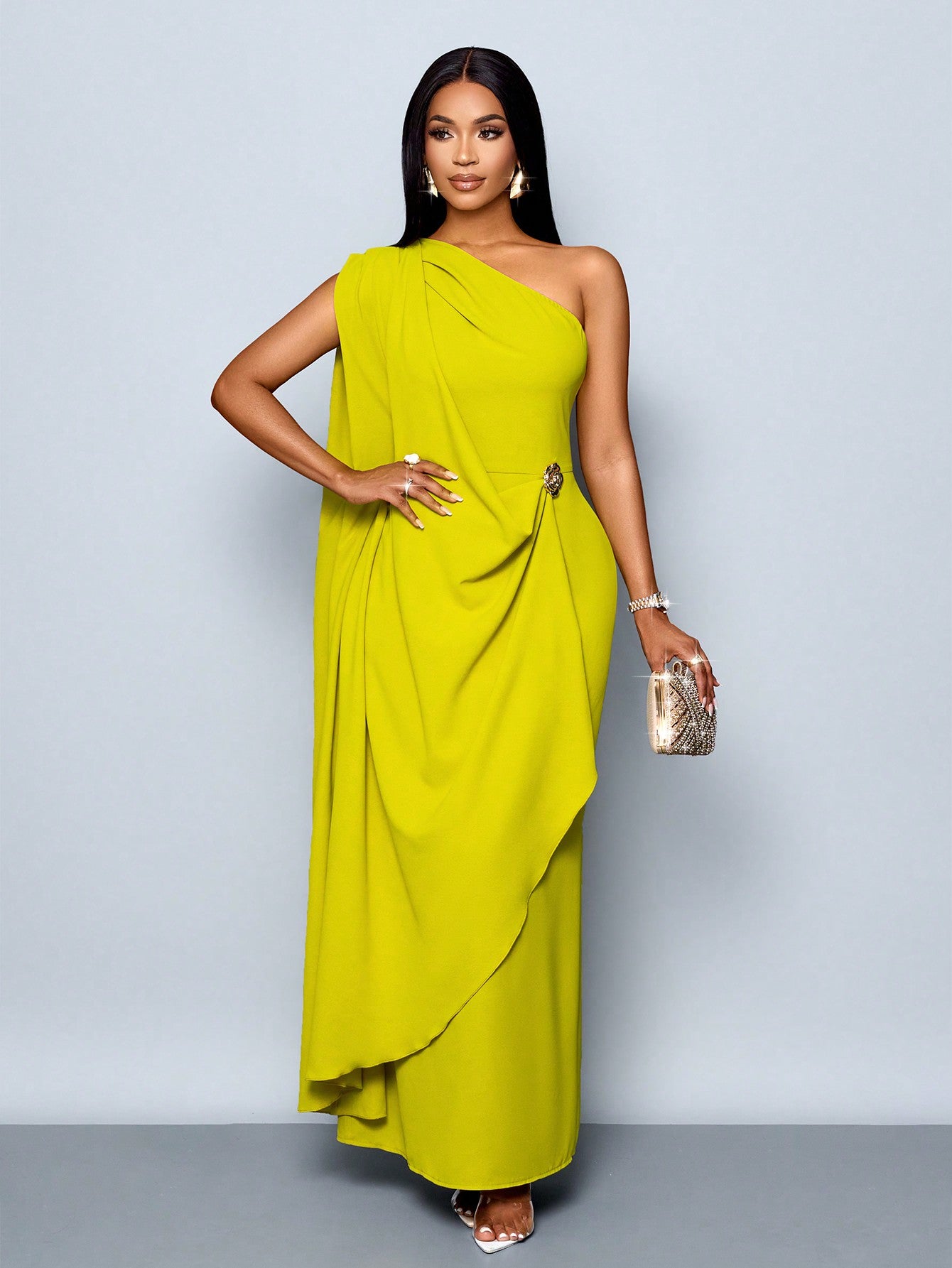 SOLERSUN Women's Fashionable Elegant Draped One Shoulder Maxi Dress With Gold Trim Detail Asymmetrical Dress