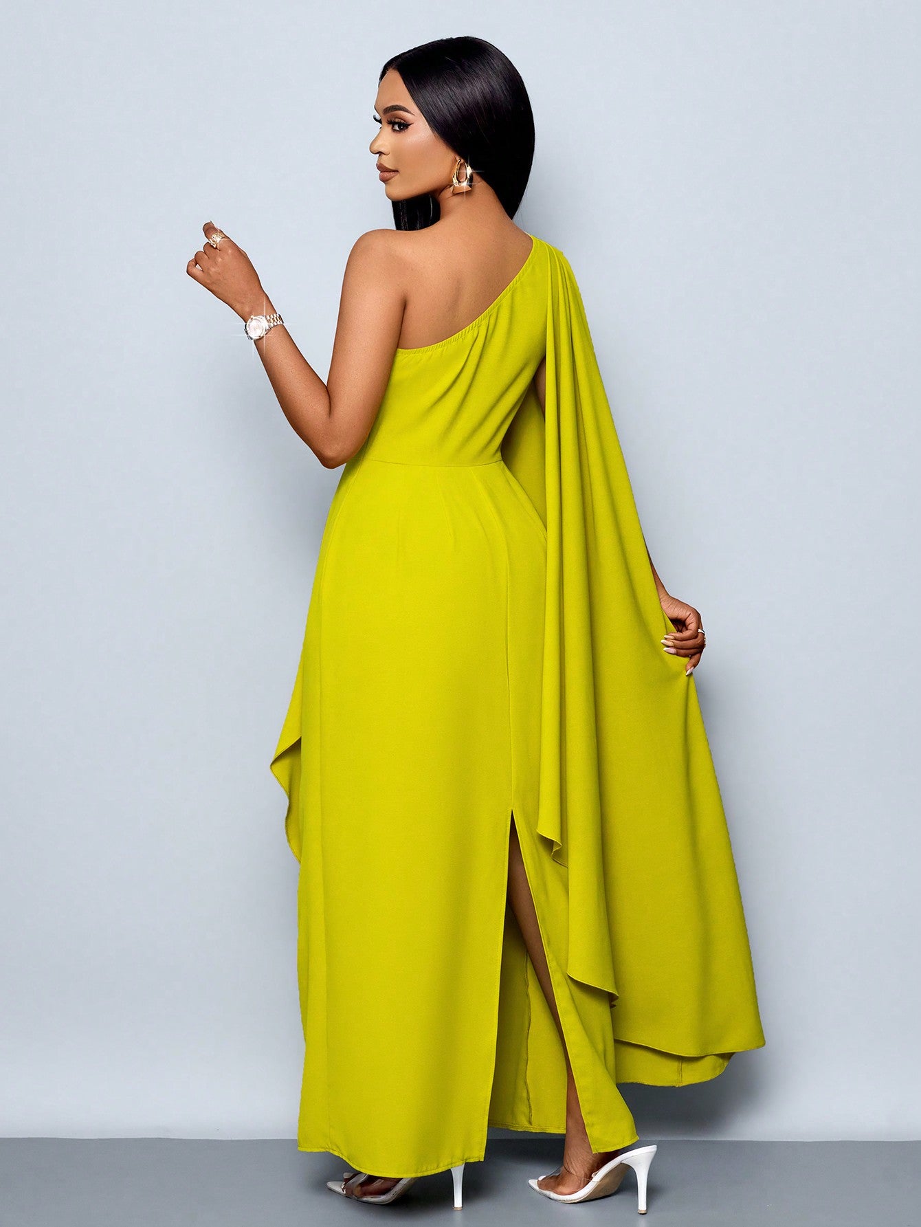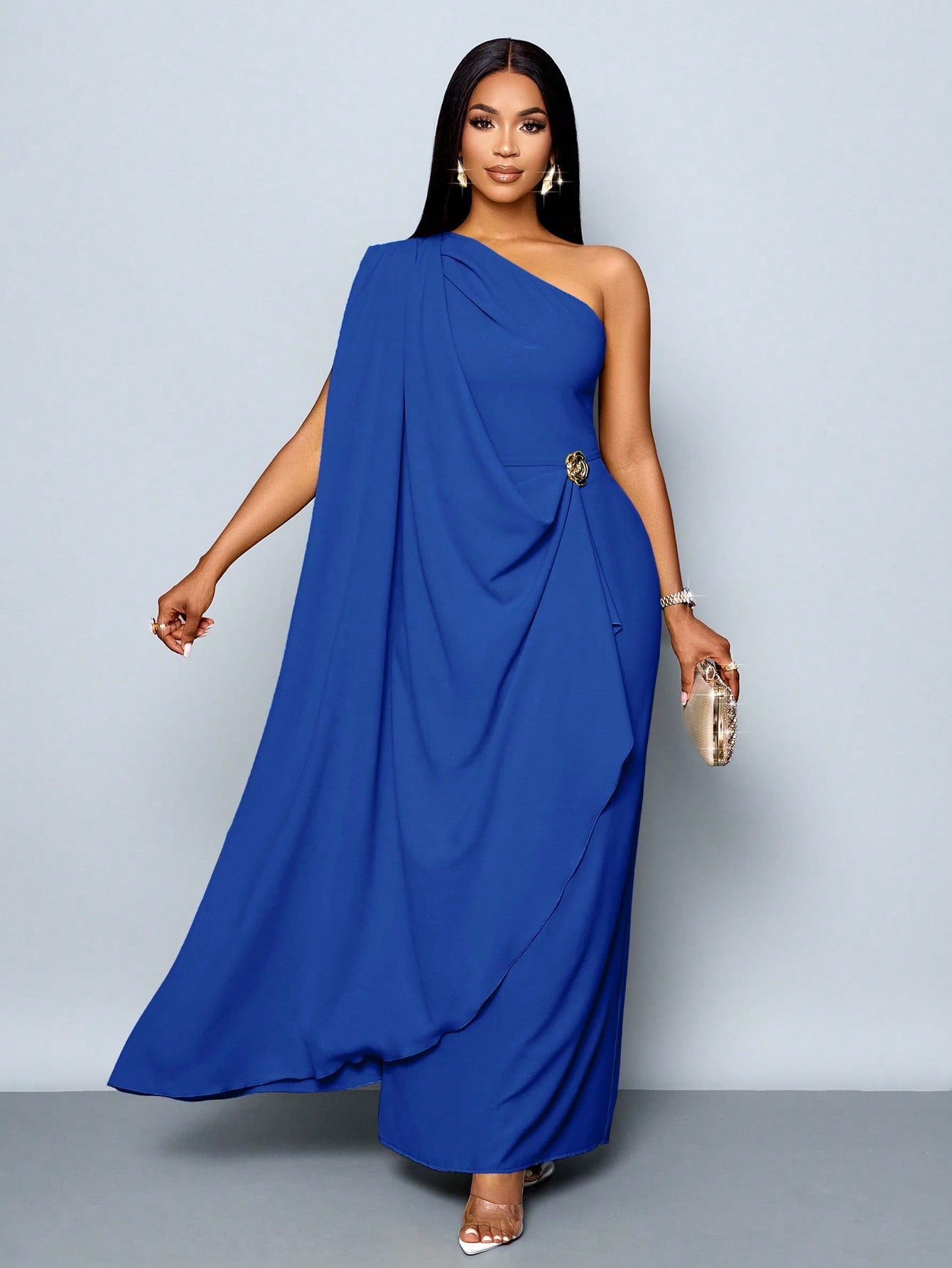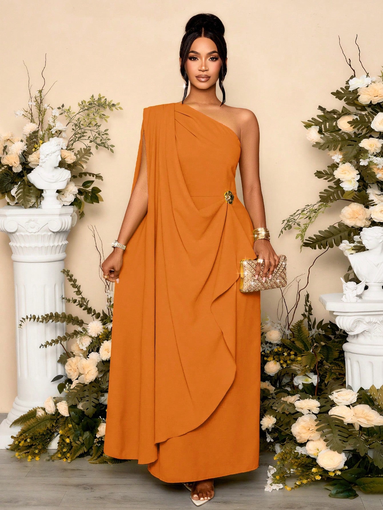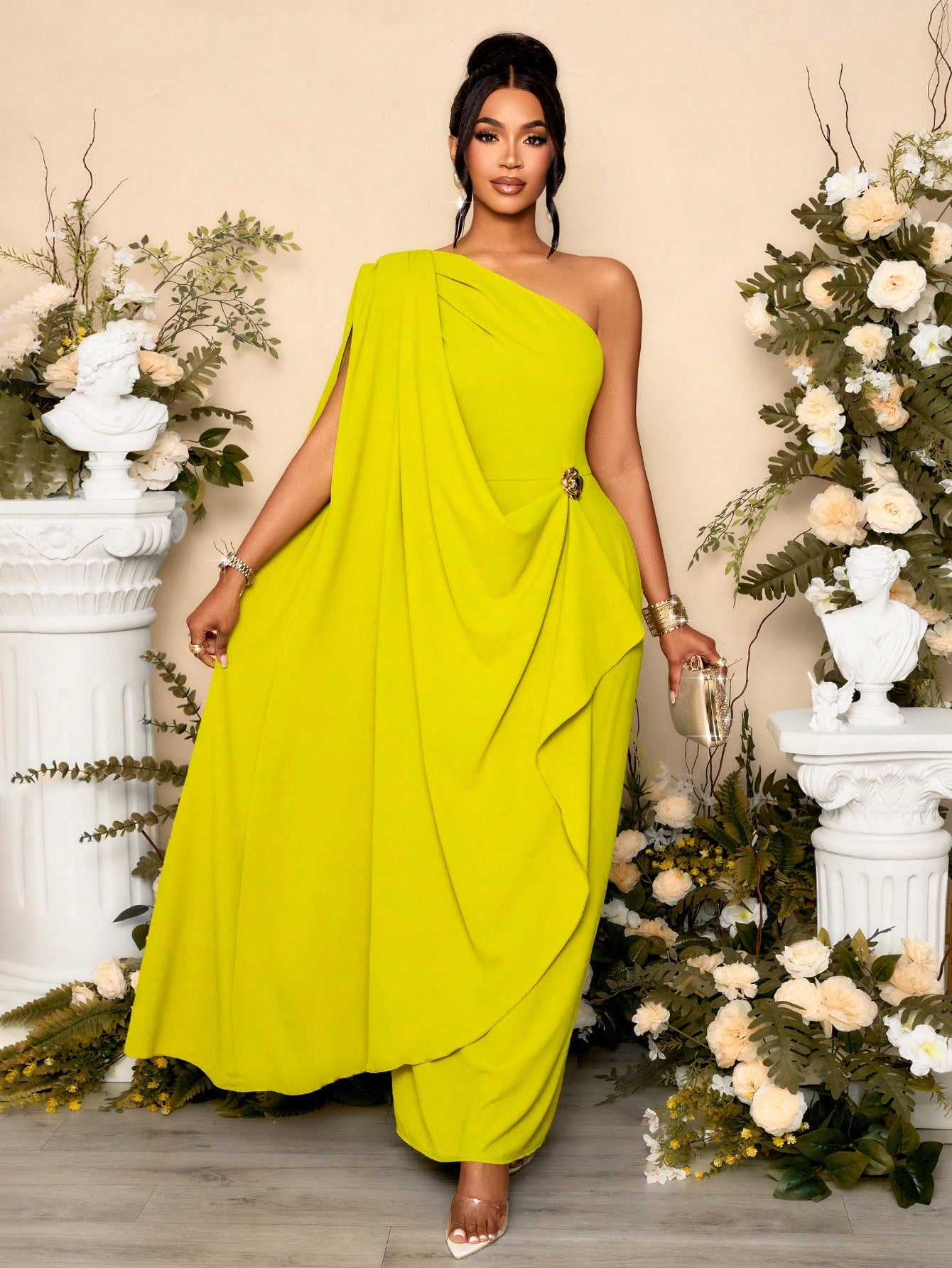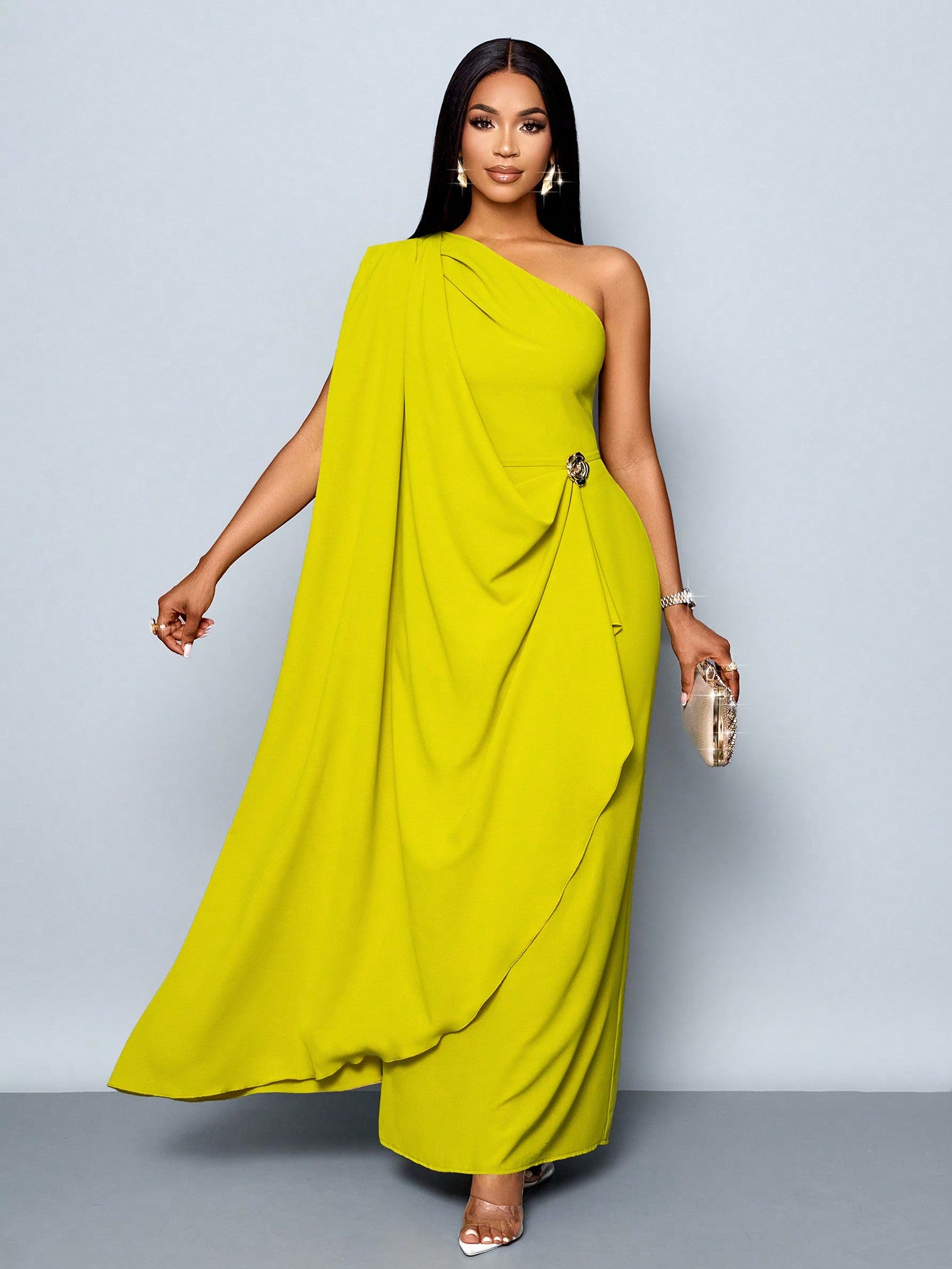 SOLERSUN Women's Fashionable Elegant Draped One Shoulder Maxi Dress With Gold Trim Detail Asymmetrical Dress