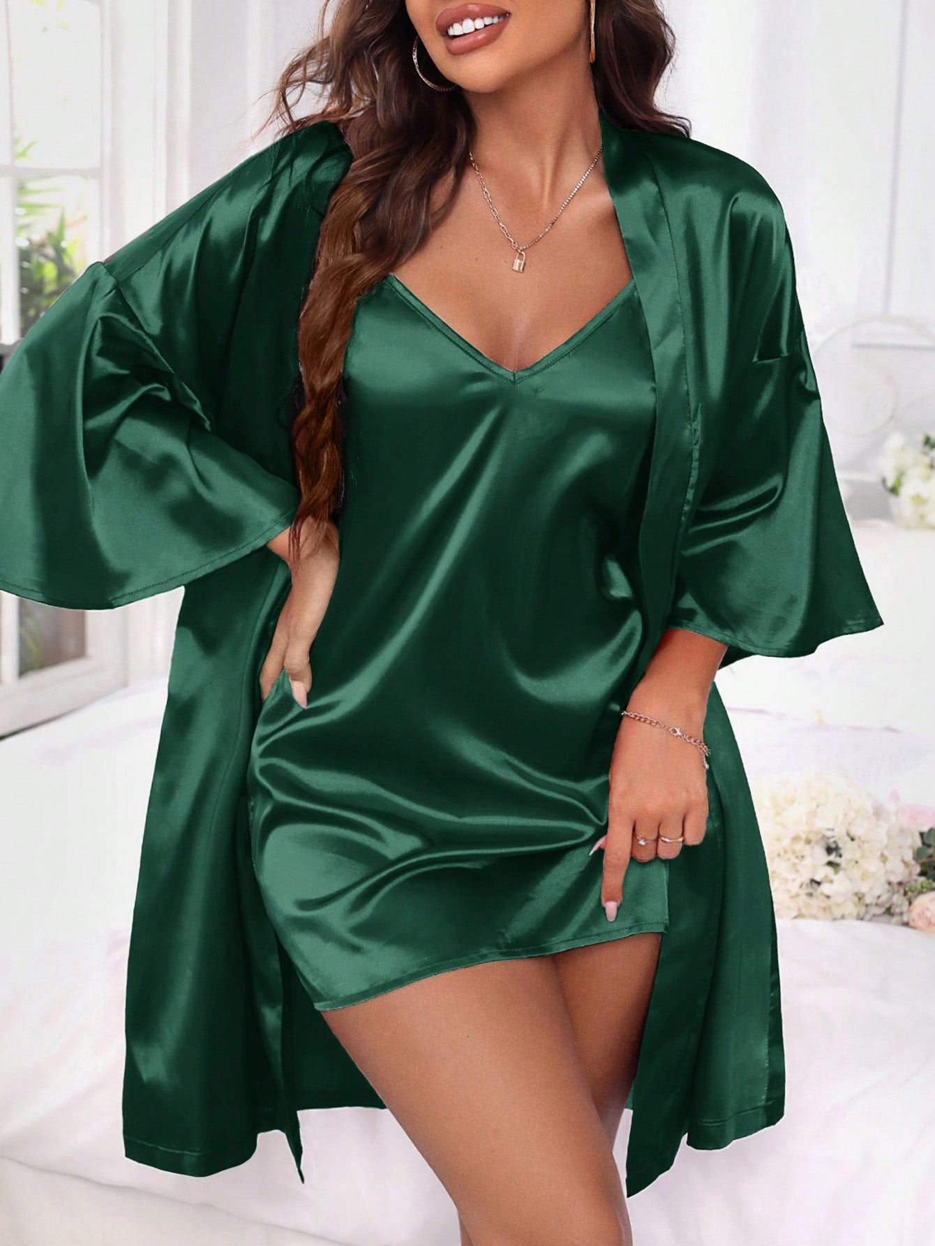 Solid Satin Nightdress & Drop Shoulder Belted Robe Pajama Set
