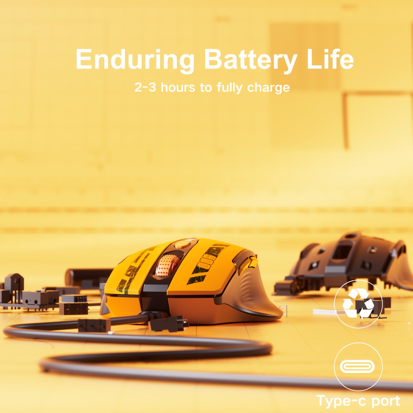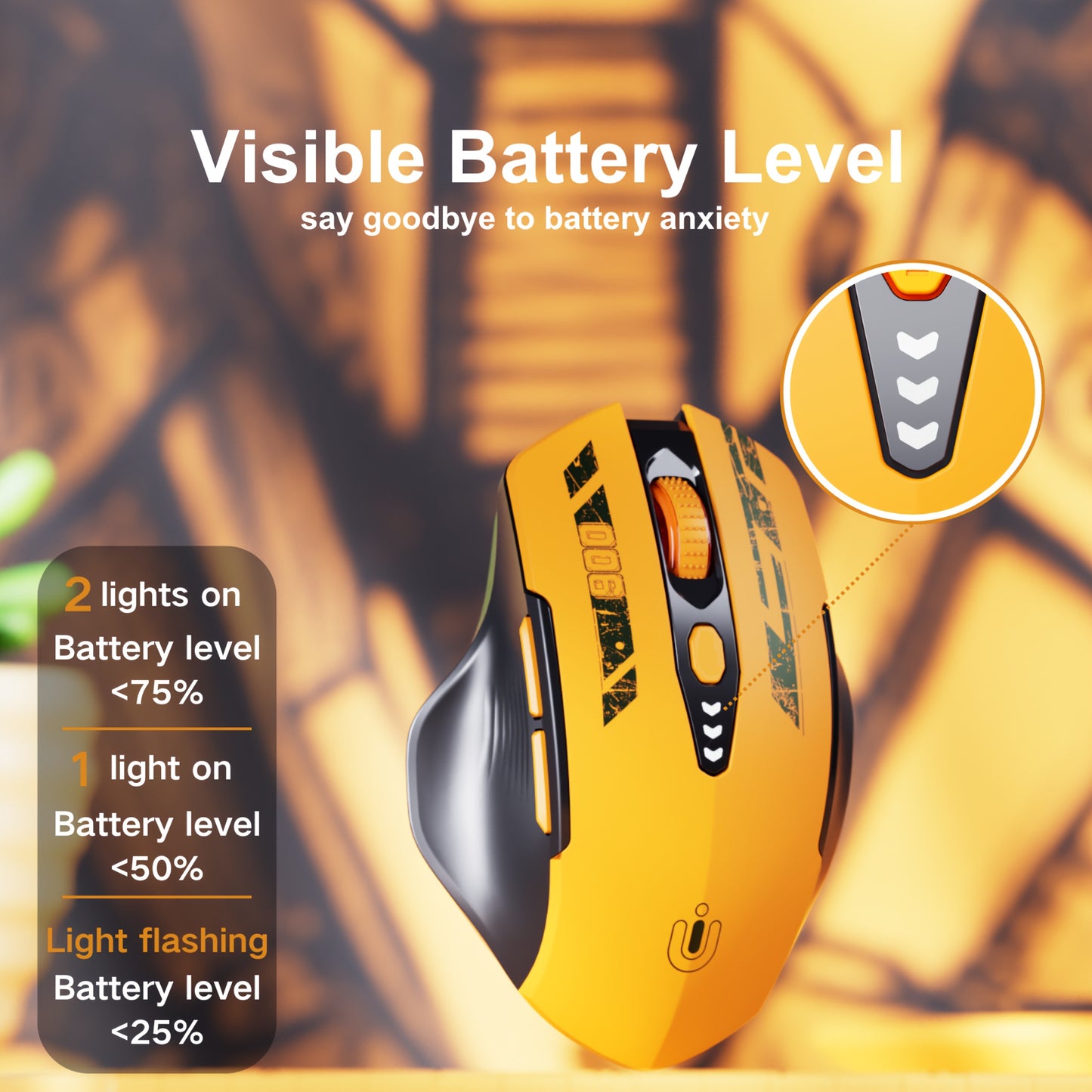 Souris BT Tri-mode - Niveau de Batterie Visible, Souris Sans Fil Ergonomique Rechargeable, Six Boutons, Compatible Multi-appareils - pour Ordinateur Portable, PC - Prête pour l'Étude et le Jeu - Jaune