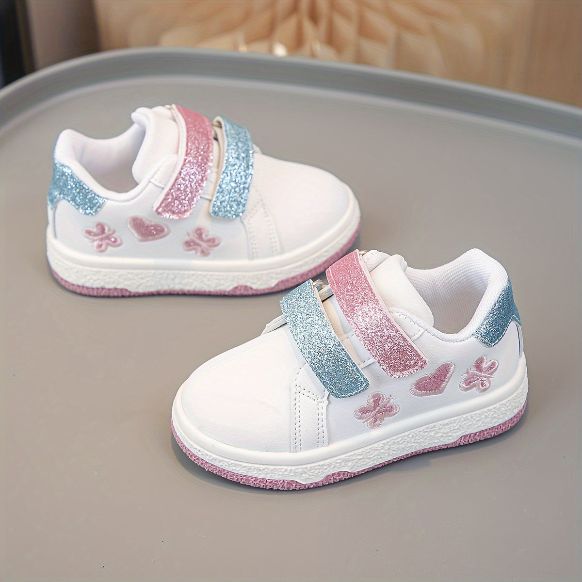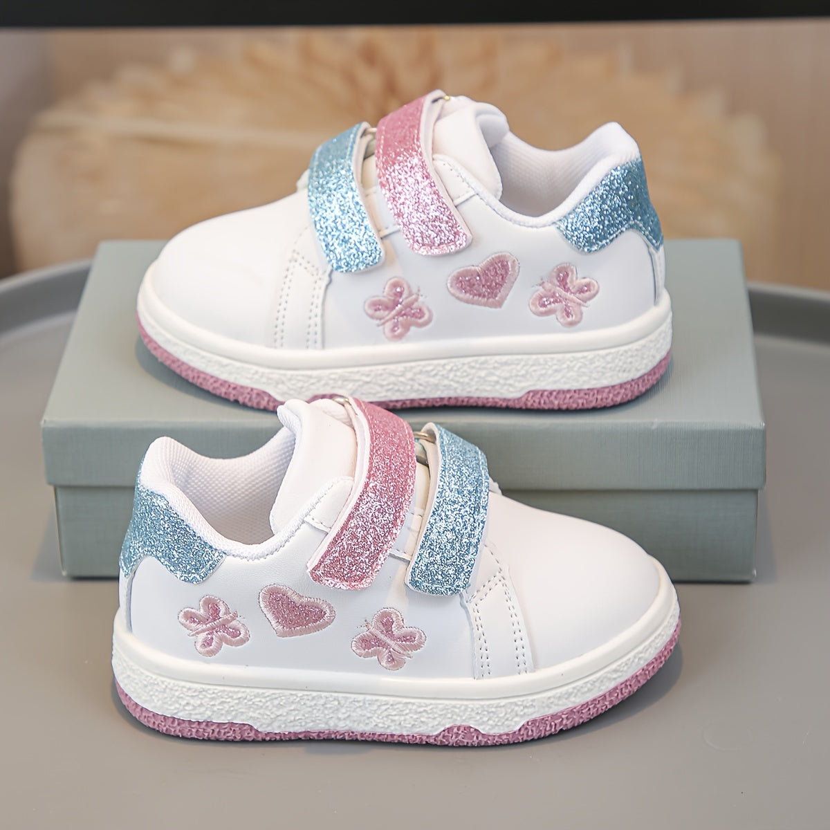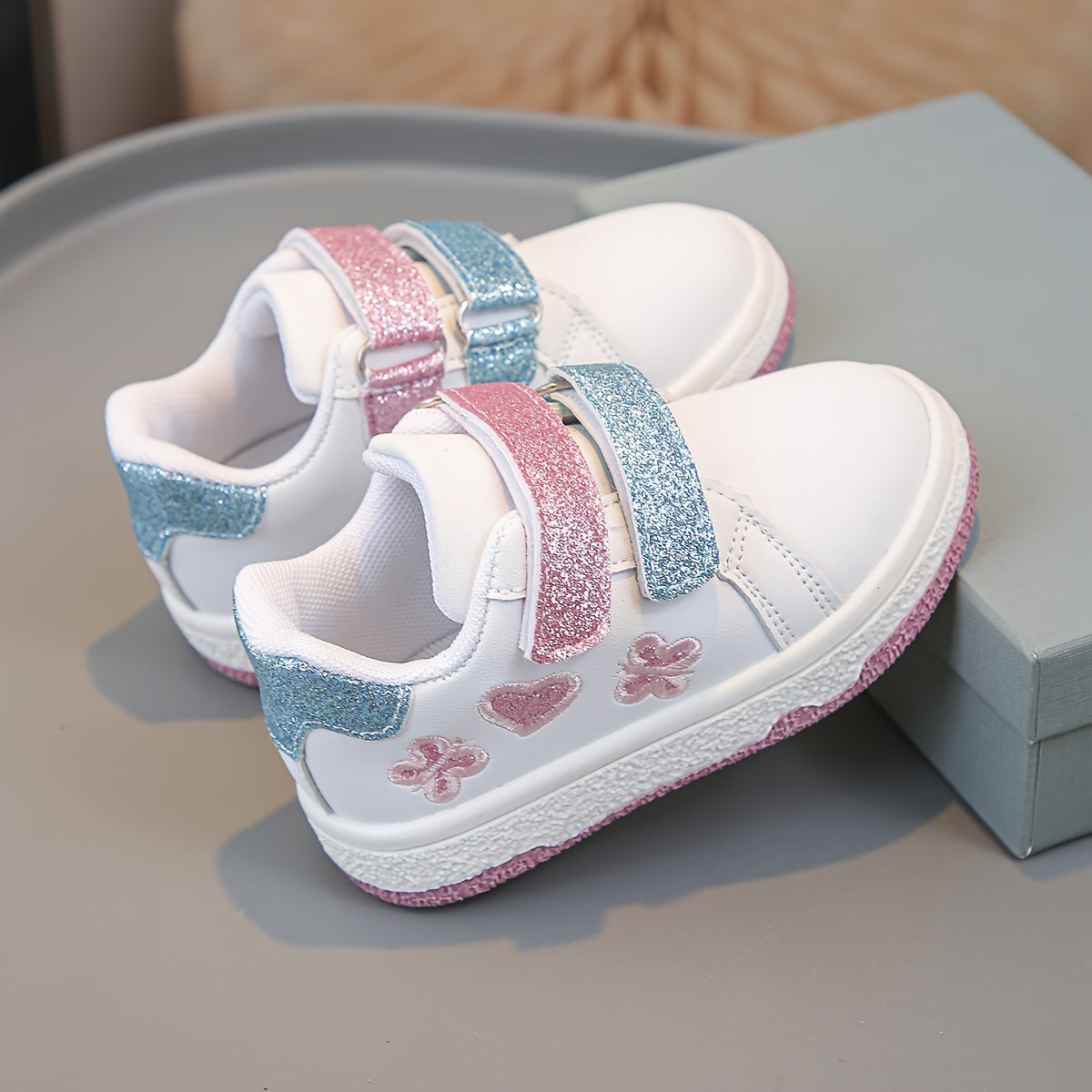 [Sparkly Sneakers] Cute Sparkly Two-Tone Girls' Sneakers | Hook-and-loop Fastener Strap, Heart Embroidery, Casual Low-Top in White, Blue & Pink for All Seasons