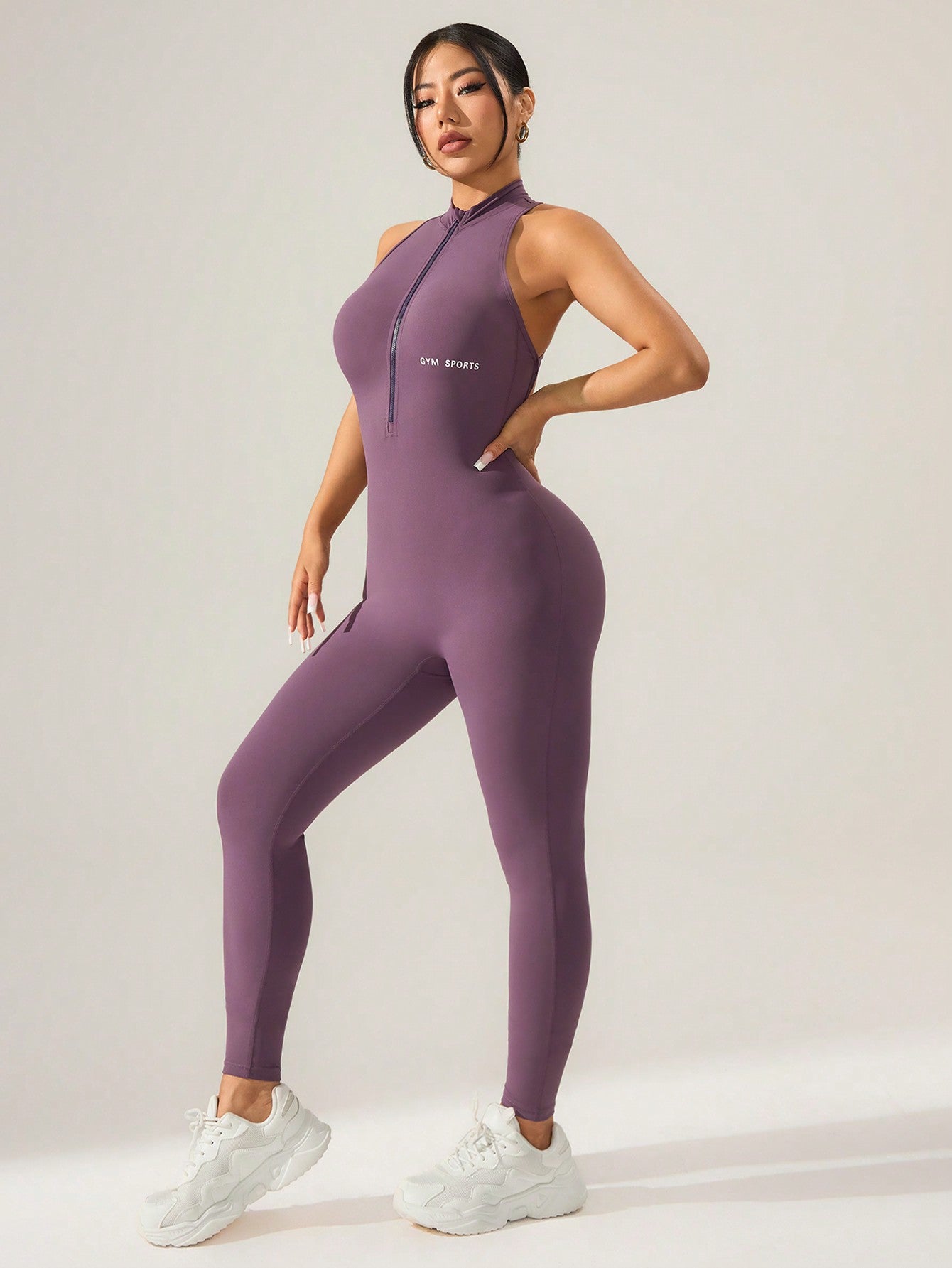 Sport Gameset Women Letter Print Zipper Half Placket Daily Fitness Tank Top With Jumpsuit Pants