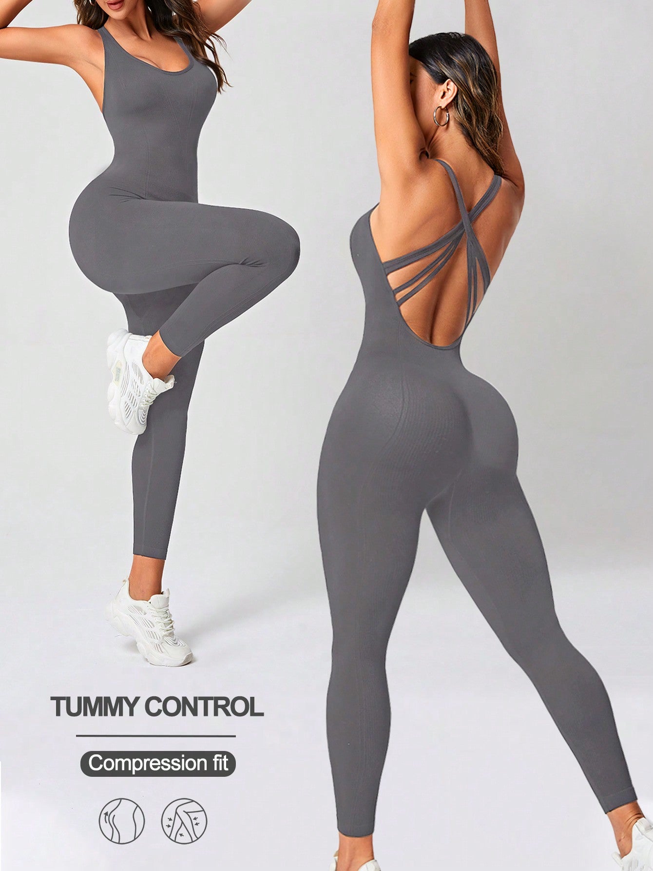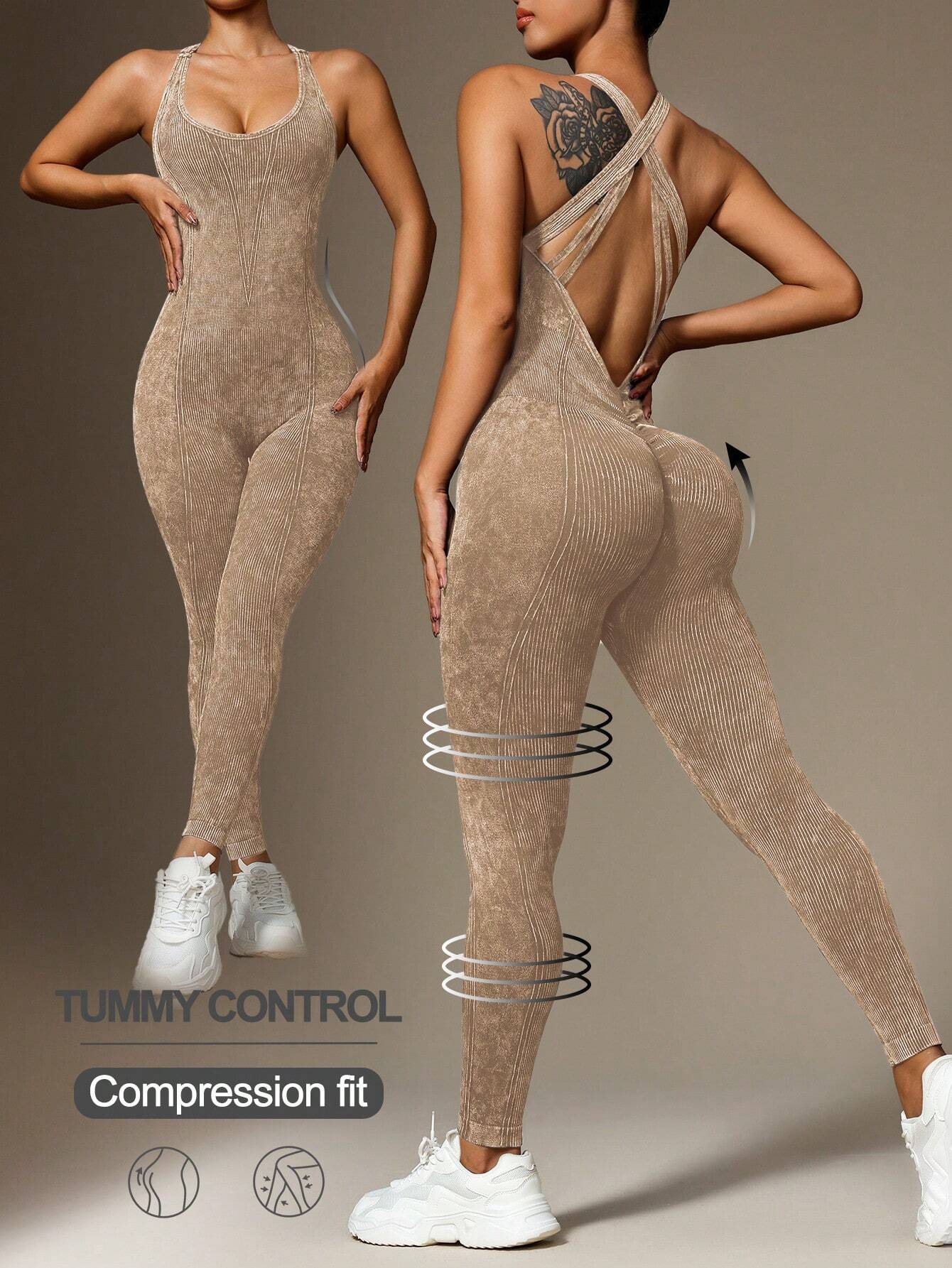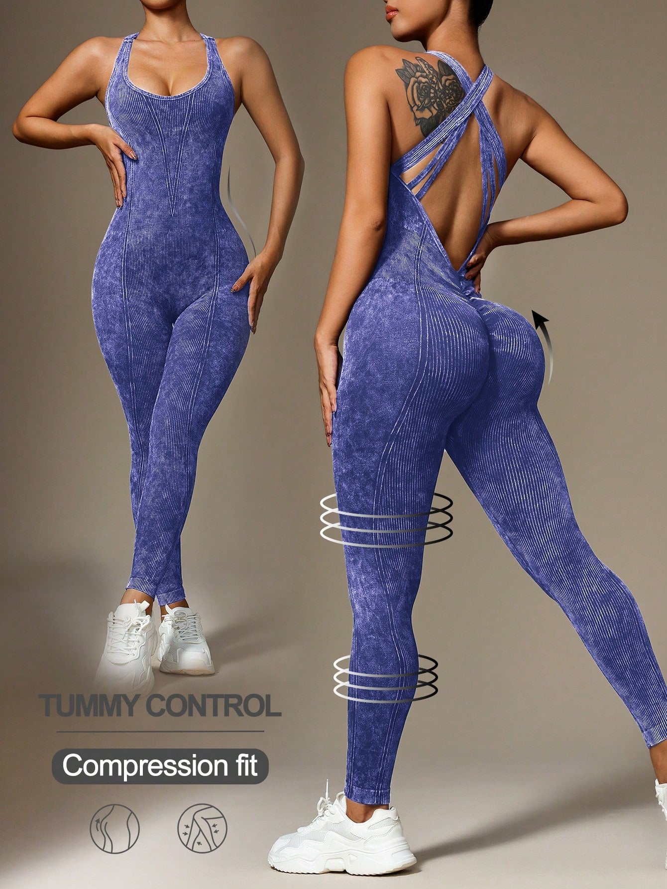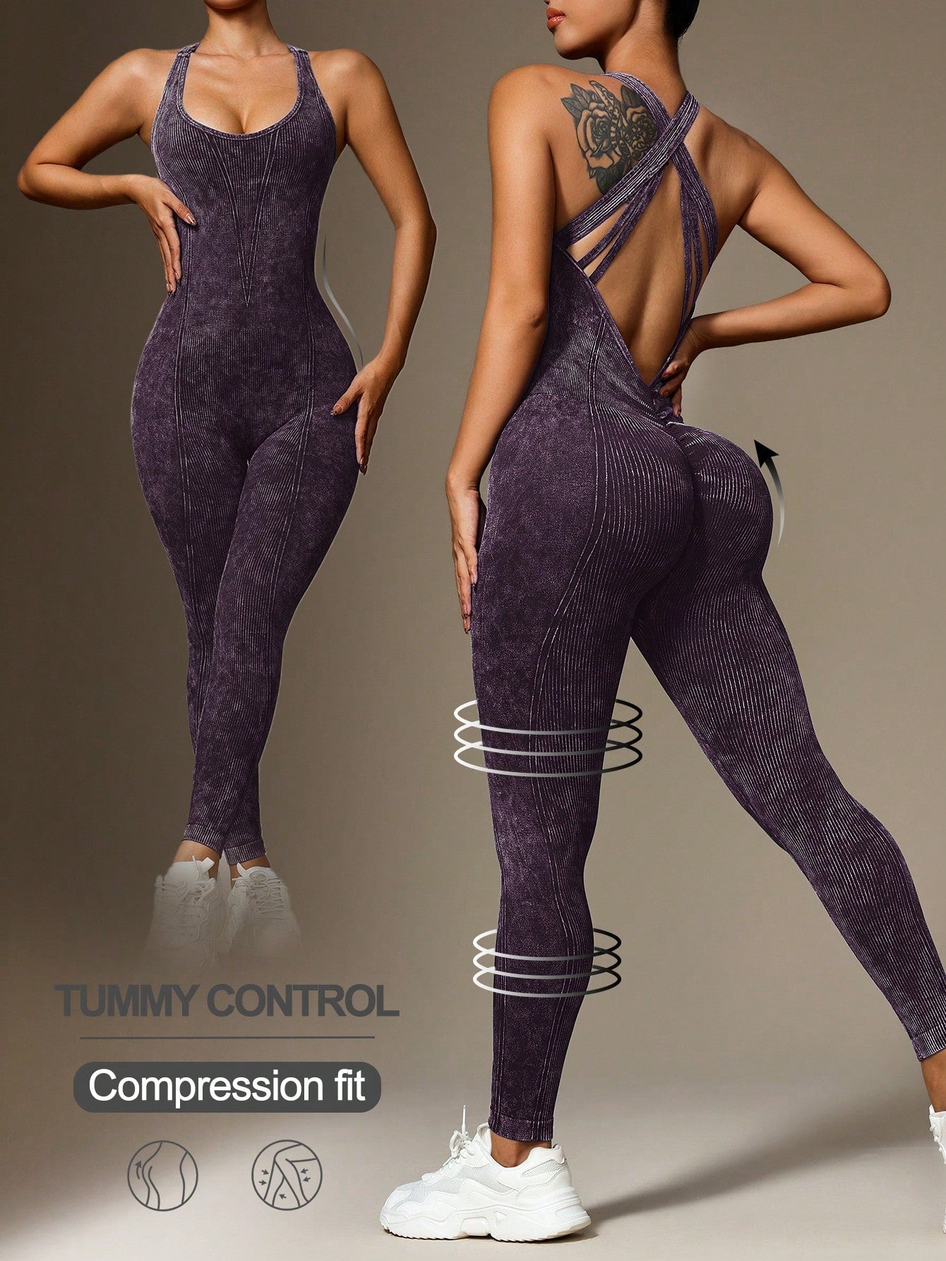 Sport Studio Women's Acid Wash Criss-Cross Back Sports Jumpsuit