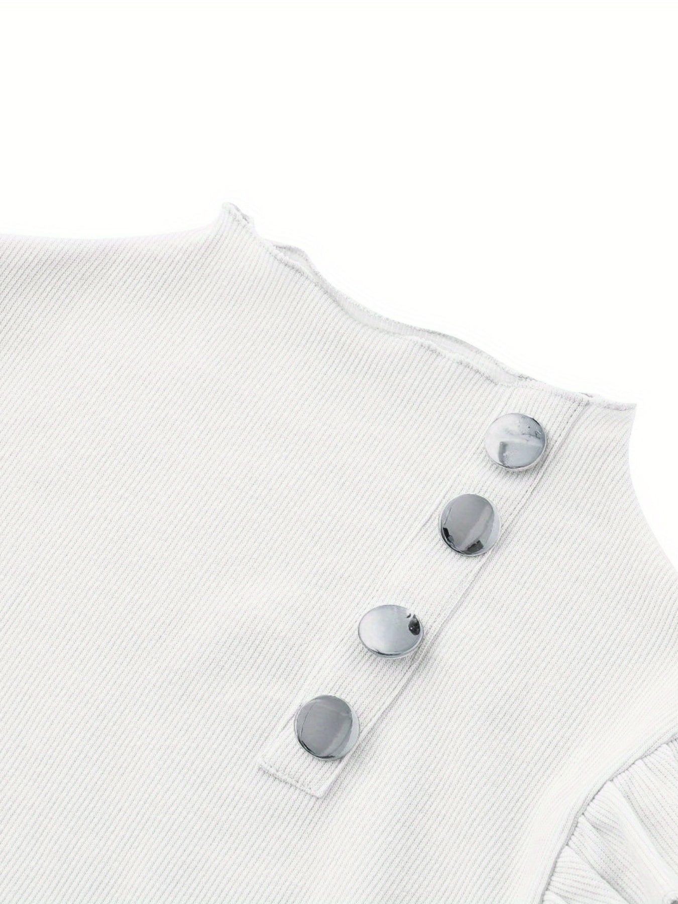 Stretchy Chic Ribbed Knit Long Sleeve Top - Mock Neck, Button Accents, Ruffle Detail - Elegant Casual Wear for Women