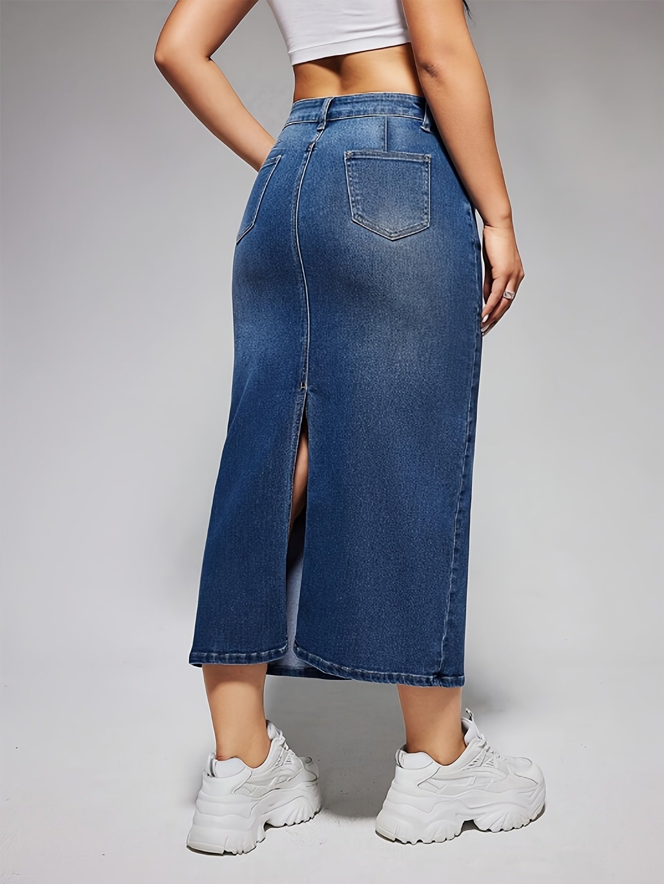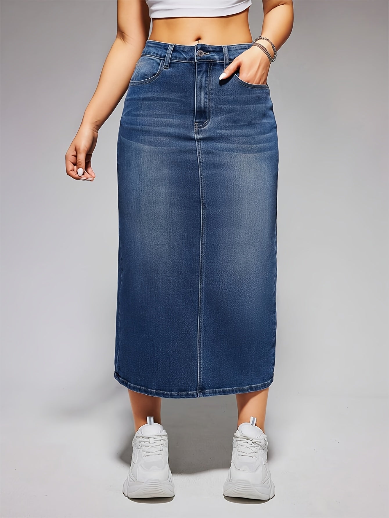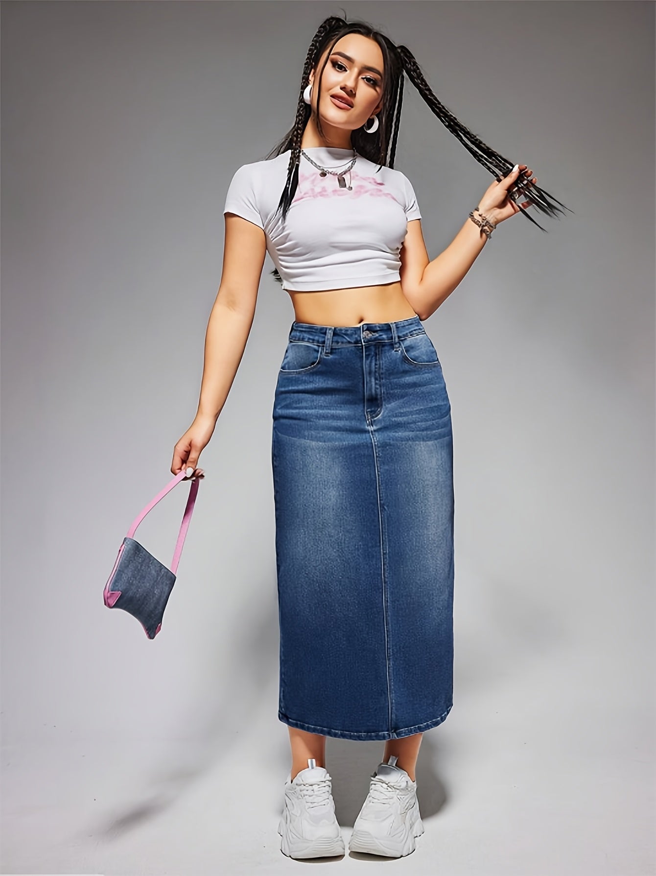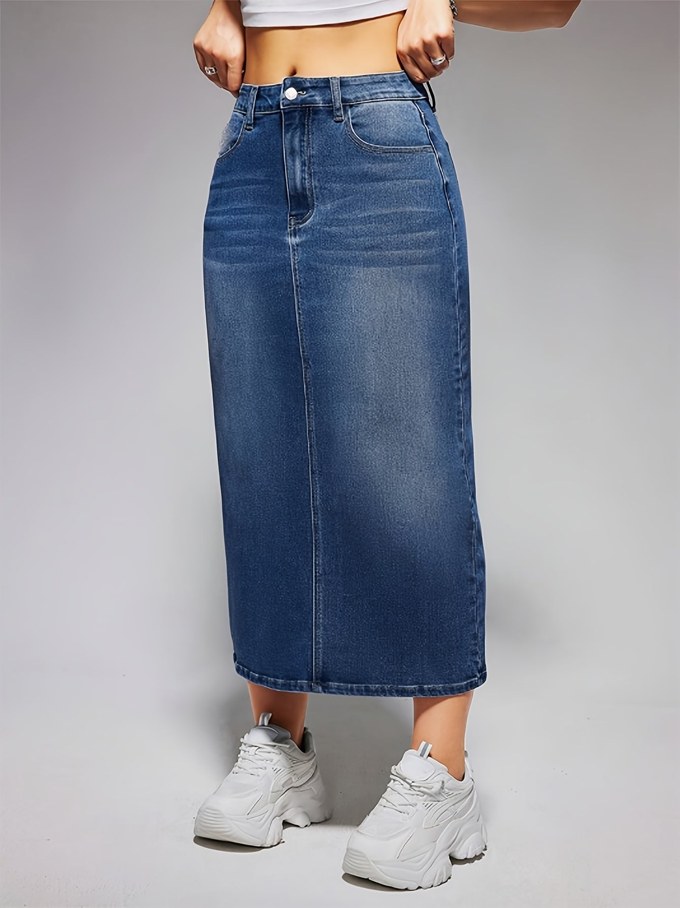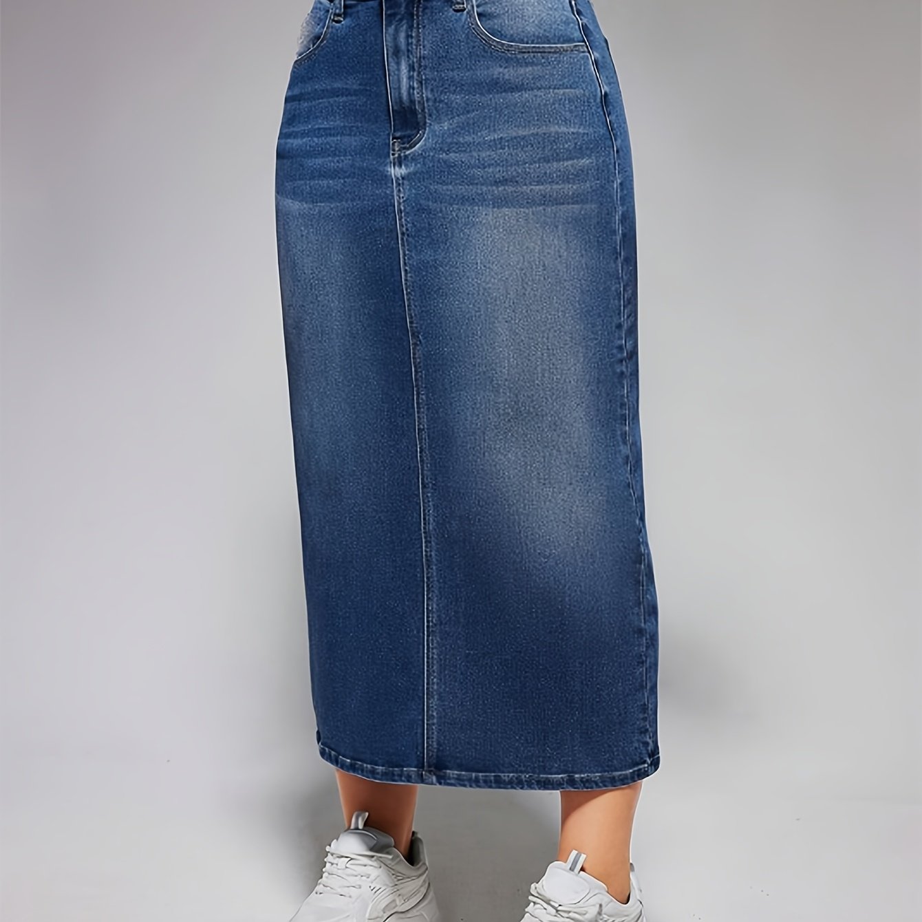 [Stretchy Denim Midi Skirt] Stretchy Washed Blue High-Waist A-Line Denim Midi Skirt for Women - Versatile & Comfortable Fit with Slash Pockets - Elegant Spring/Summer/Fall Denim Skirt