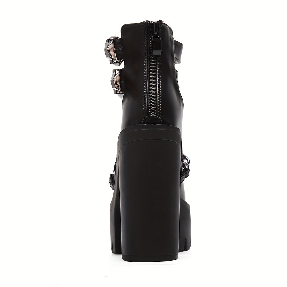 Stunning Goth Chic Ankle Boots - Black Chain Decor, Double Buckle Strap, Back Zipper, Block High Heels, Platform Sole, Short Motorcycle Boot Style, Perfect for Night Out or Casual Wear