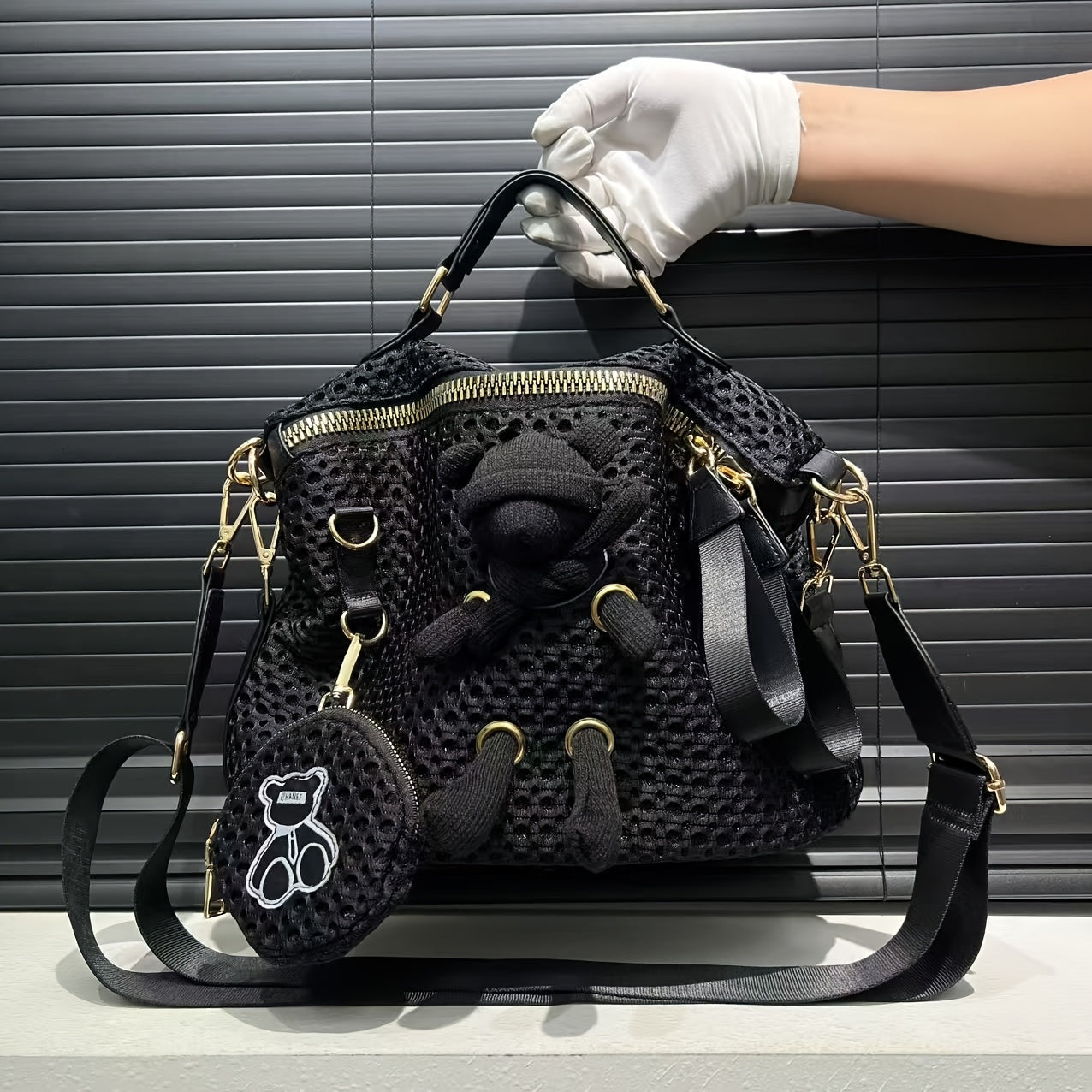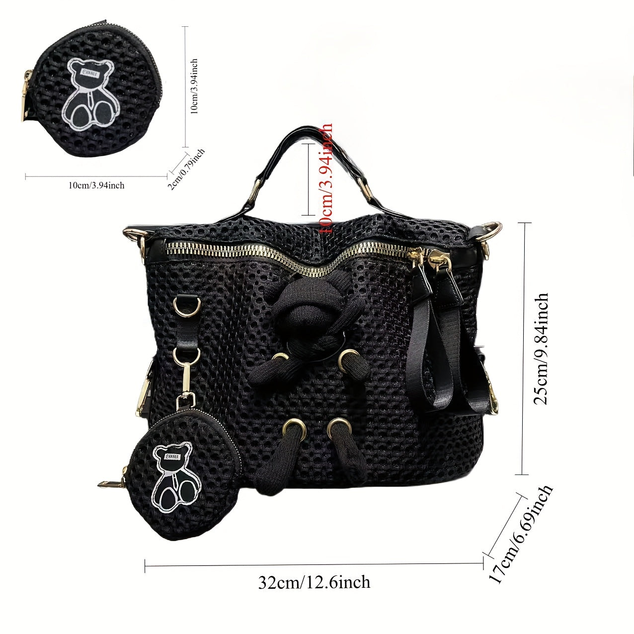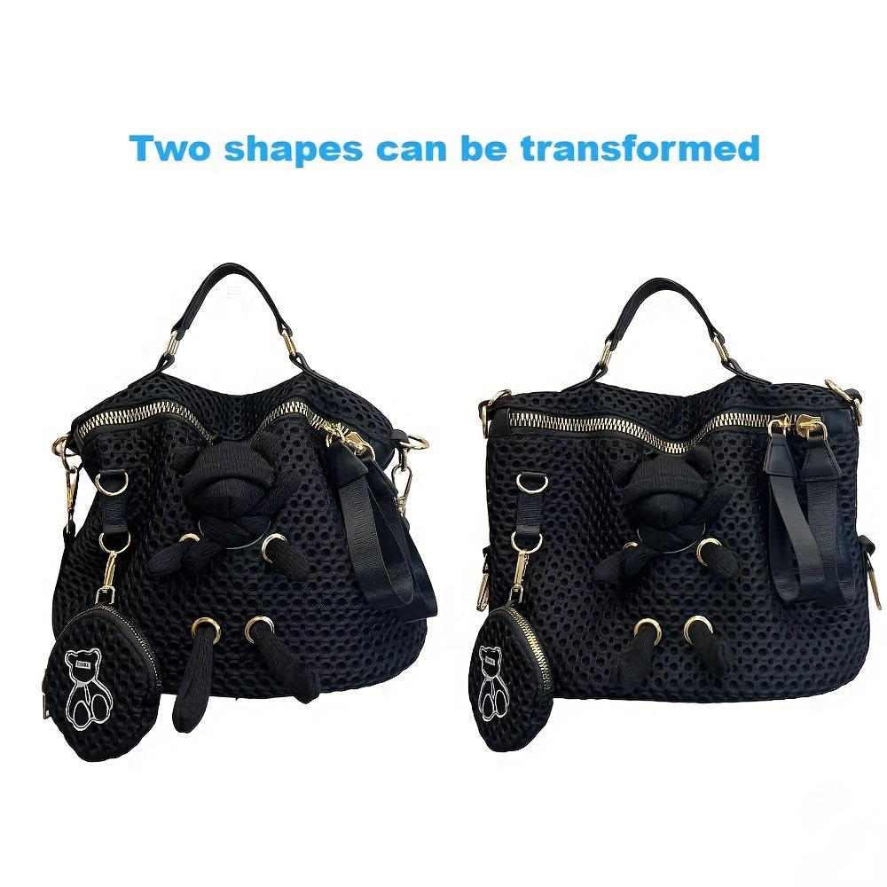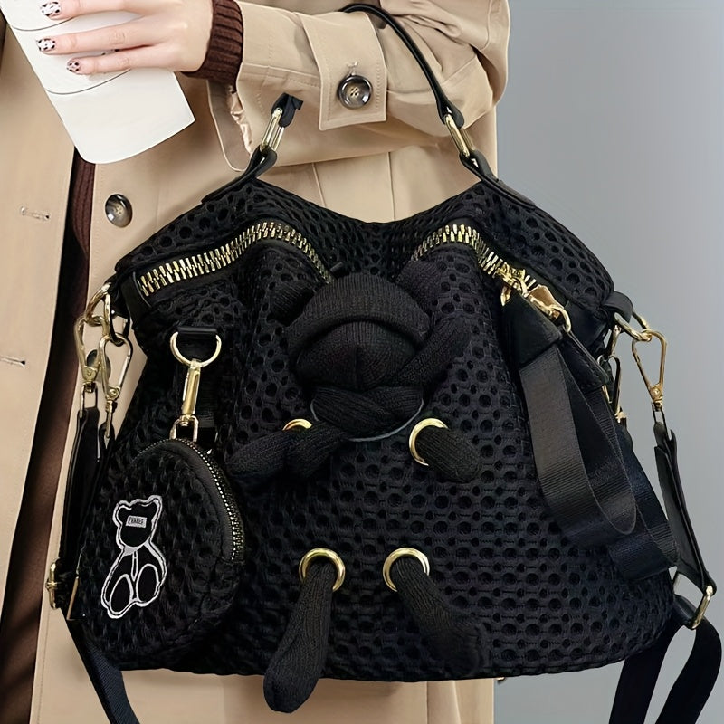 Stylish Black Mesh Shoulder Bag for Women - Lightweight Nylon Tote with Detachable Strap, Bear Charm & Golden-Tone Hardware, Zipper Closure, Front Pocket & Durable Polyester Lining - Versatile Crossbody Purse for Everyday Use & Travel, Small Crossbody Bag