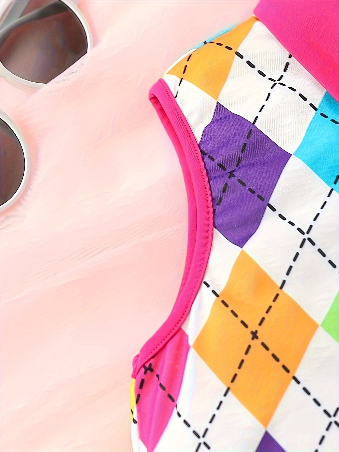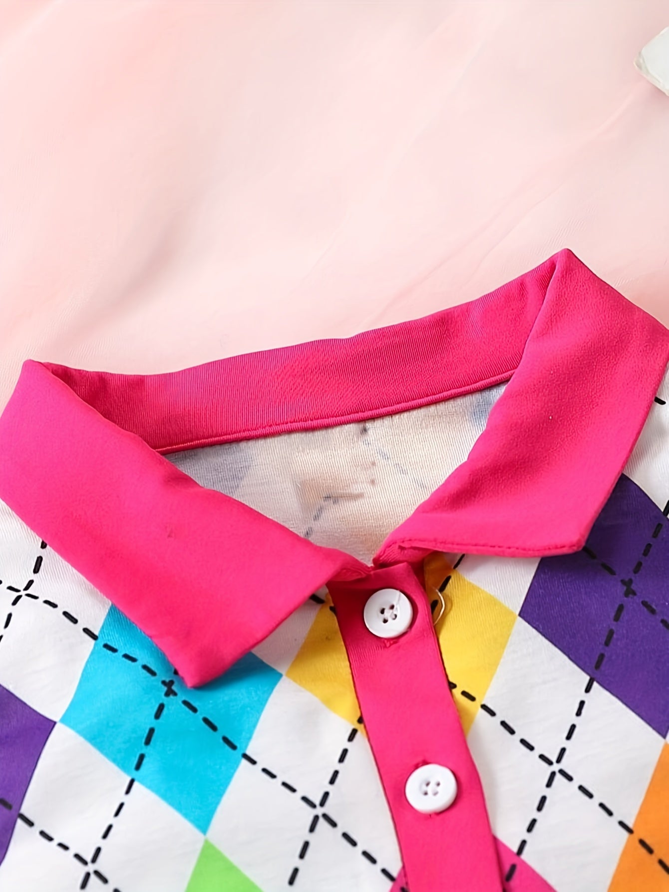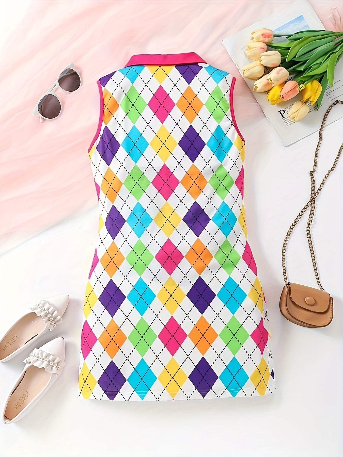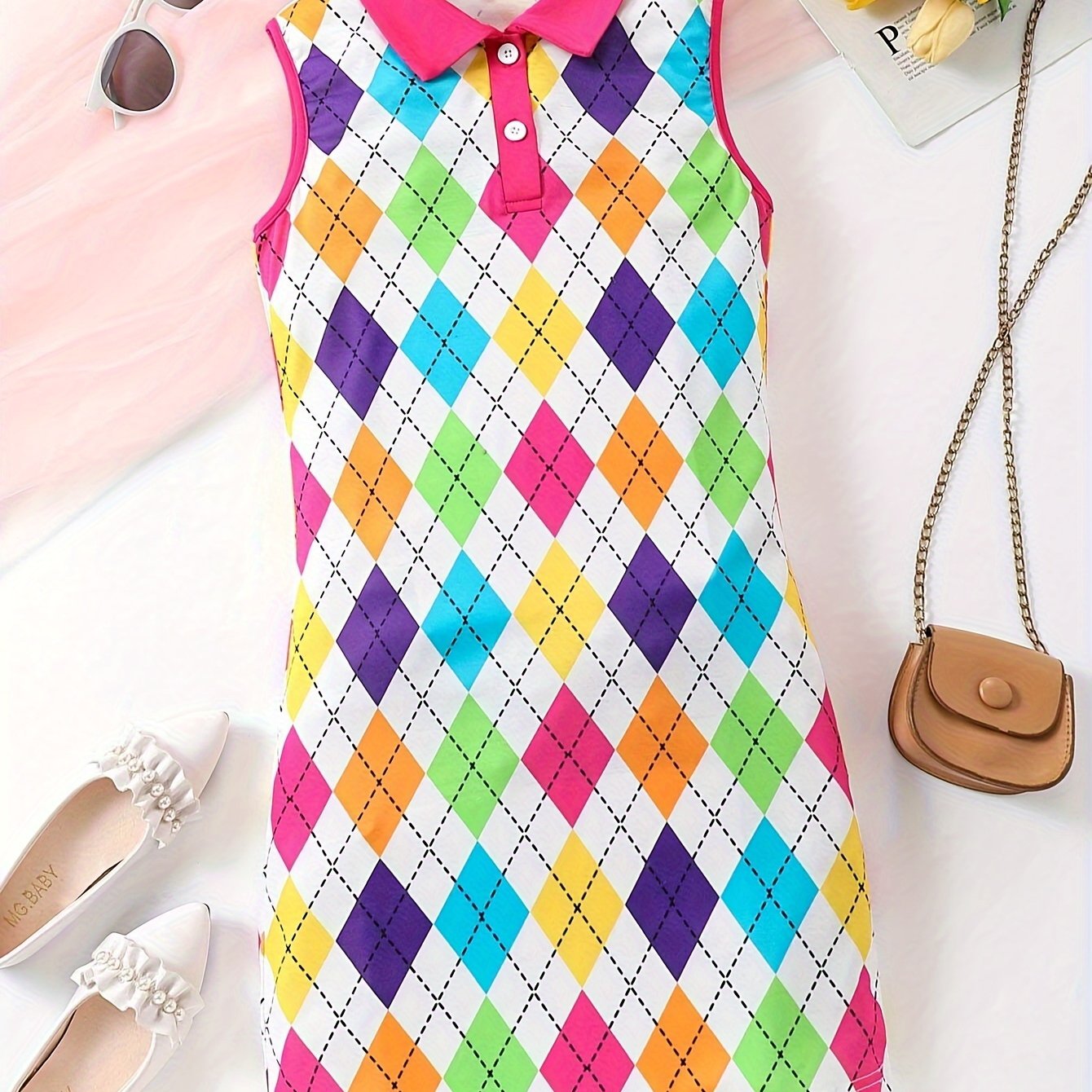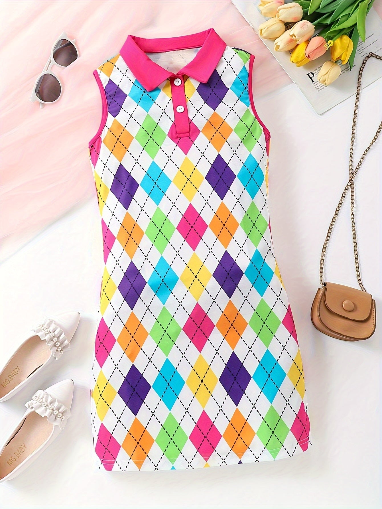 Stylish Geometric Pattern Sleeveless Dress for Girls, Summer Lapel Collar Dress