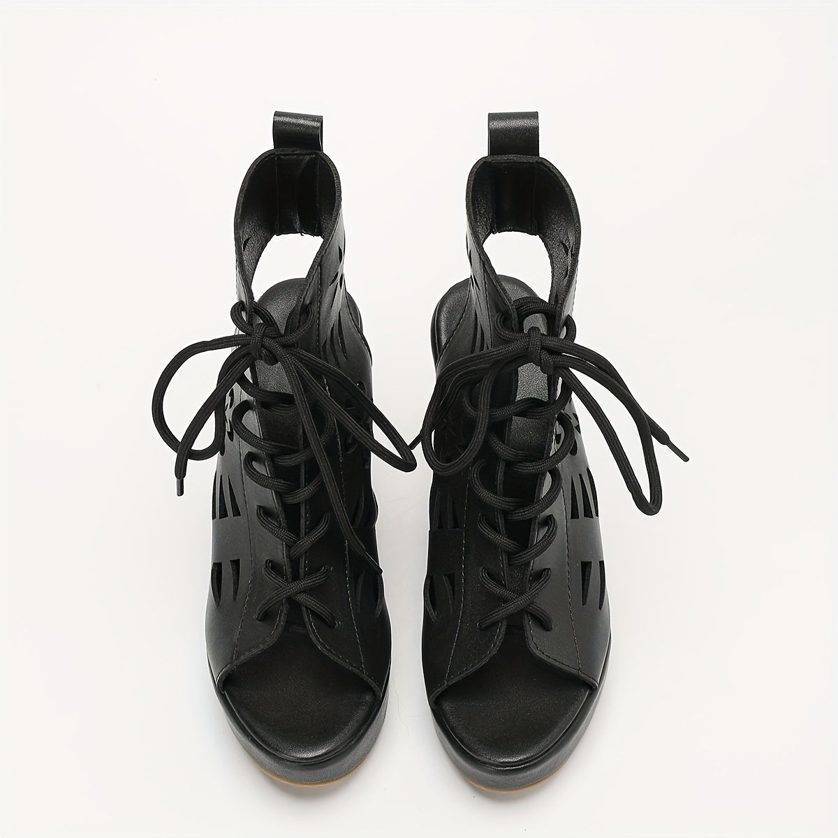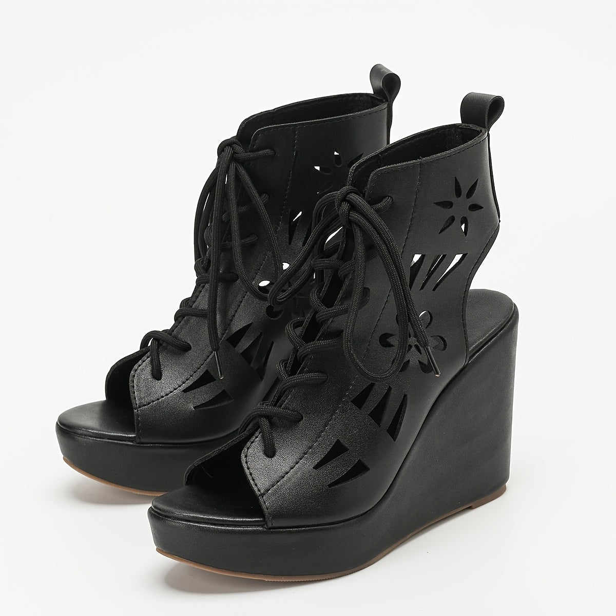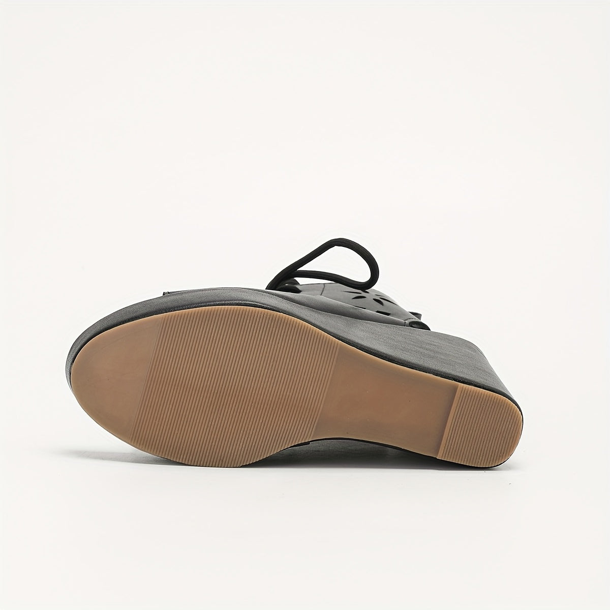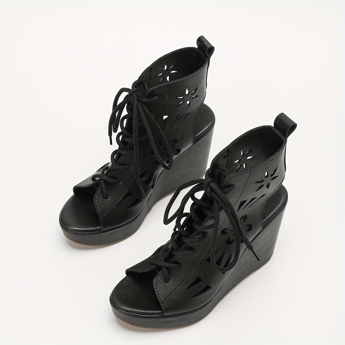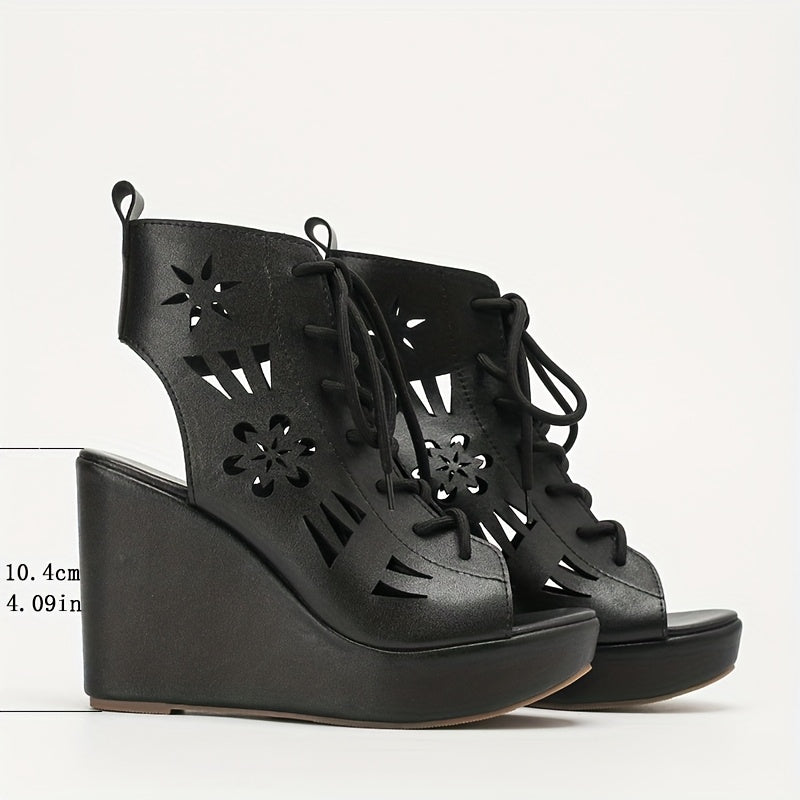 [Stylish Wedge Sandals] High Heel Women's Black Floral Wedge Sandals | Open Toe, Cut-Out Lace-Up, Faux Cover Summer Shoes for Casual & Stylish Outfits