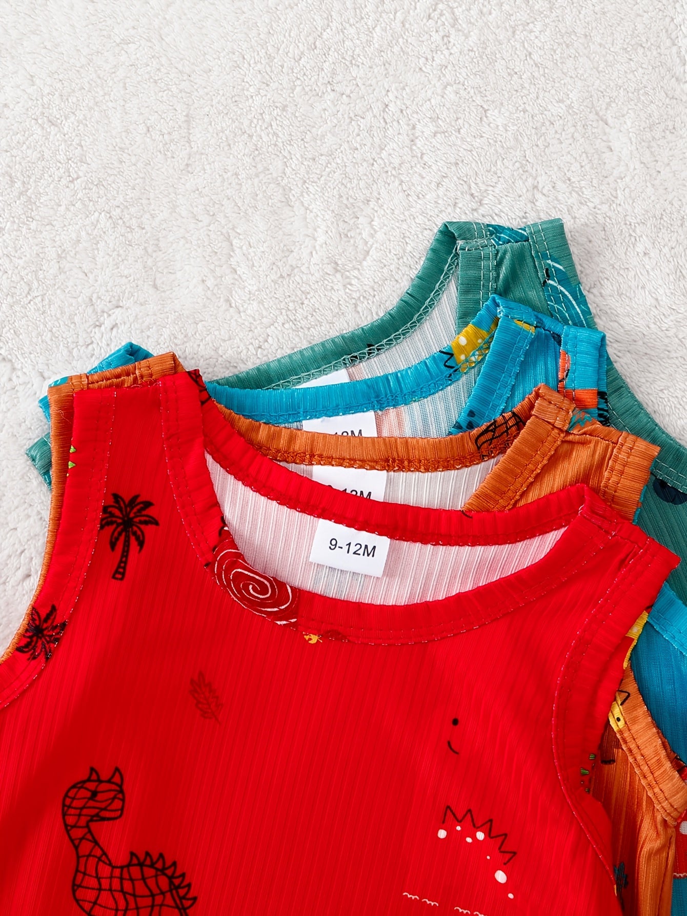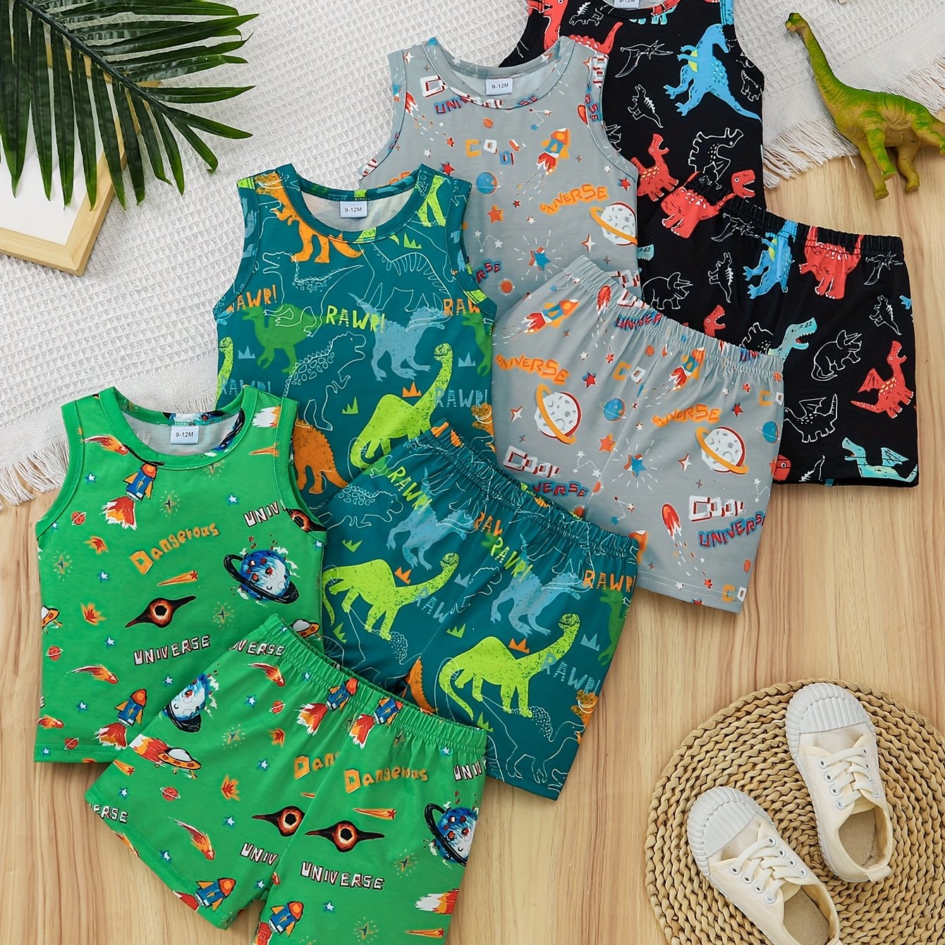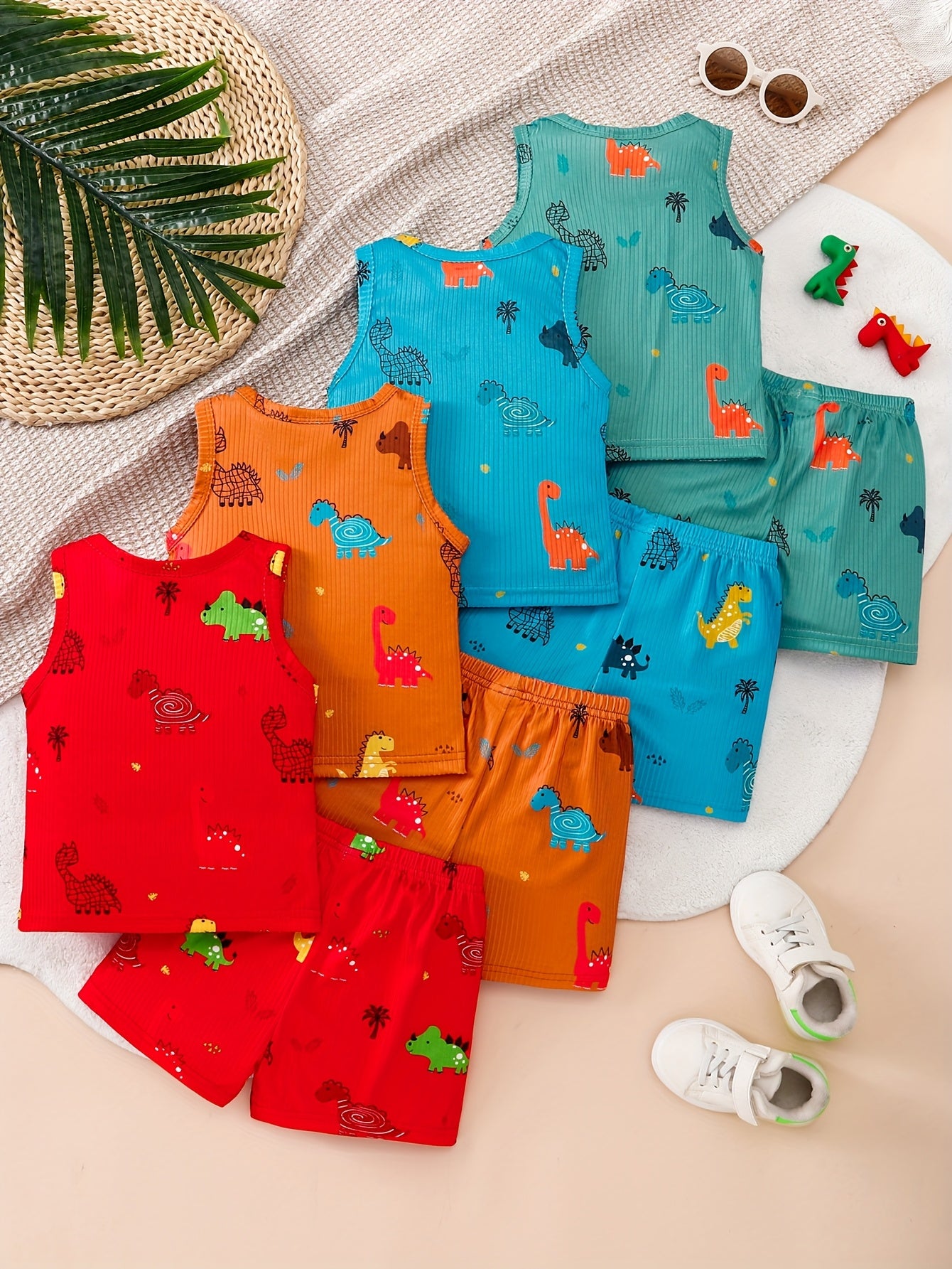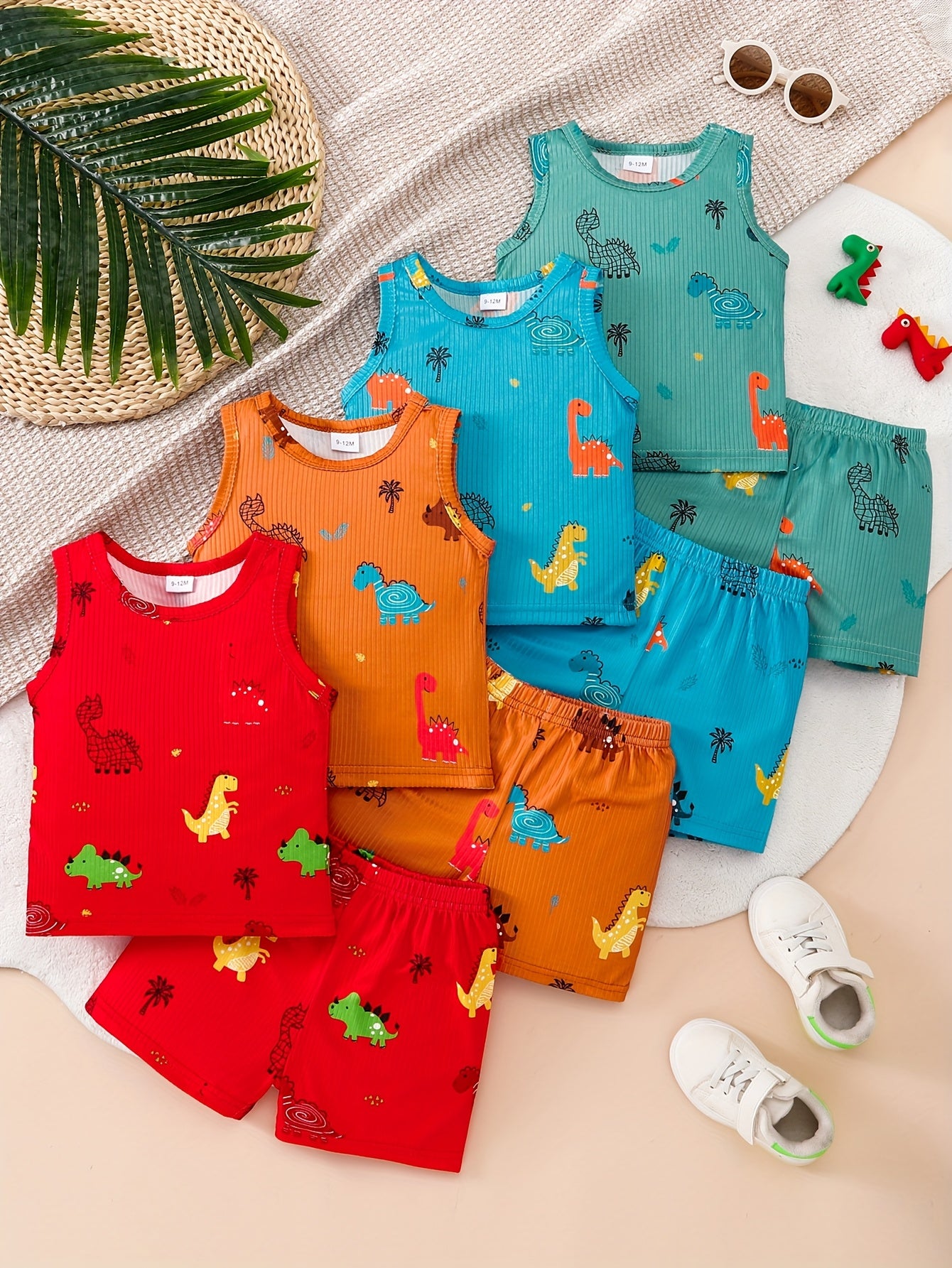 Summer Boys' Dinosaur Print Comfortable Ribbed Vest and Casual Shorts Set, Perfect for Outdoor Activities, Perfect for Outdoor