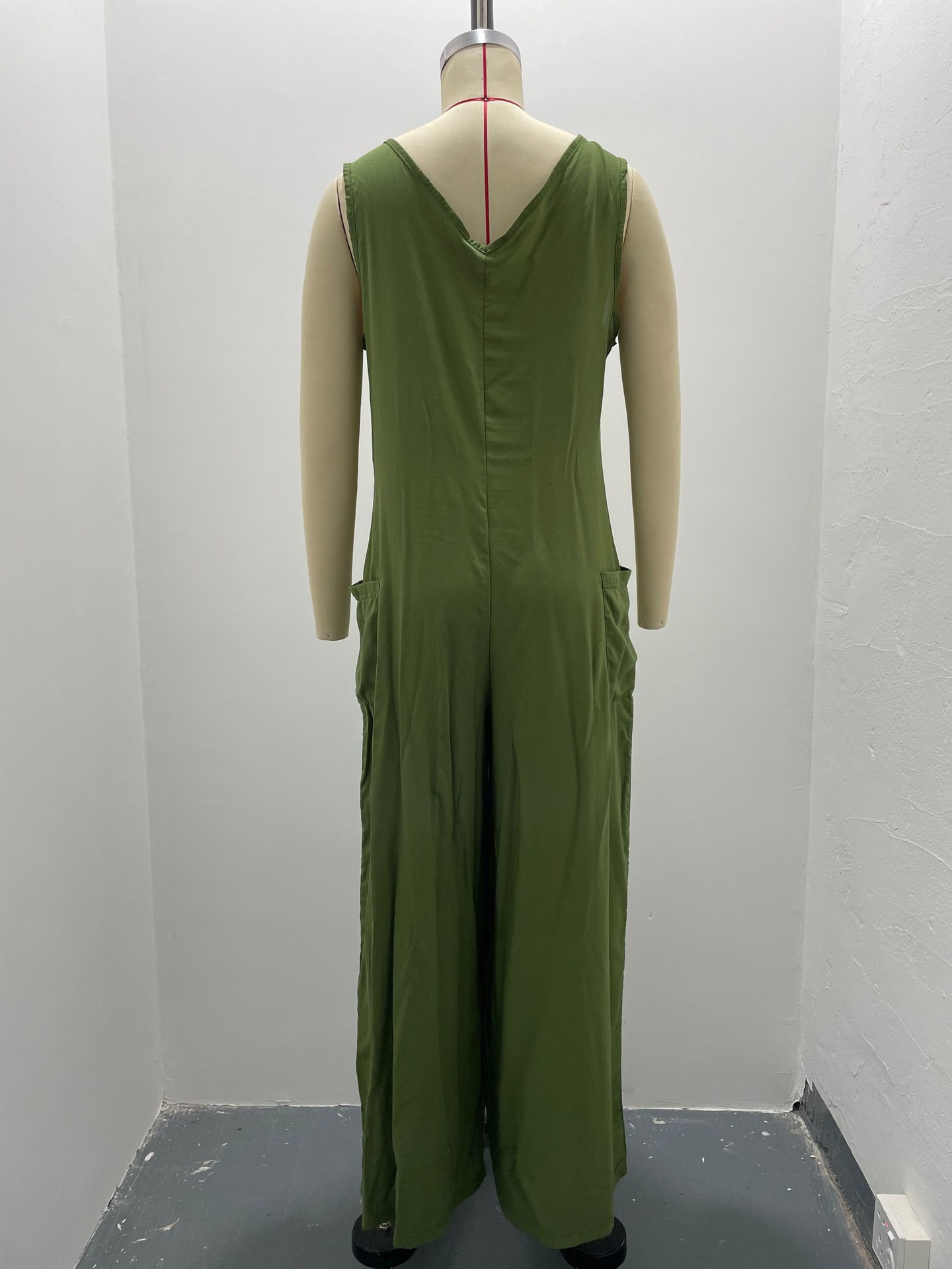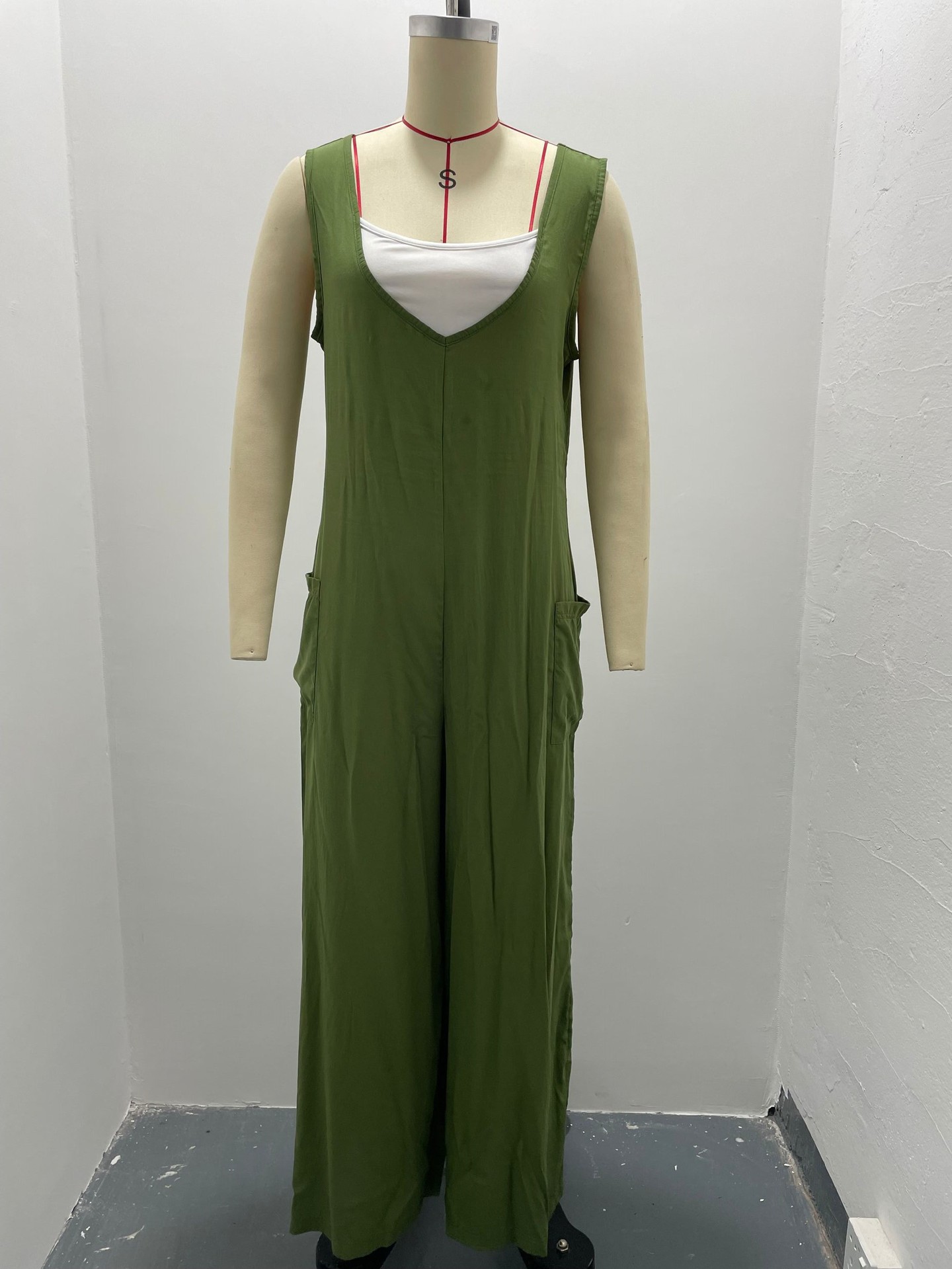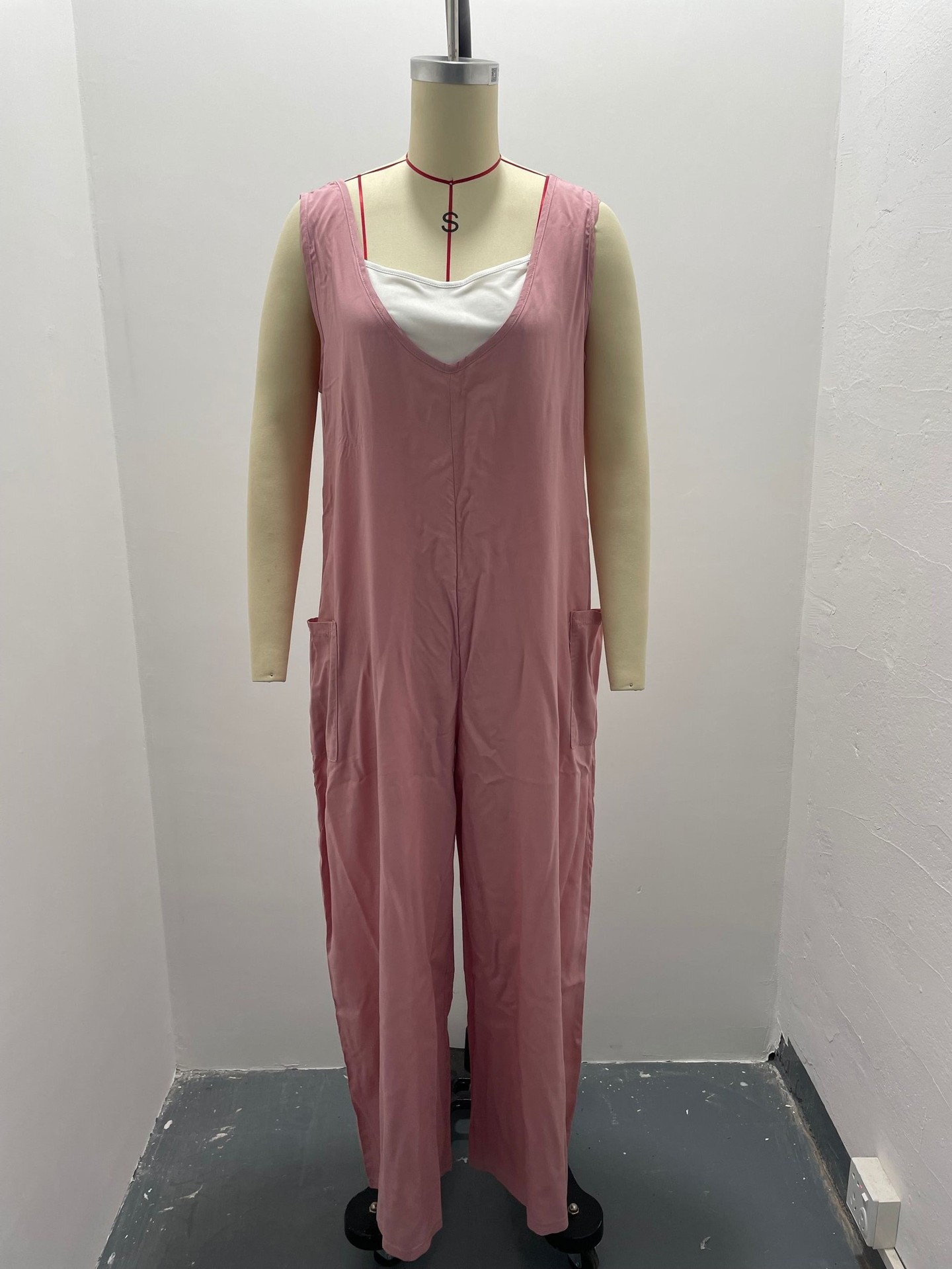 Summer Popular Solid Color Stickers Bags Jumpsuit V neck Suspender Pants Wide Leg Trousers for Women
