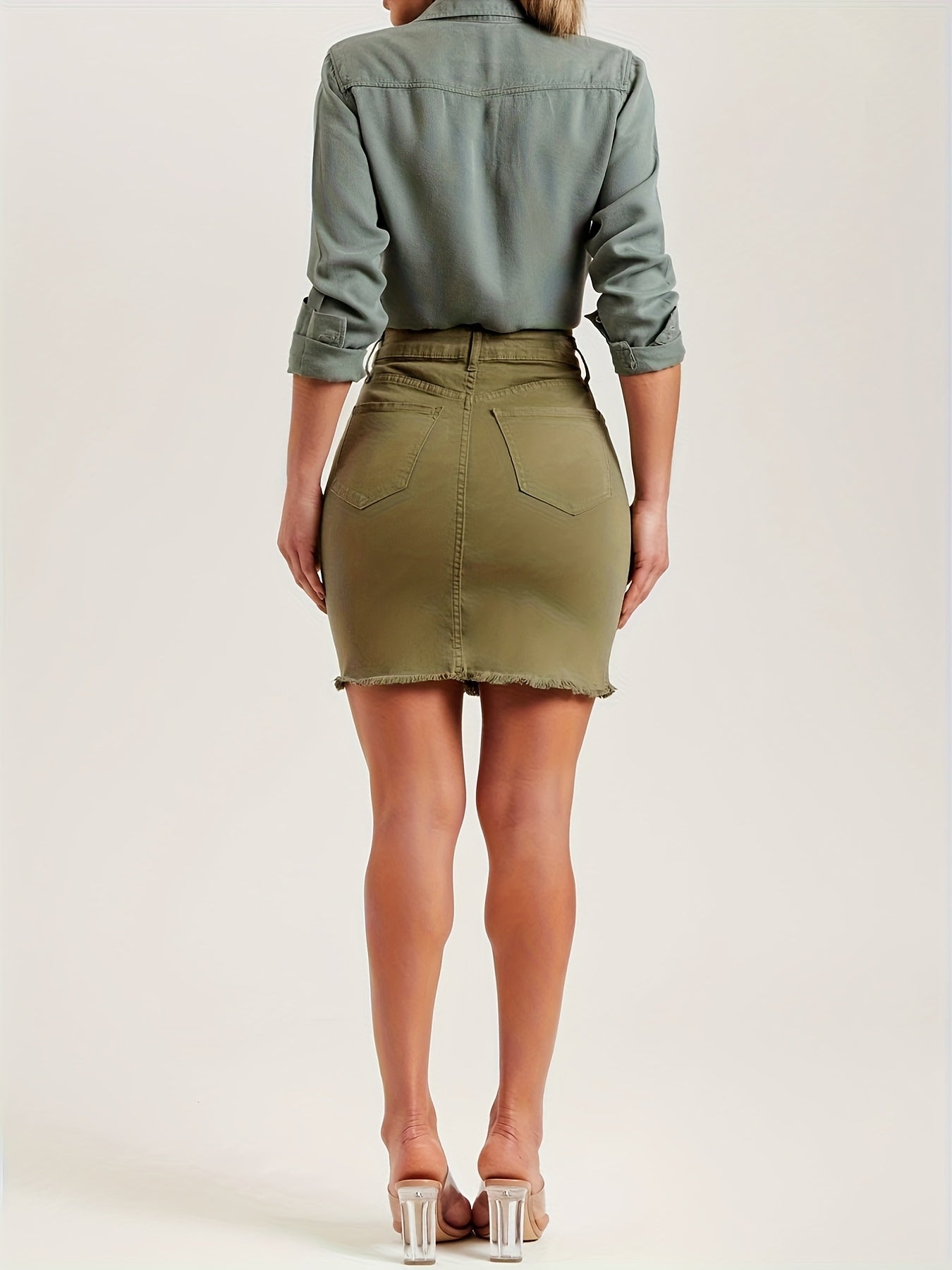Summer Style | High-Waist Olive Green Denim Mini Skirt with Frayed Hem - Stretchy, Casual, and Versatile Summer Skirt for Women