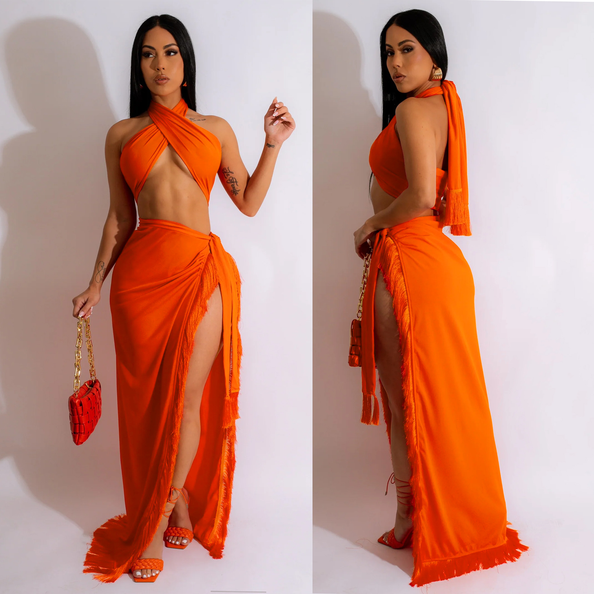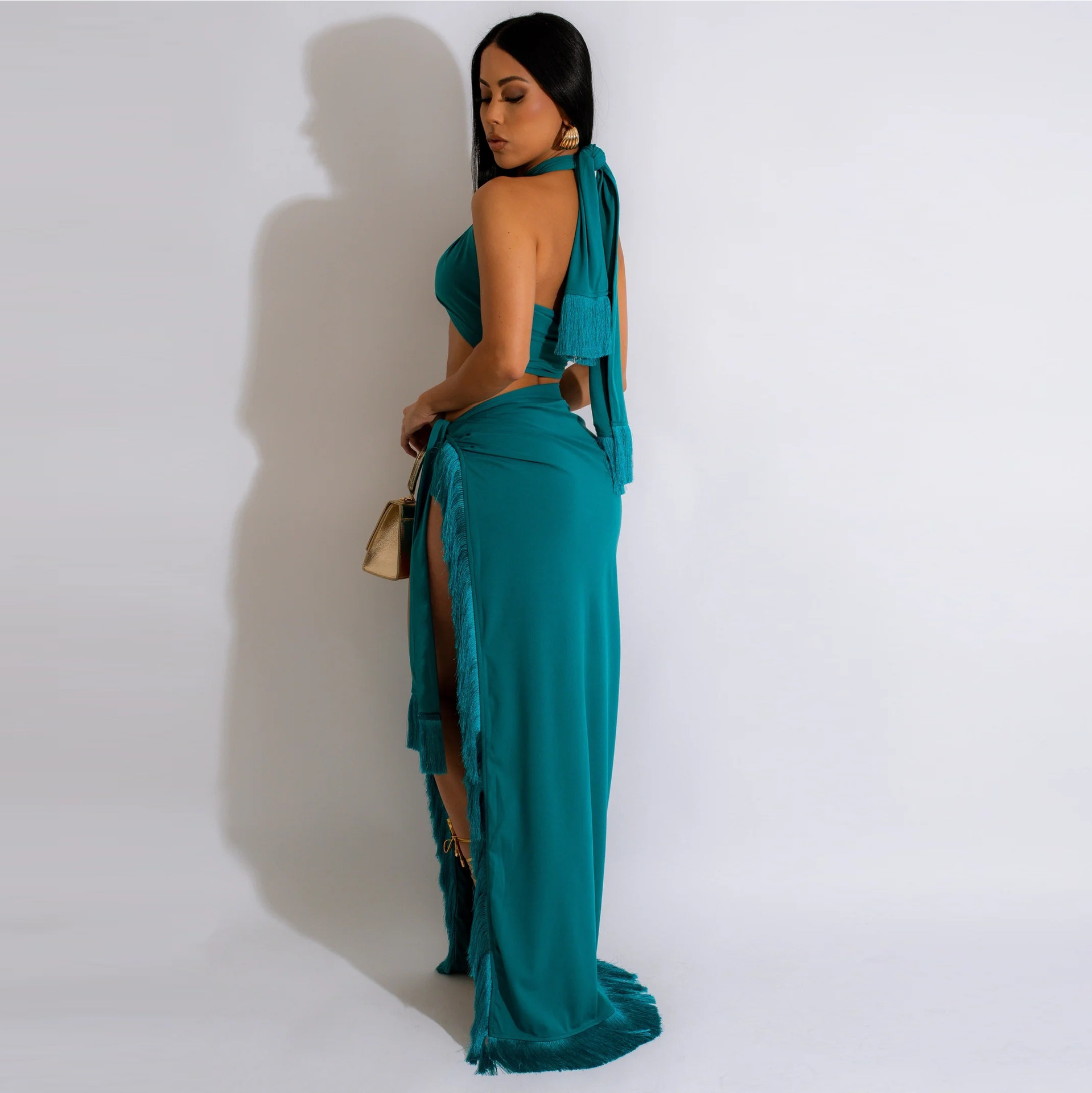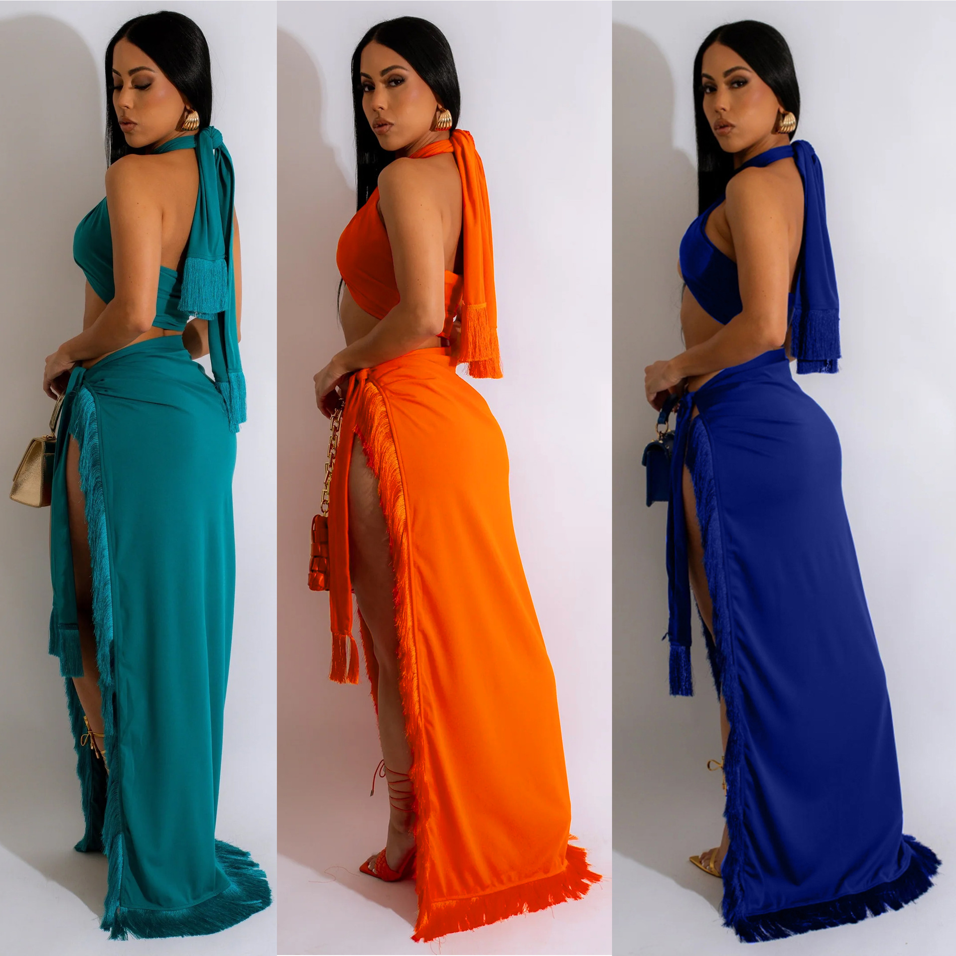 Summer Women Clothing Sexy Bandeau Lace Tassel Two Piece Skirt Set