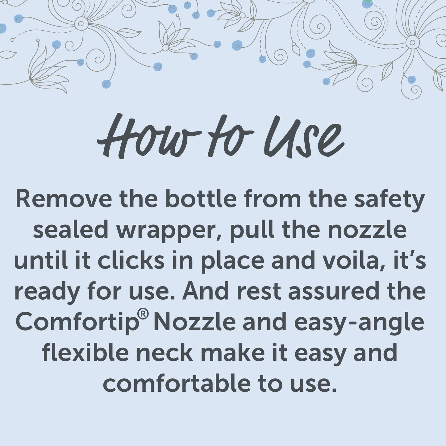 Instructions: Remove sanitary overwrap. Hold cap of bottle with one hand and grasp Comfortip® nozzle firmly with the other hand. Pull nozzle straight up until it clicks in place. Douche is not ready for use until you hear this click. Gently insert nozzle into your vagina, no more than 3 inches, and slowly squeeze bottle. Do not close the vaginal opening; douching solution should flow freely out of vagina. Use while sitting on the toilet, in the tub, or while standing in the shower.