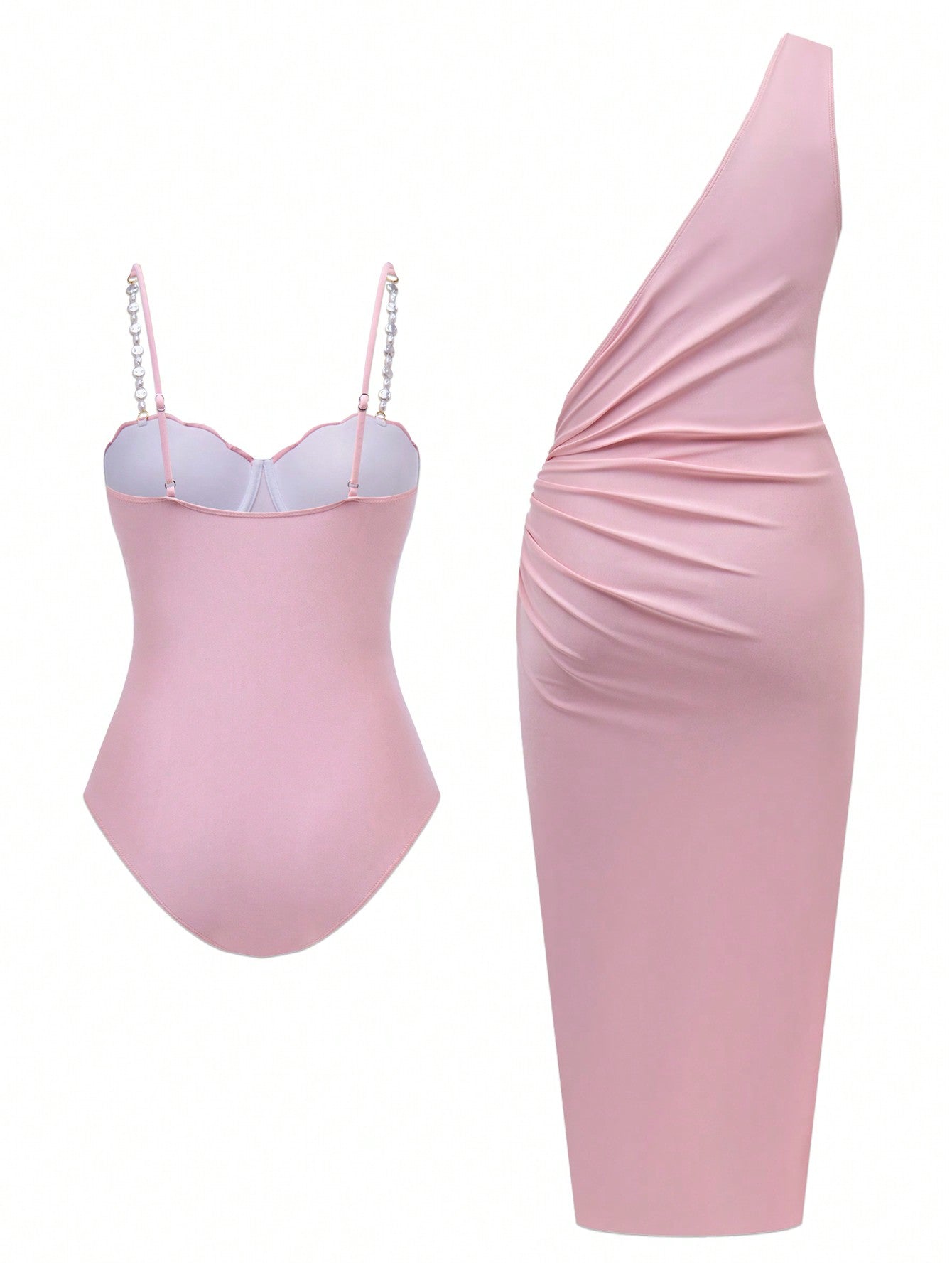 Swim Oasis 2pcs/Set Women Solid Color Seashell Decorated Adjustable Strap Push Up Padded Monokini Swimsuit Summer