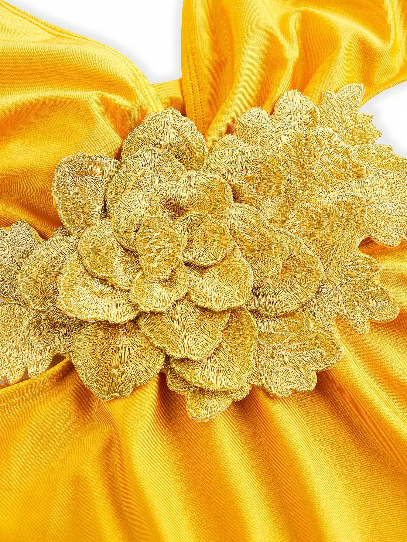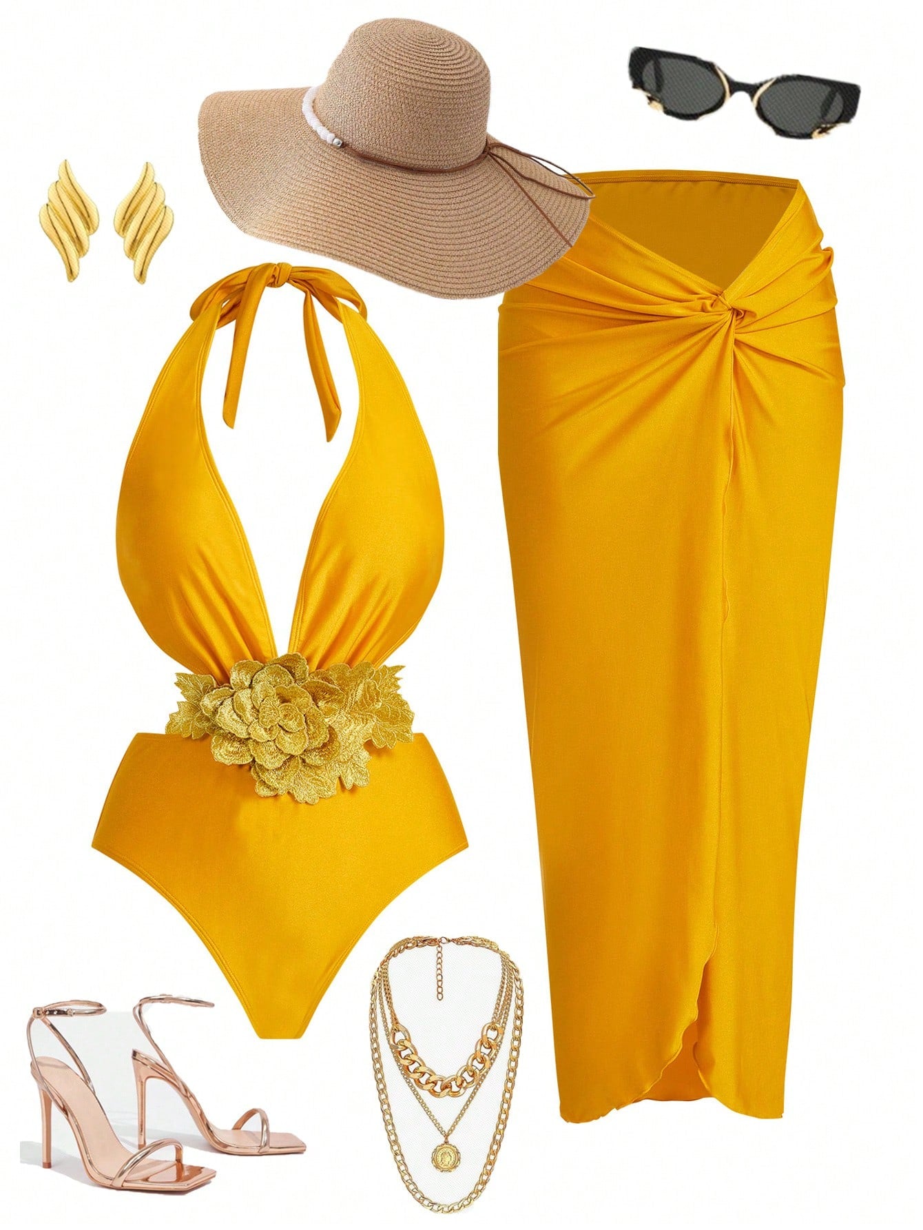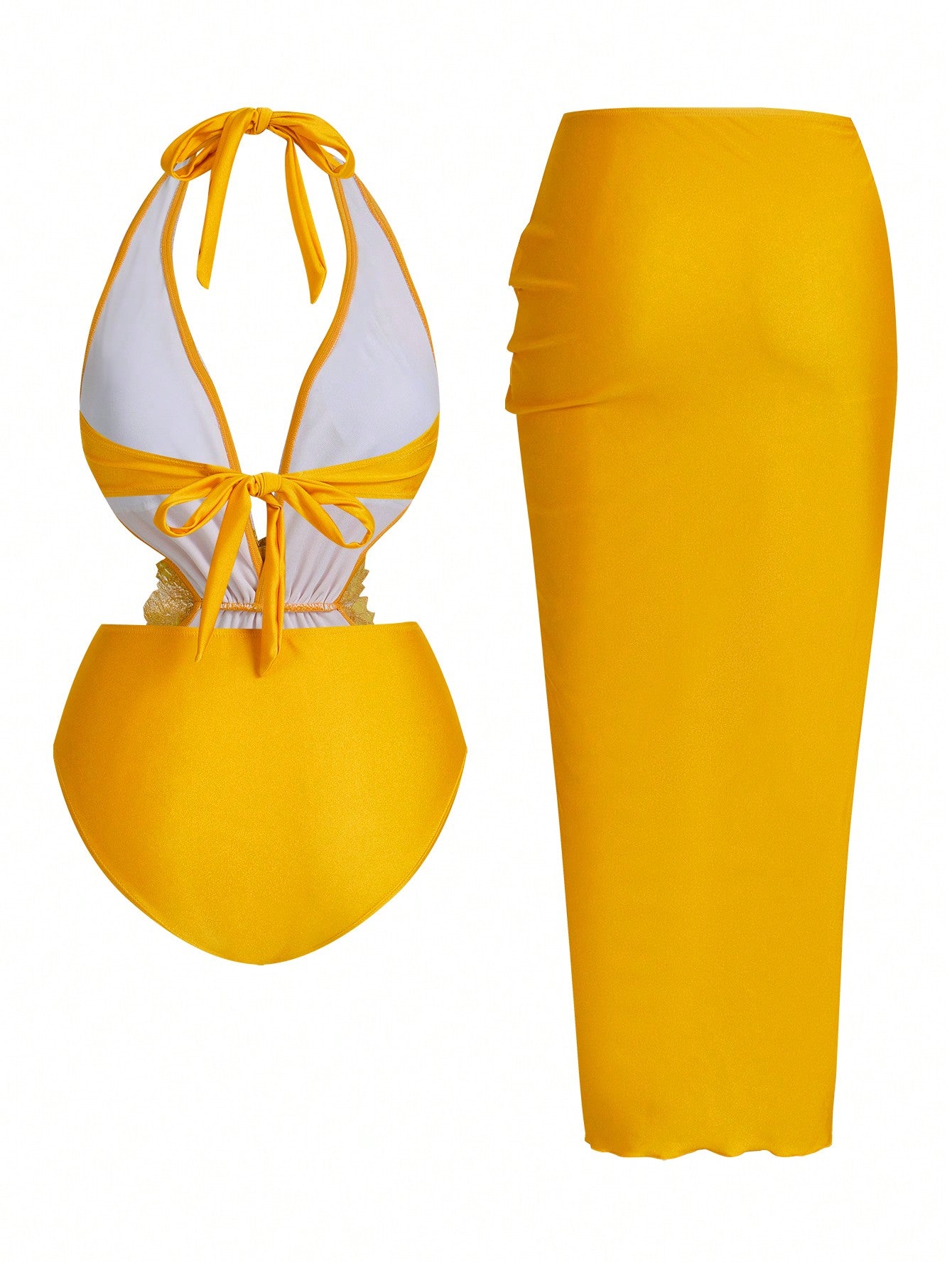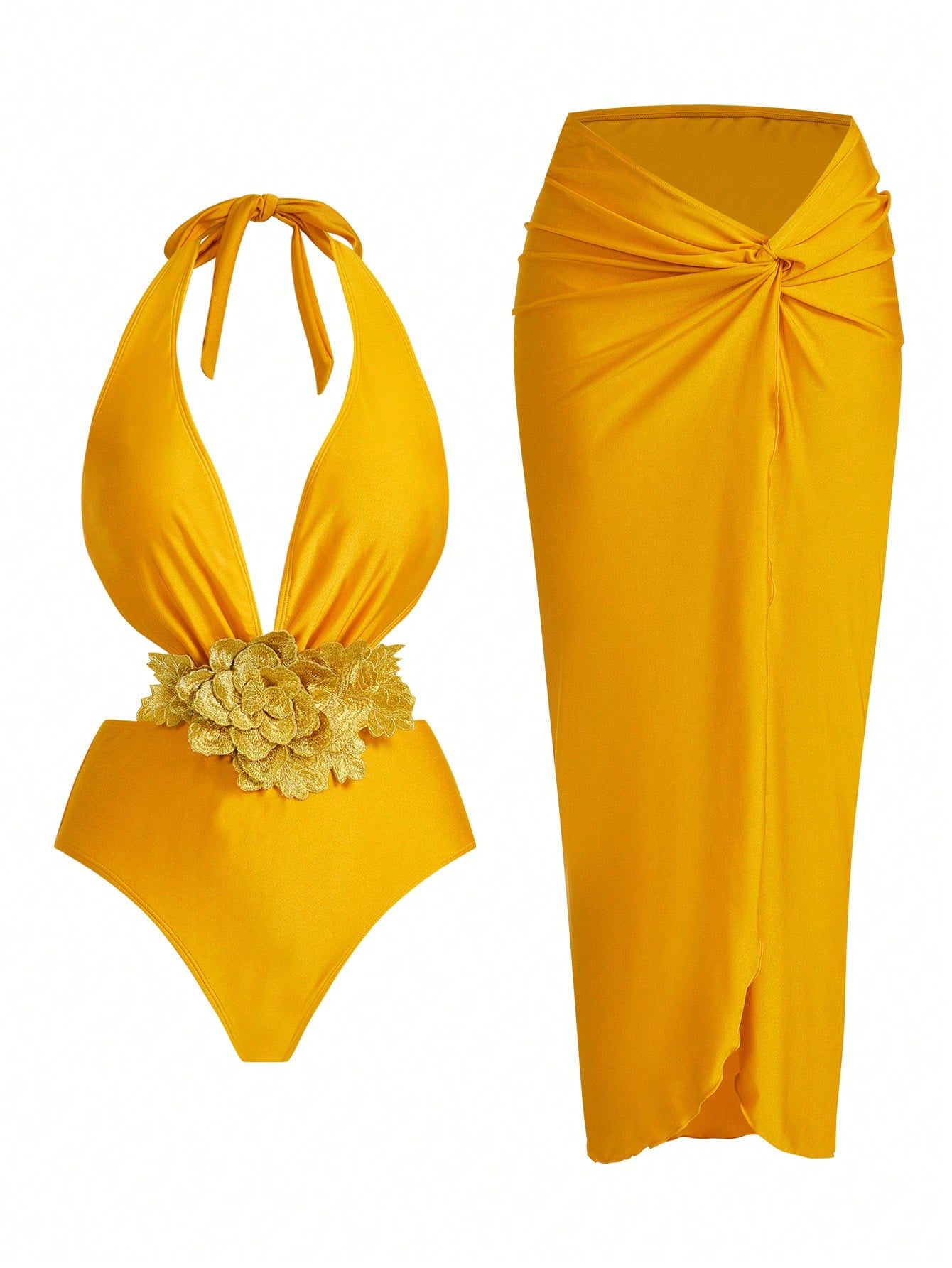Swim Oasis Summer 1pc Women's Beachwear Vacation Floral Decoration Halter Tie Backless One-Piece Swimsuit With Chiffon Cover-Up And Mini Skirt