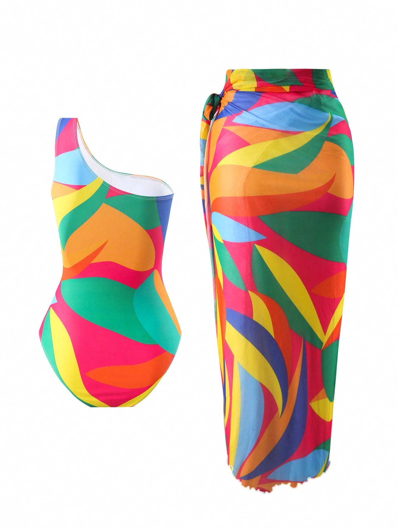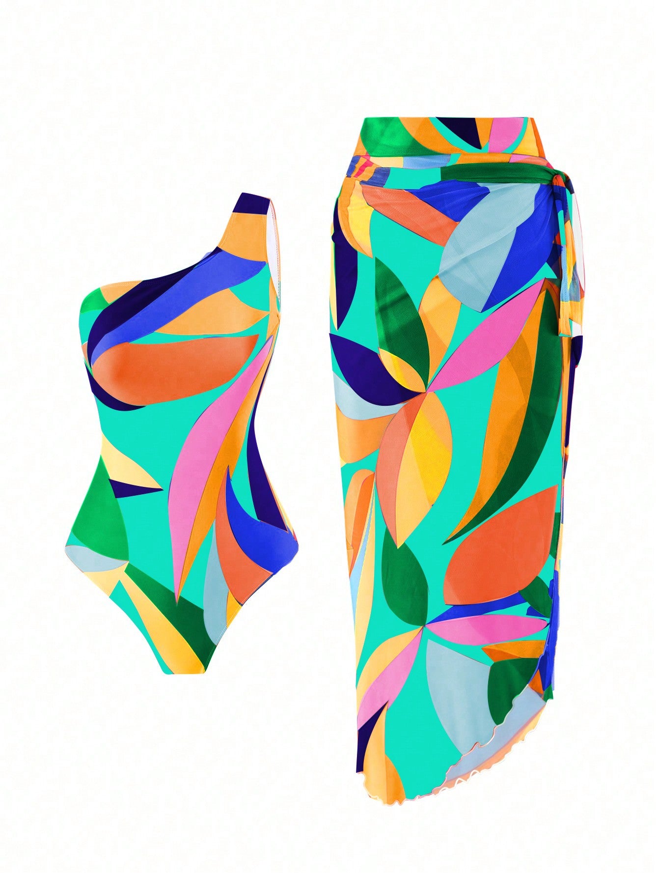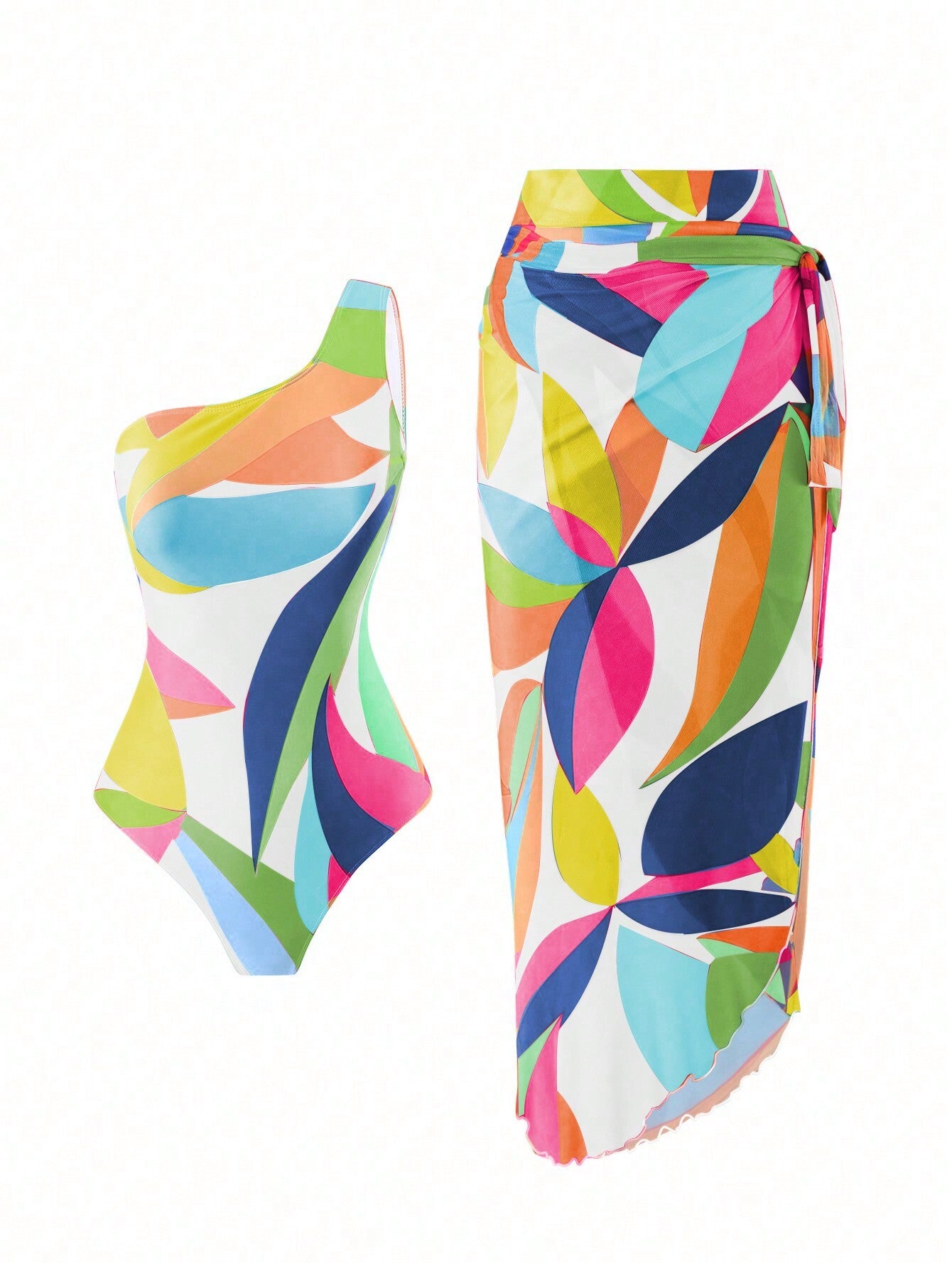 Swim Oasis Women's Printed Beachwear One Shoulder Monokini Swimsuit And Tie Front Swim Skirt Outfit,Summer Beach