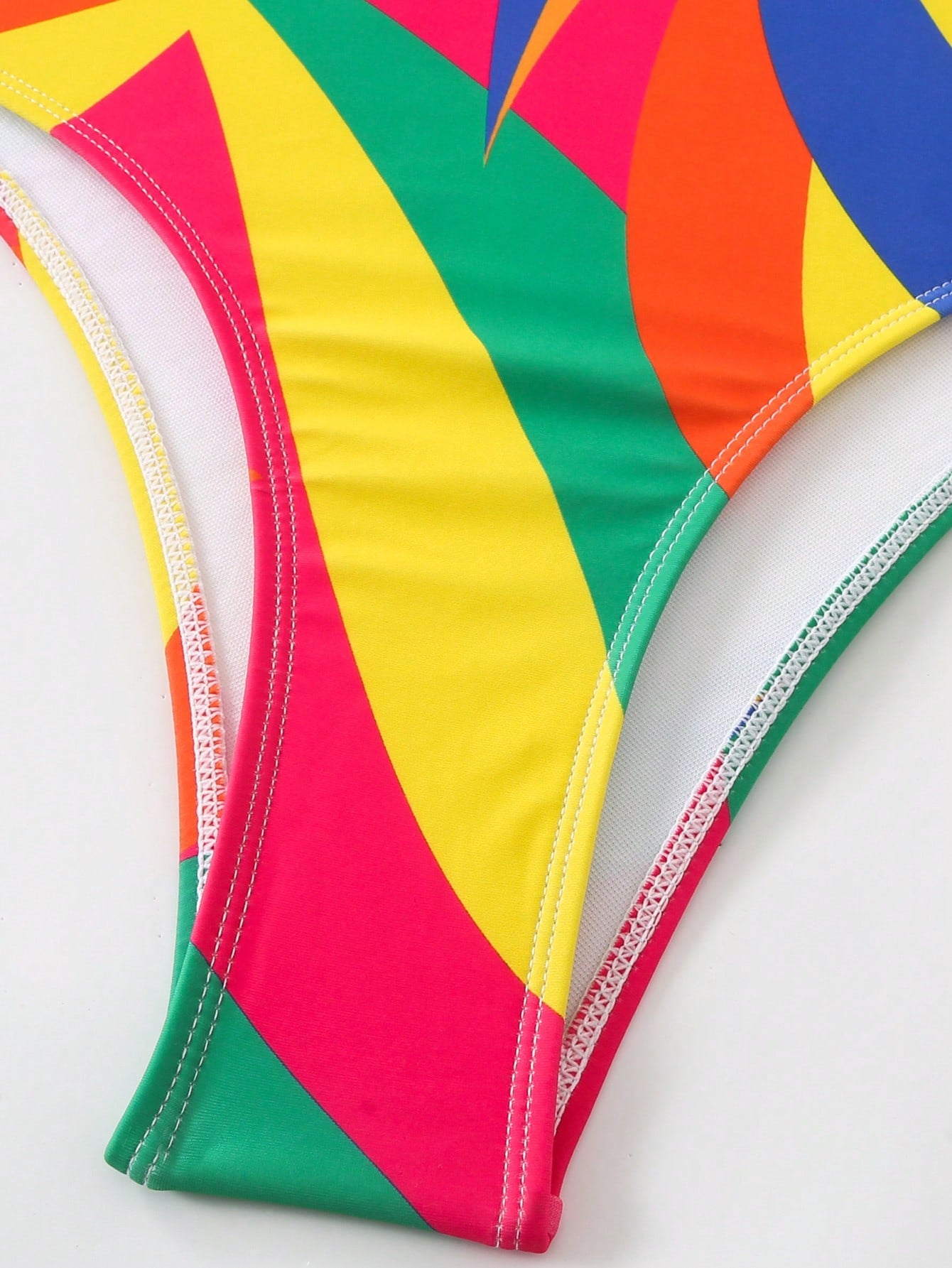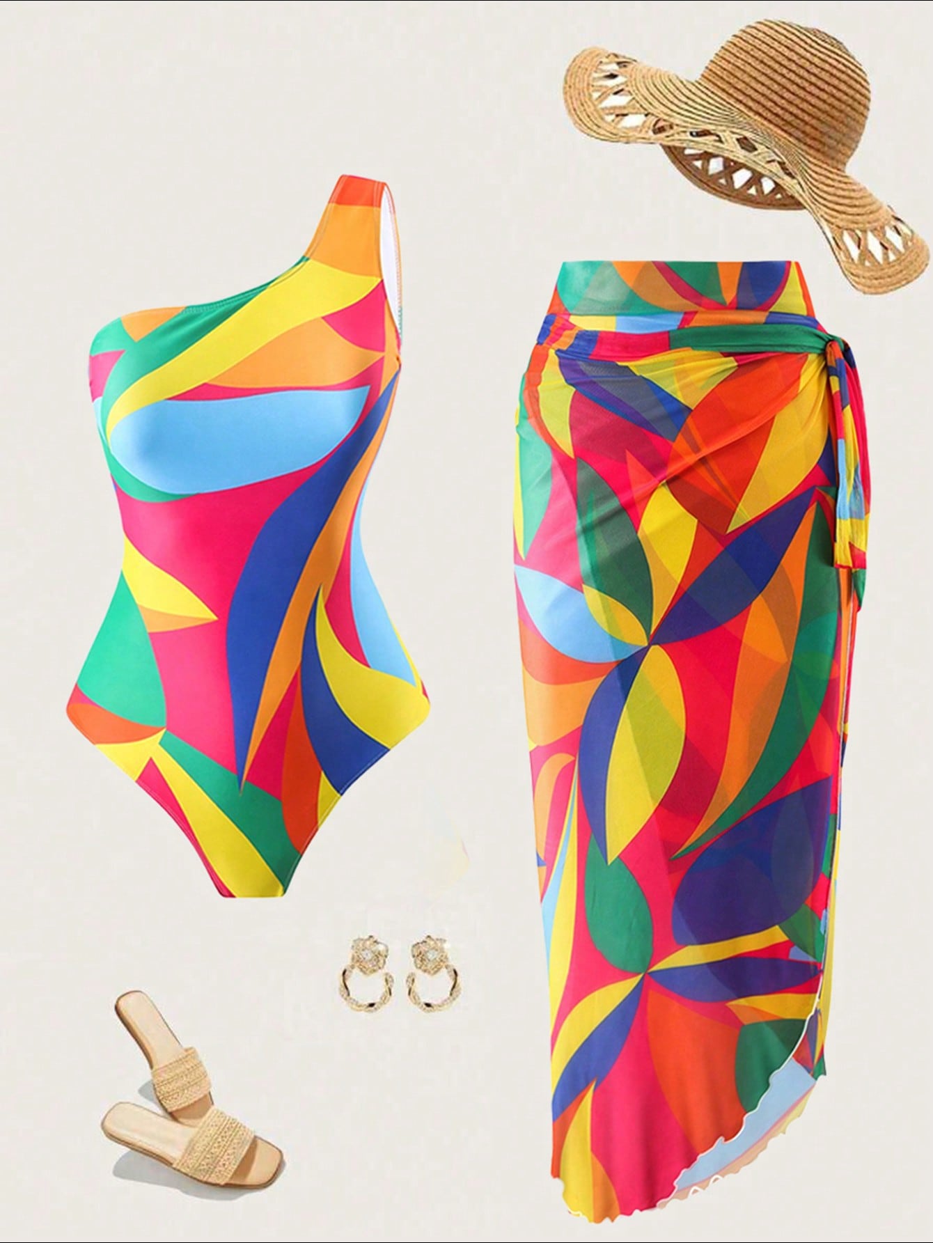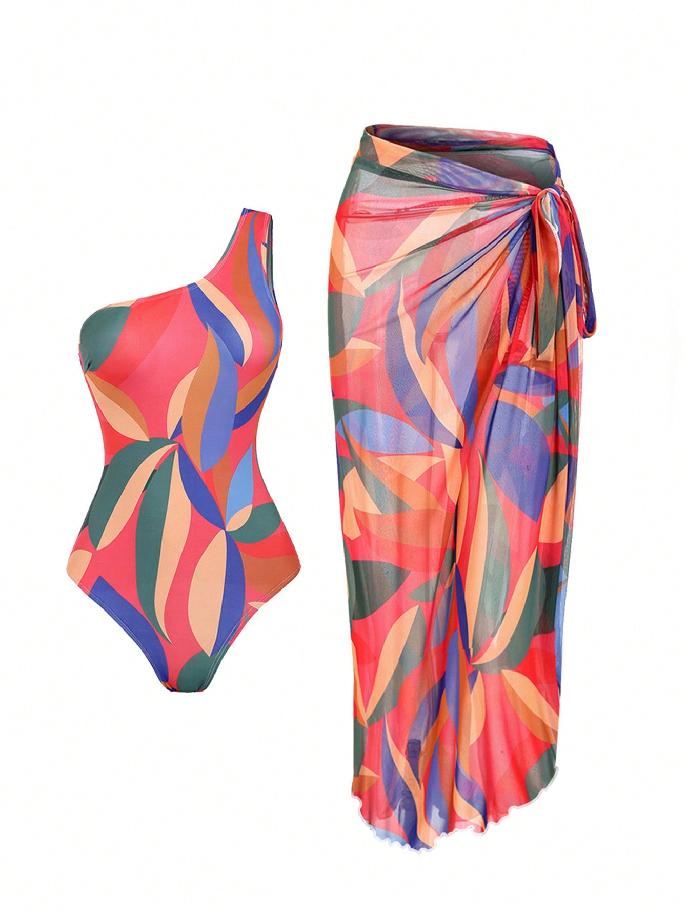 Swim Oasis Women's Printed Beachwear One Shoulder Monokini Swimsuit And Tie Front Swim Skirt Outfit,Summer Beach