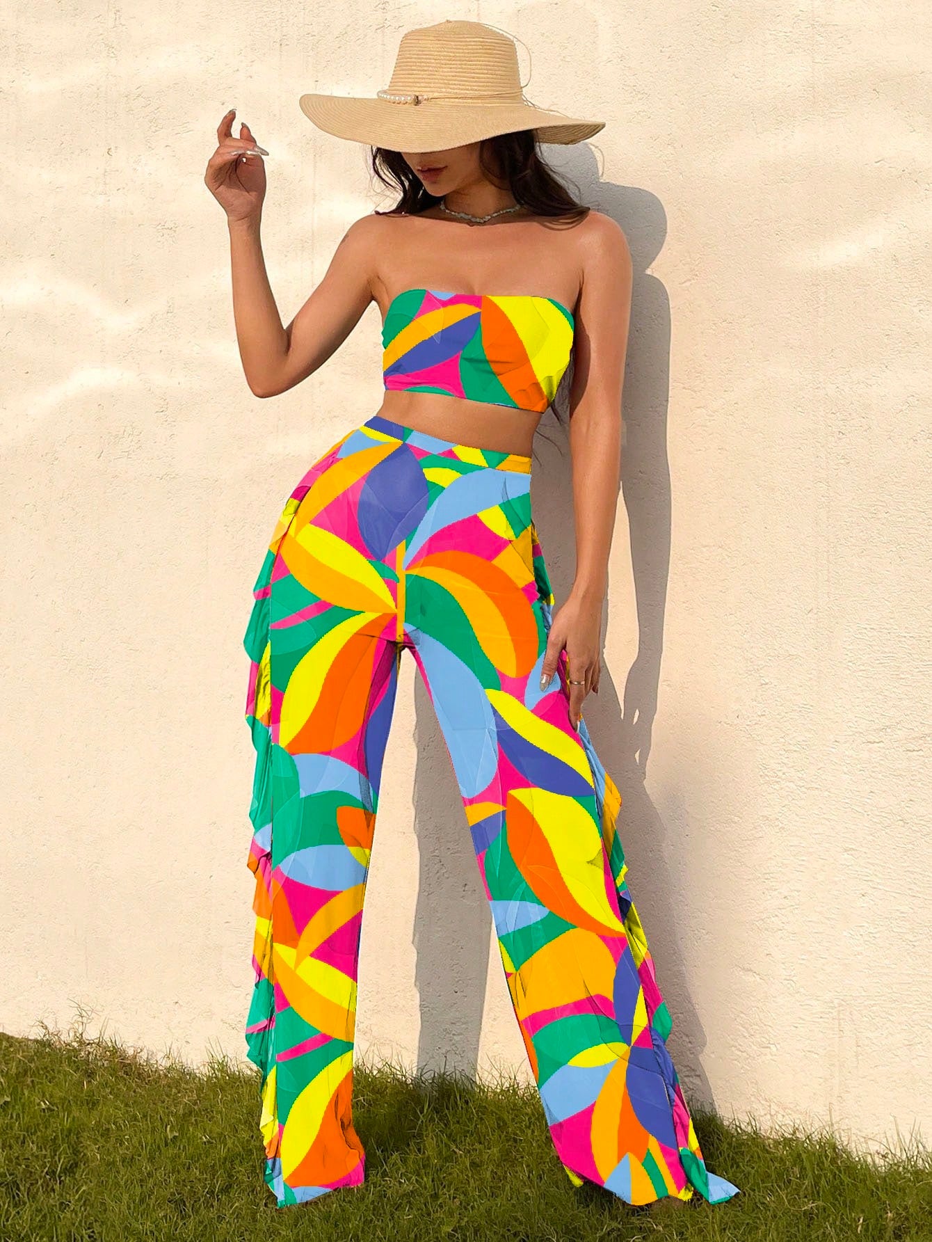 Swim Summer Beach Colorful Print Bikini Set Bandeau Bra & Bikini Bottom & Ruffle Trim Beach Pants 3 Piece Bathing Suit