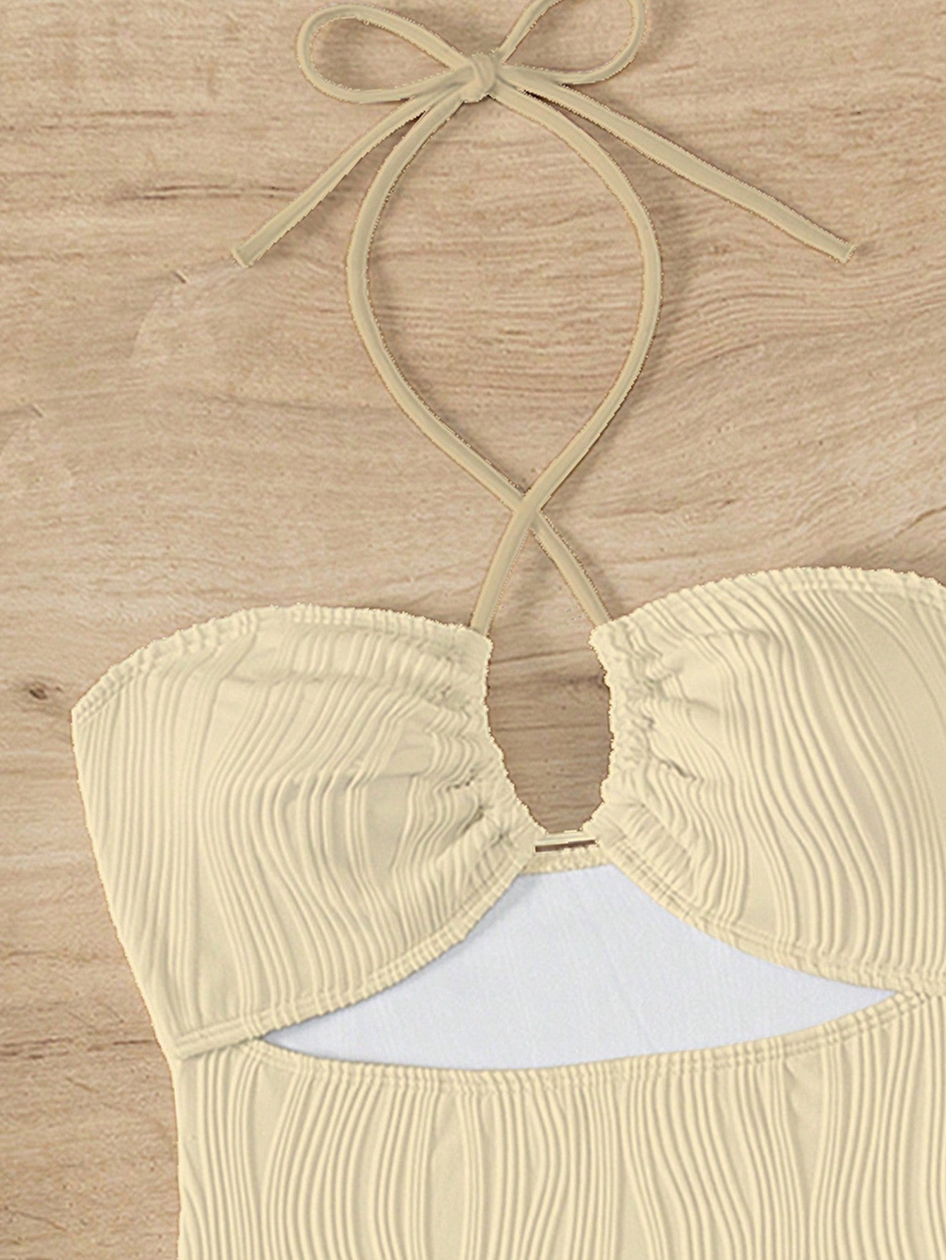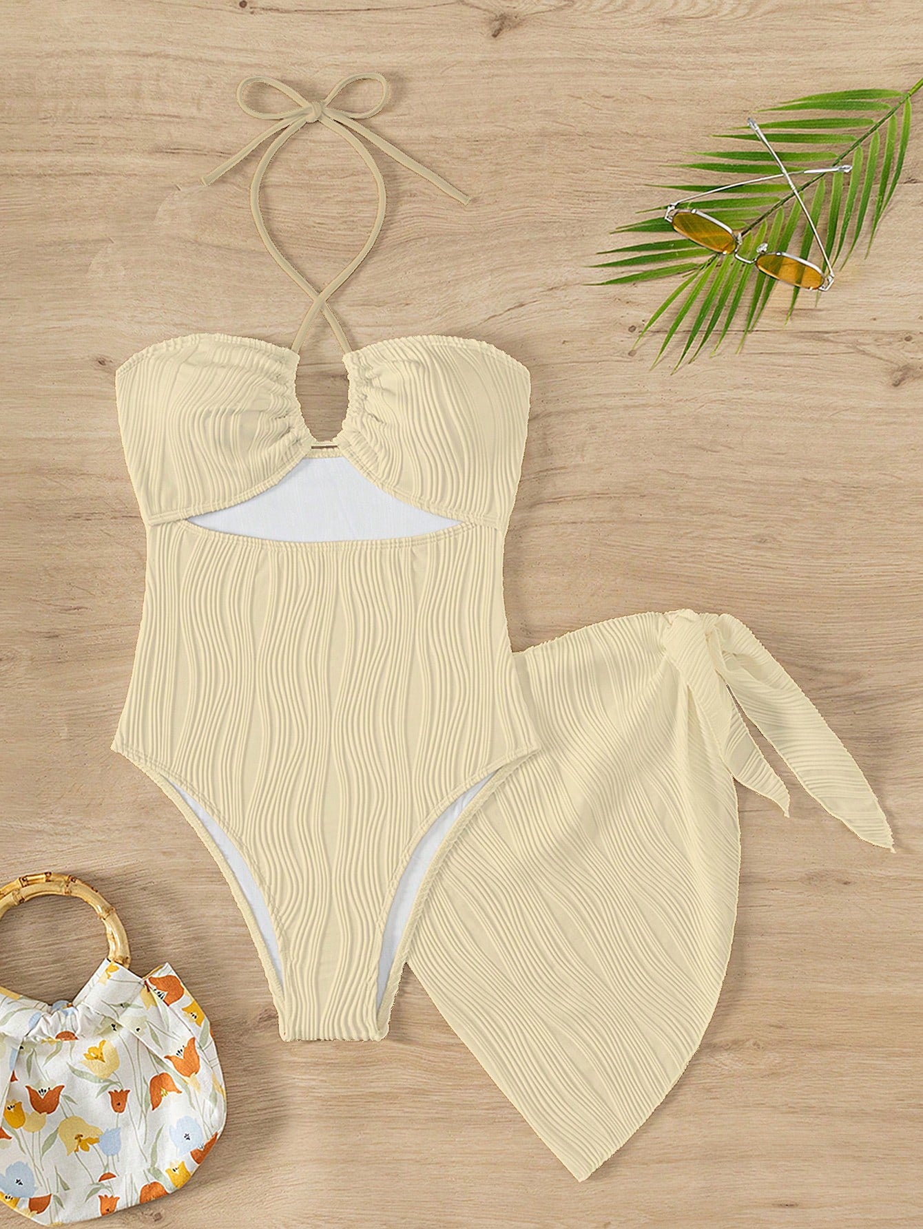 Swim Summer Beach Holiday Solid Color Texture Hollow Out Halter Neck One Piece Swimsuit With Cover-Up 2-Piece Set